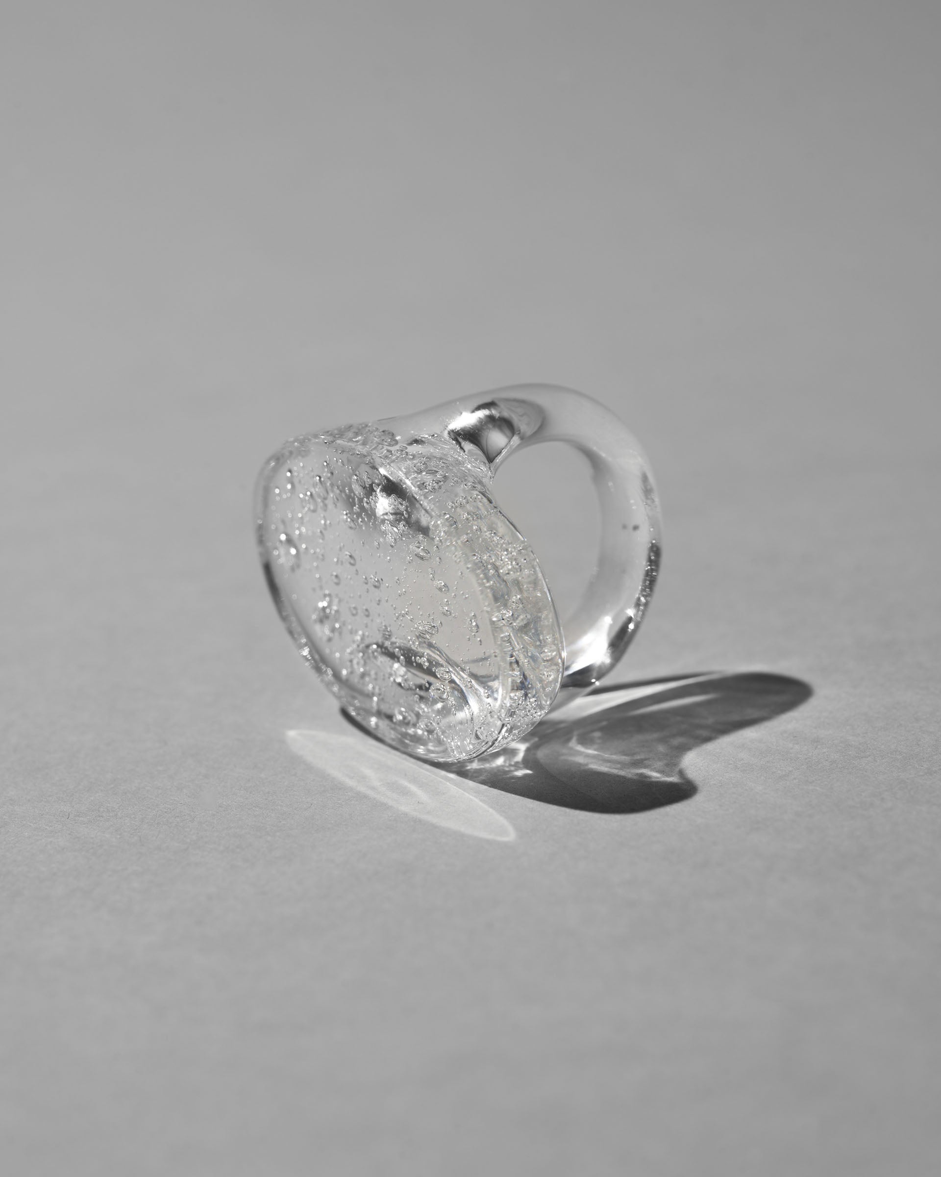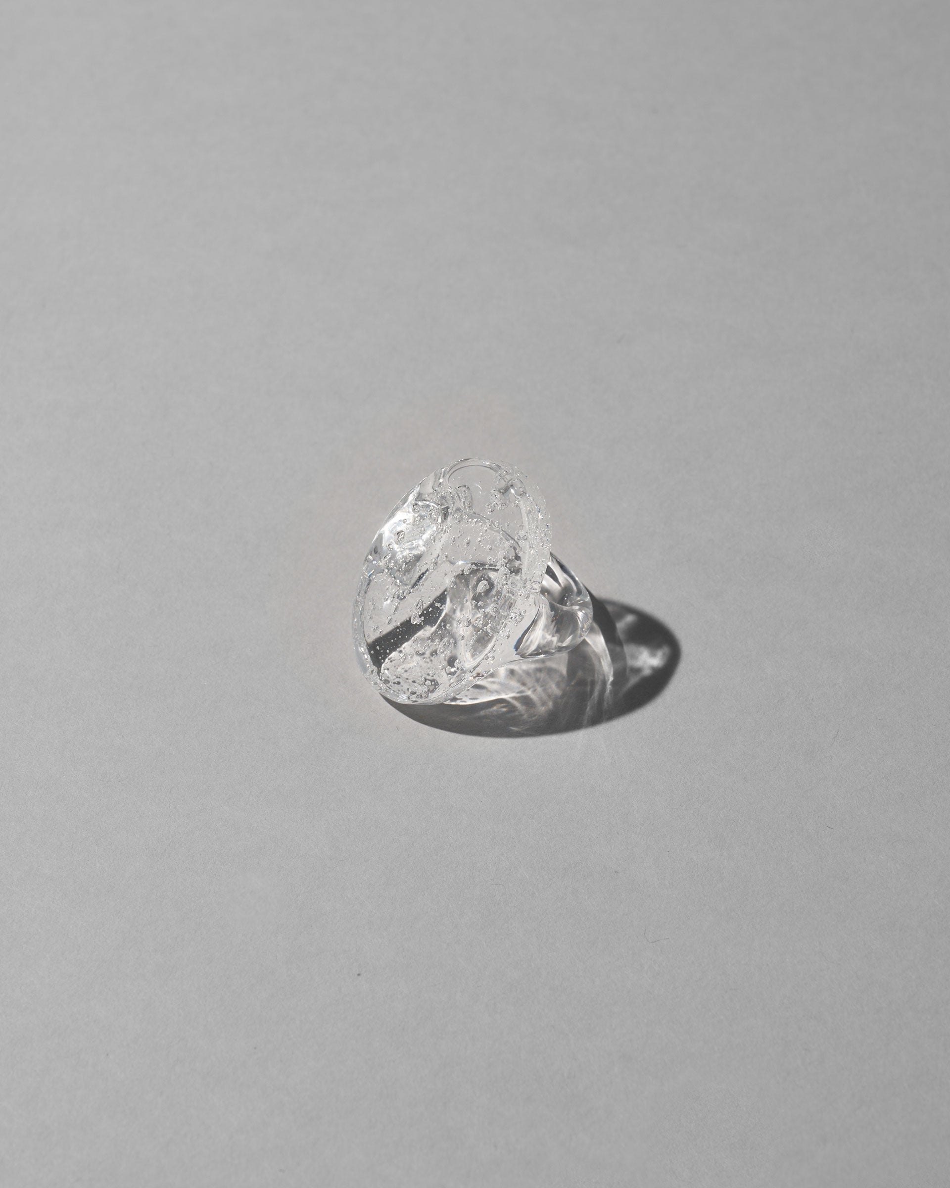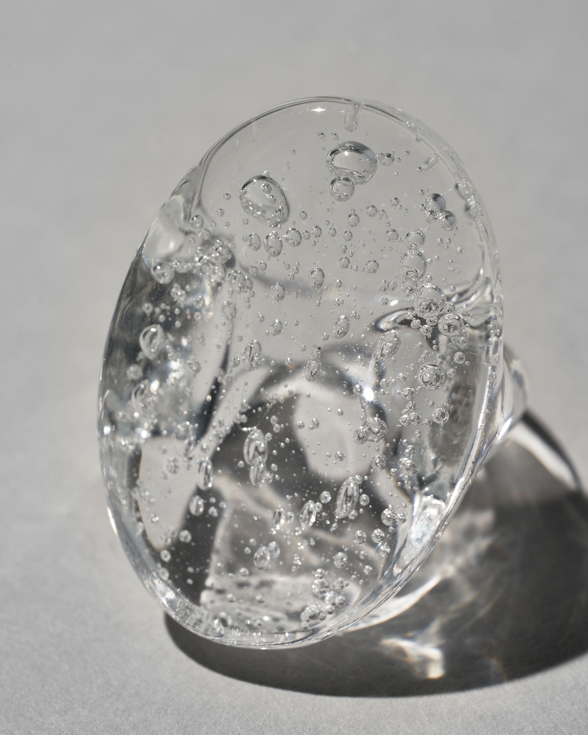 バーナーワークではめずらしい泡入りガラスの曲線が指を包み込む「Ring Oval BUBBLE」。日差しを受けて輝く川面をすくい上げ、そのままリングにしたかのような透明感あふれるジュエリーです。
