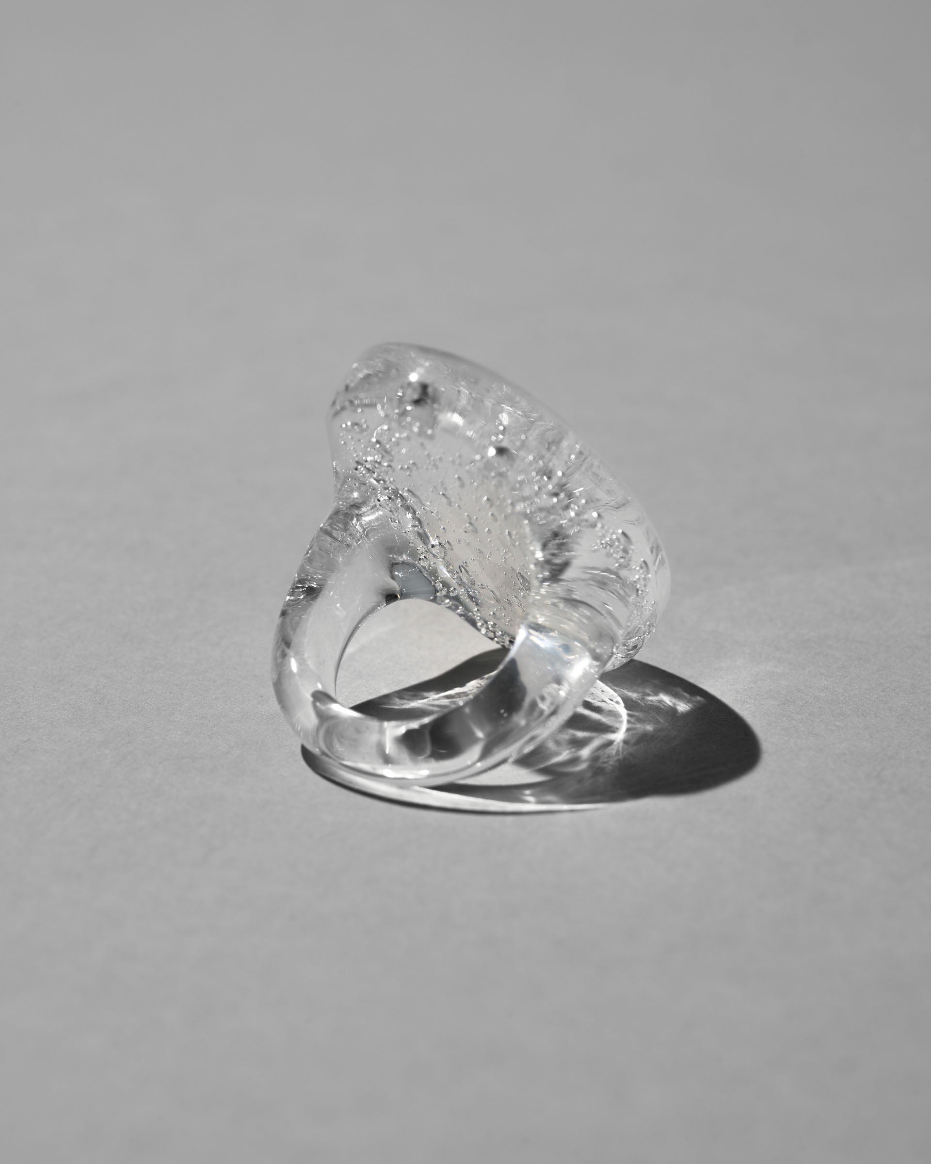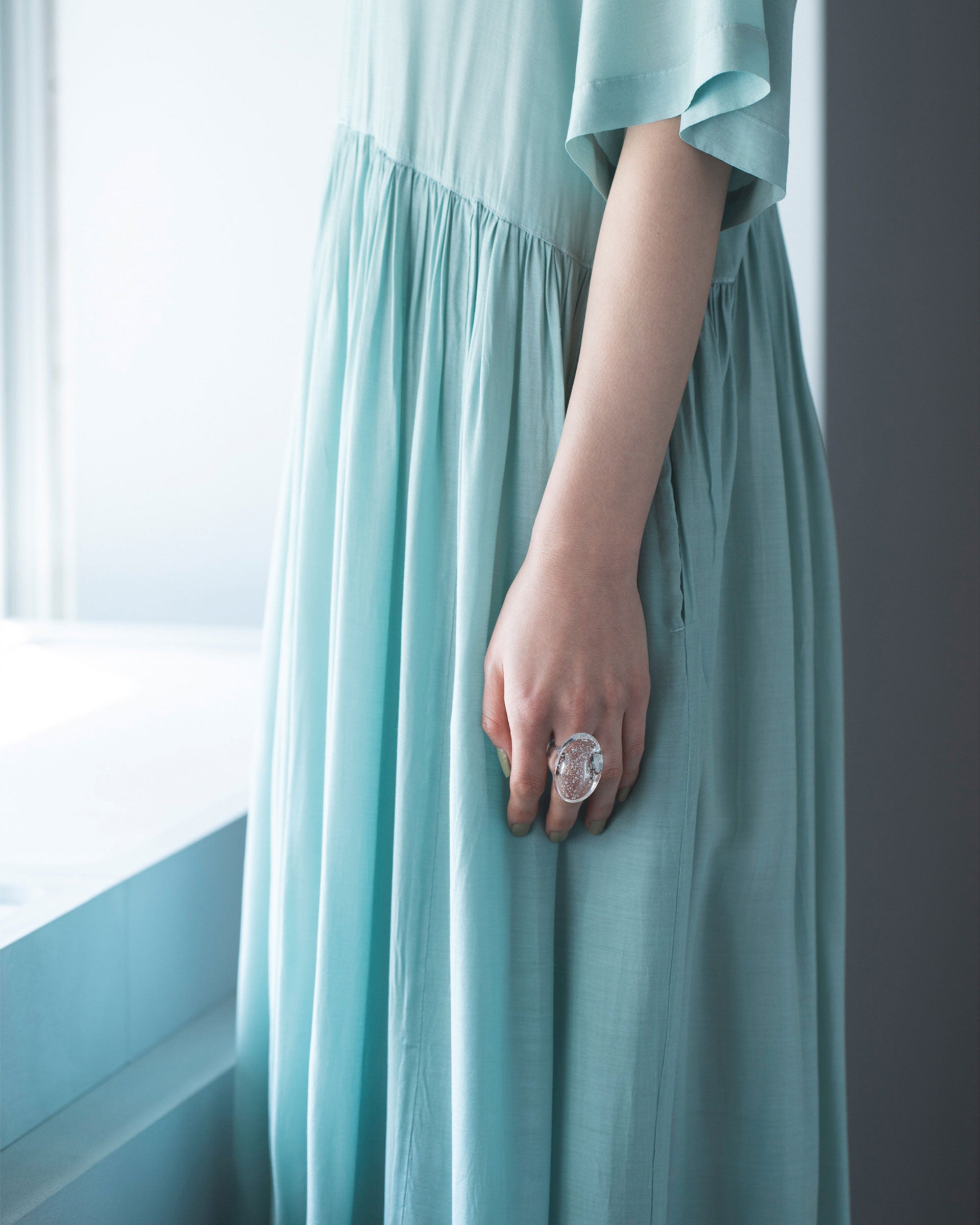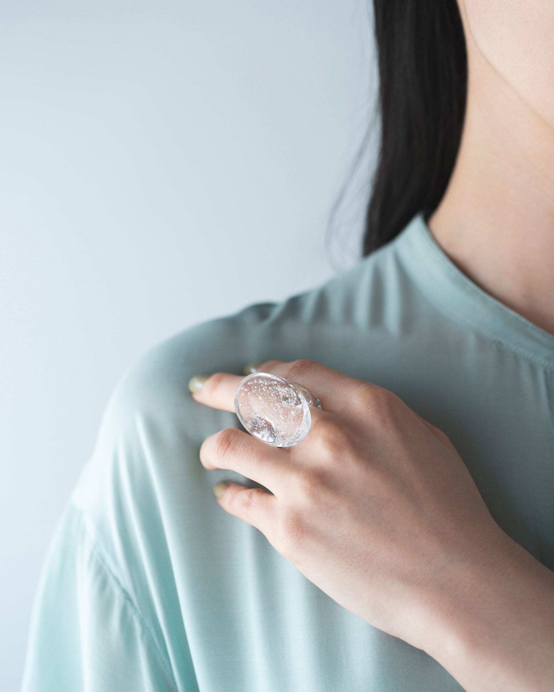 The “HOTOLI” collection draws inspiration from the image of The Aare River in Swizerland trapped in glass. The “Ring Oval Bubble” features a rare lampwork technique of a curved glass piece with bubbles designed to wrap beautifully around the finger. Enveloping the finger, its bold, large oval face creates a smart impression. Reminiscent of the river shining in the summer sun scooped up by the hands, the glass ring offers the transparent expression of the water on the wearer’s hands.