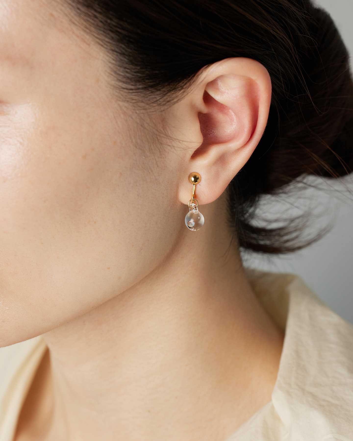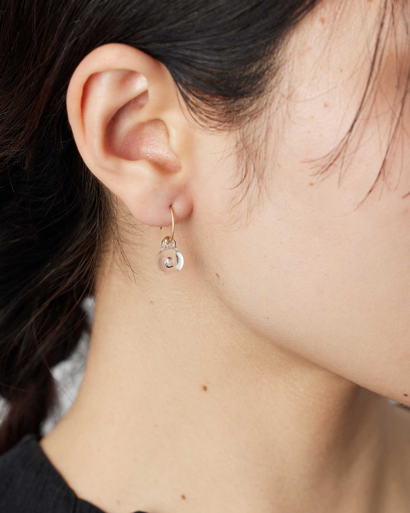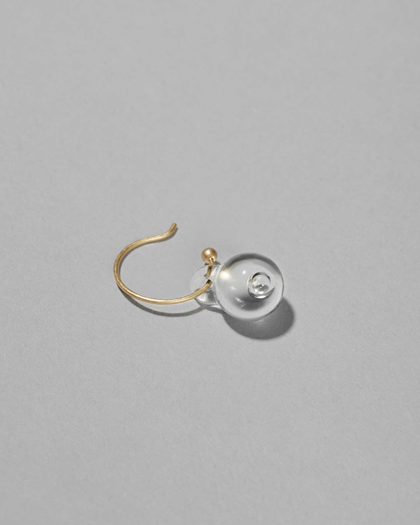 球体のガラスの中に泡をひとつ閉じ込めた水滴のようなミニサイズのピアス。瑞々しく軽やかな浮遊感があります。耳元でささやかに揺れる姿が優雅で可憐な印象を与えます。