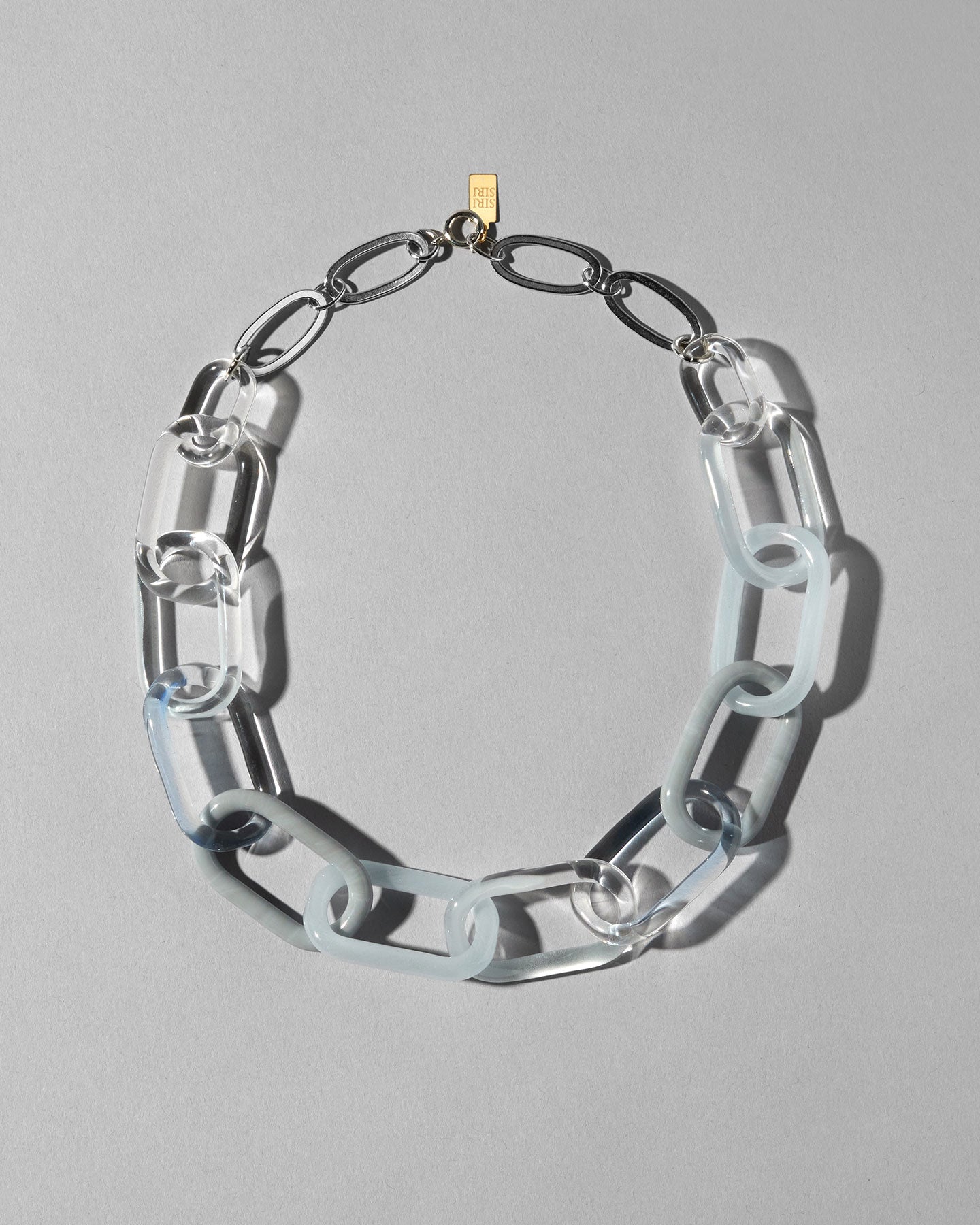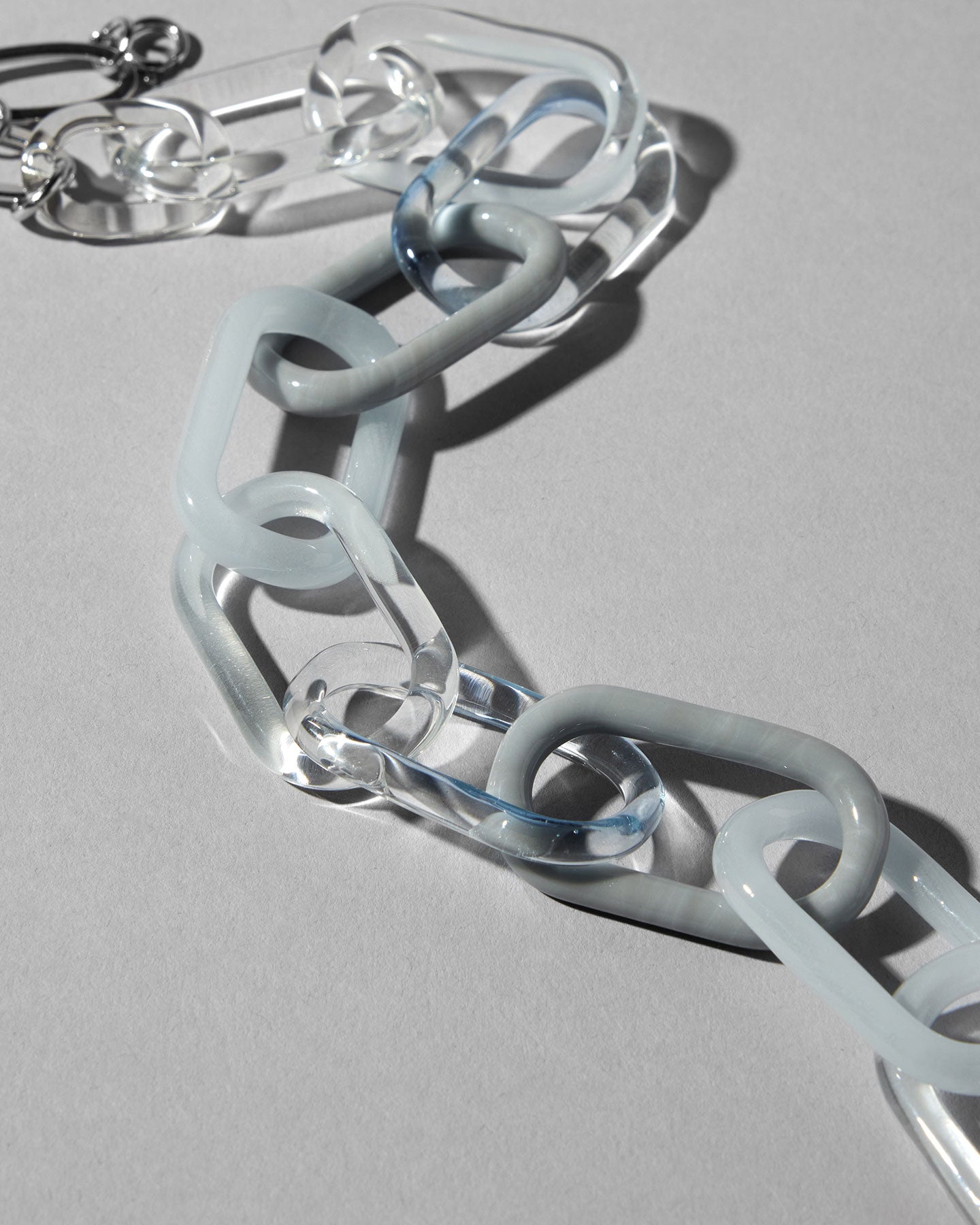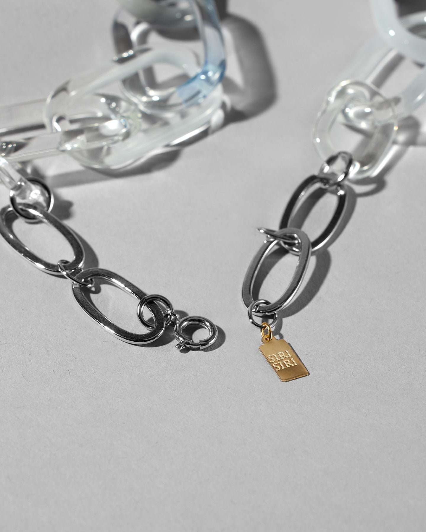 SIRI SIRIのシグネチャー・ピースのひとつ、〈CHAIN NECKLACE〉。クリアガラスと色ガラスを組み合わせ、バーナーワークの職人の手で一つ一つ仕上げられたガラスチェーンは、上品で絶妙なカラーリングがもたらす透明感が魅力です。