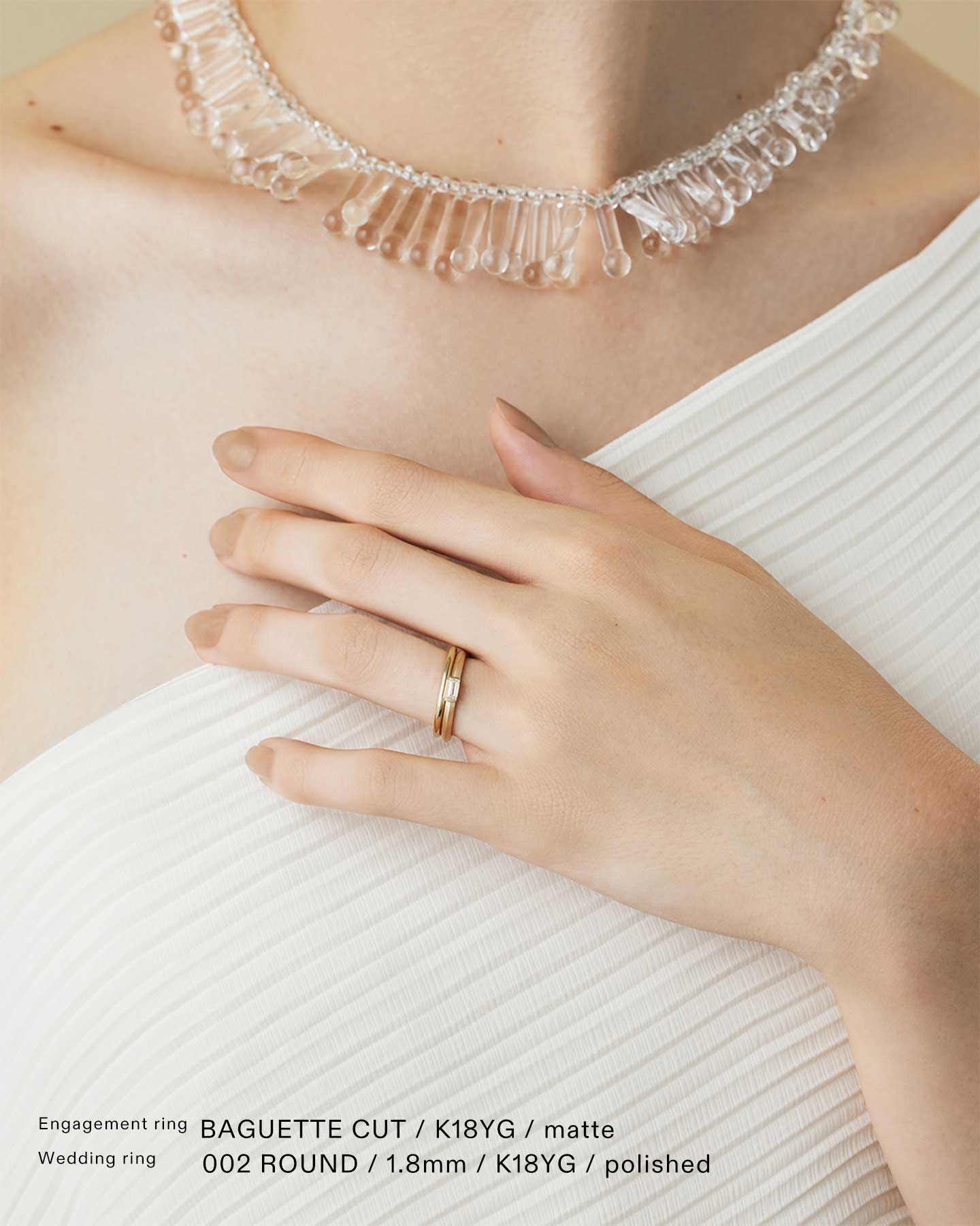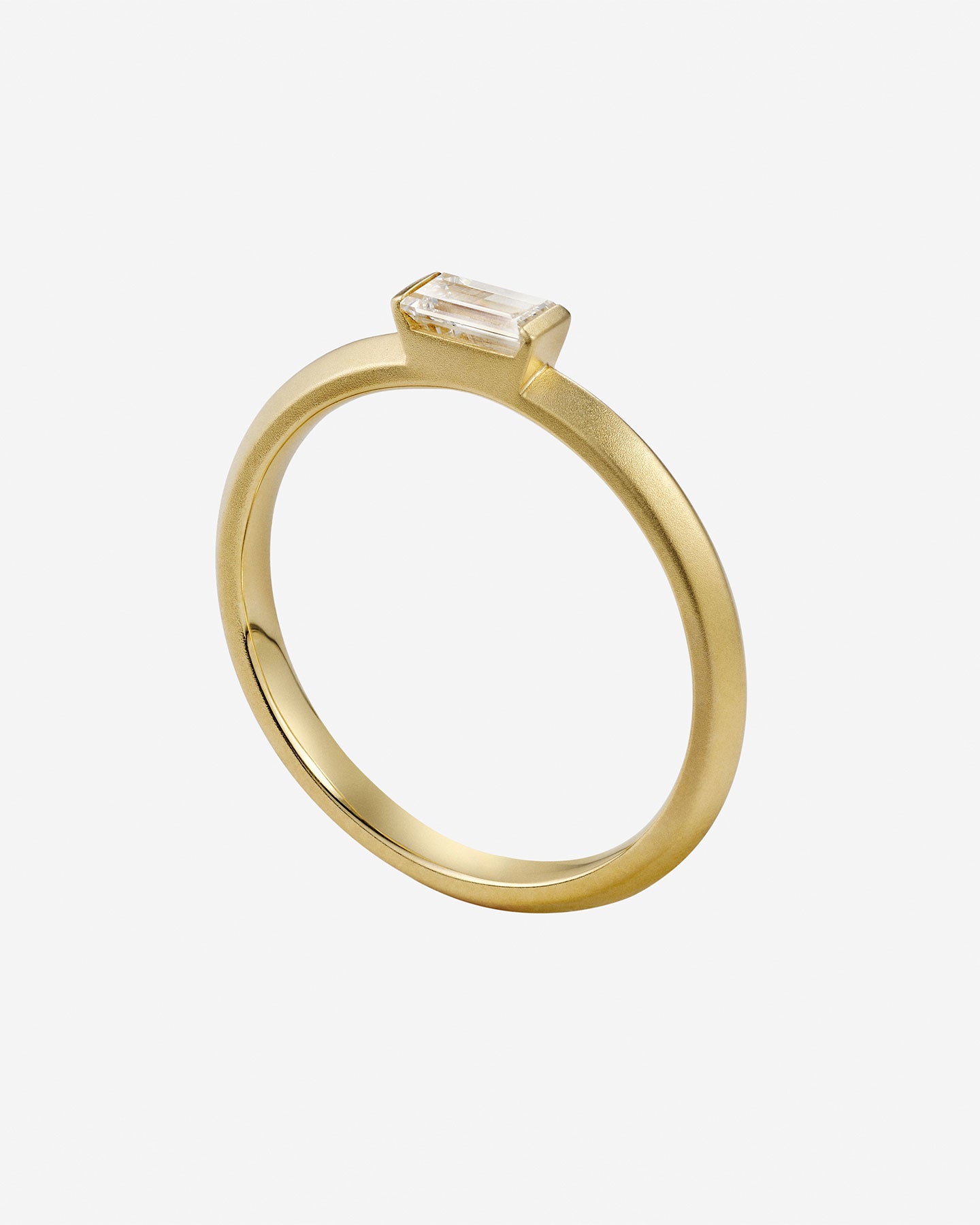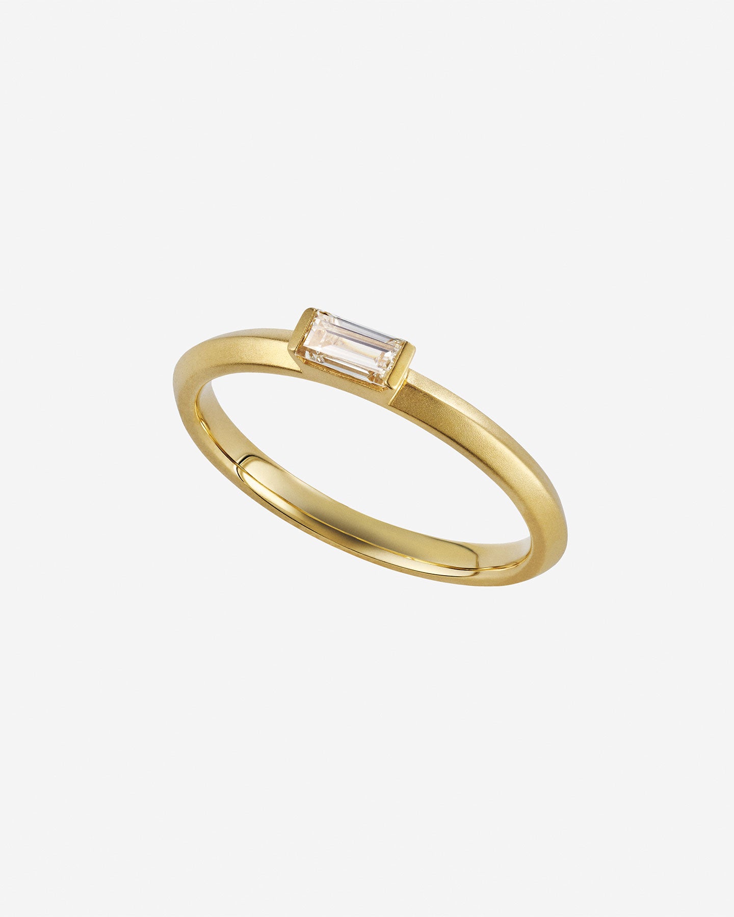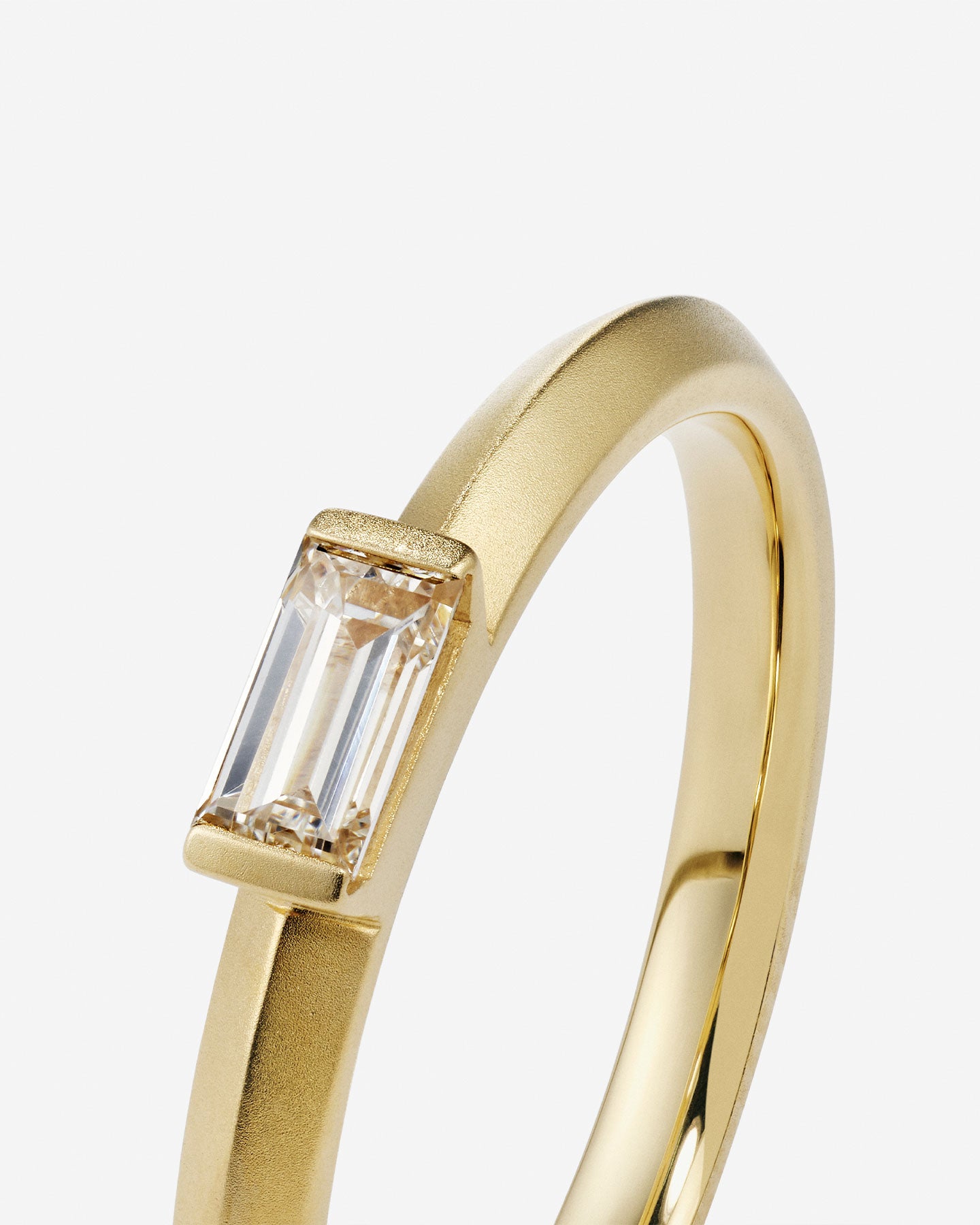 透明感と輝きを纏うバゲットカットのダイヤモンド。天然のイエローダイヤは落ち着いた色合いで気品のある美しさです。シームレスなアームがダイヤモンドをしっかりとホールドし、シャープな印象と指の美しさを両立。普段使いにも華やかさを添えるファッション性の高い婚約指輪です。