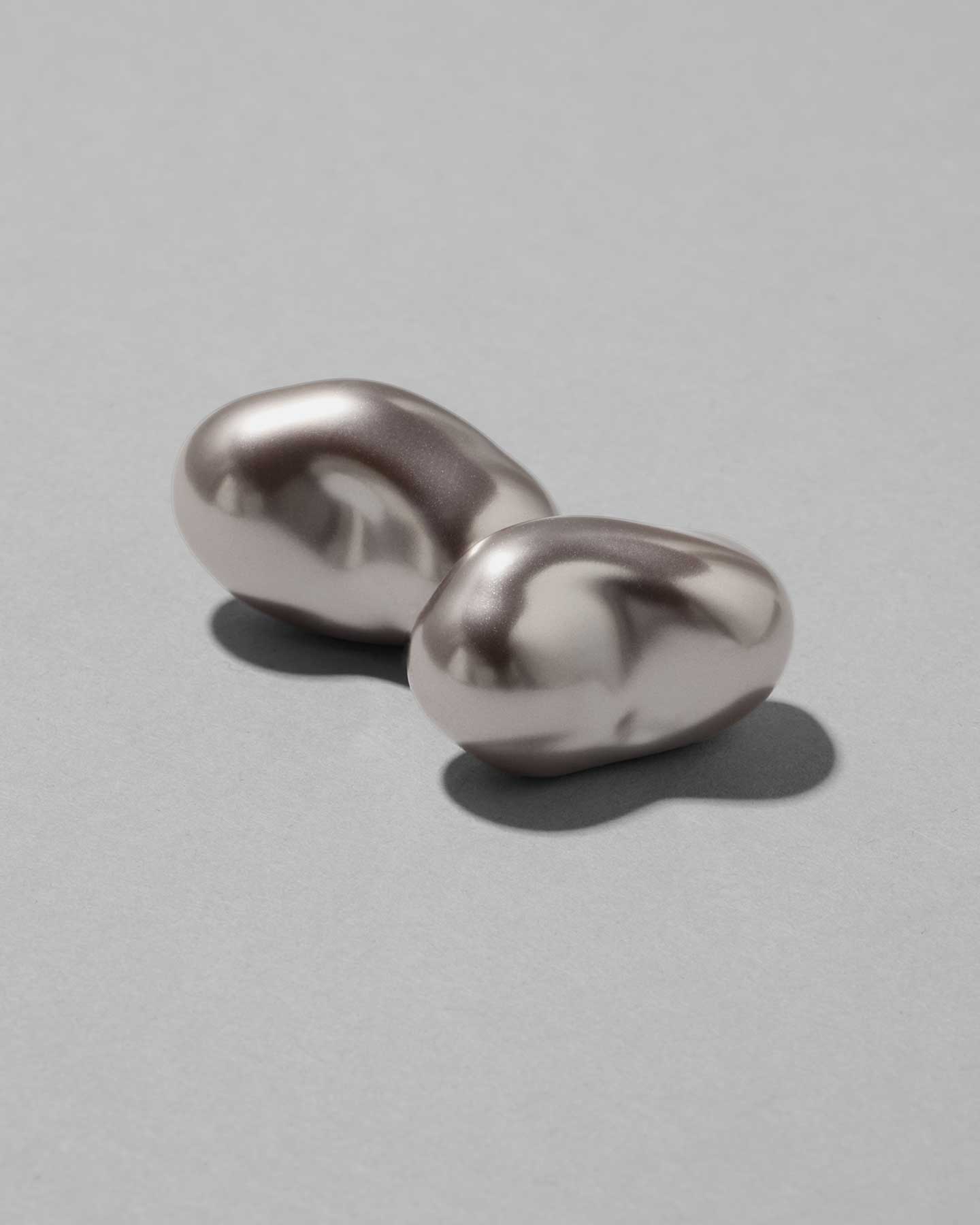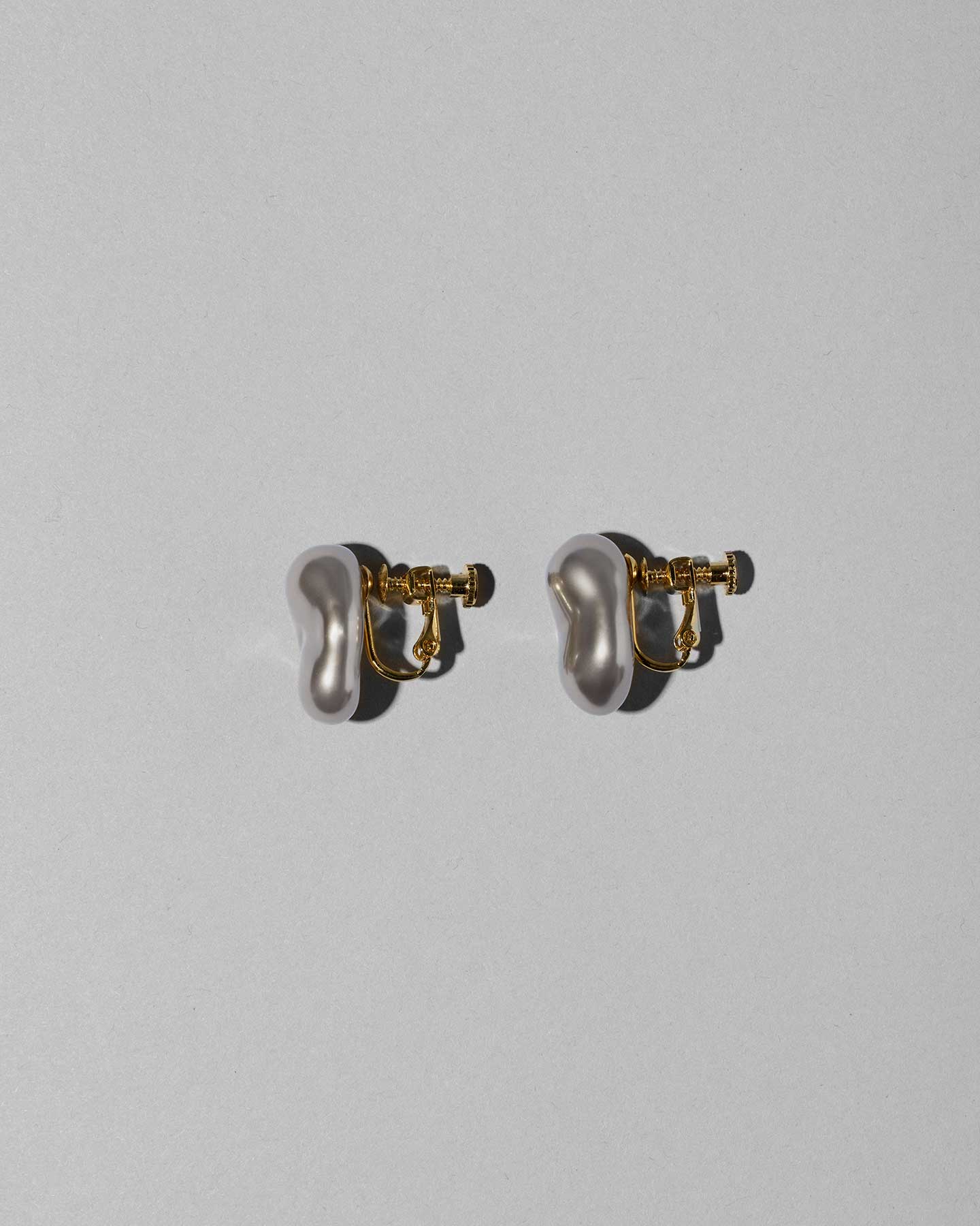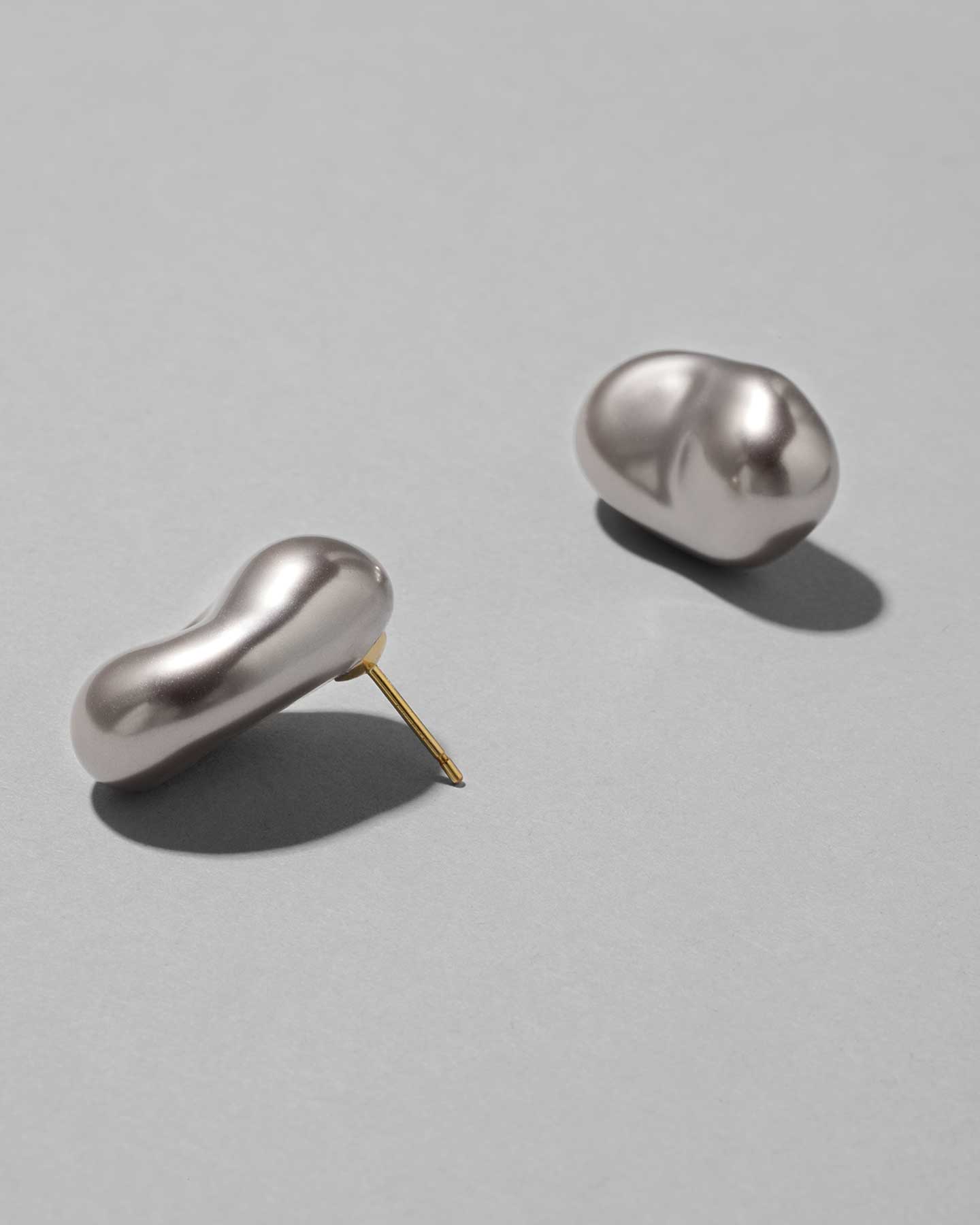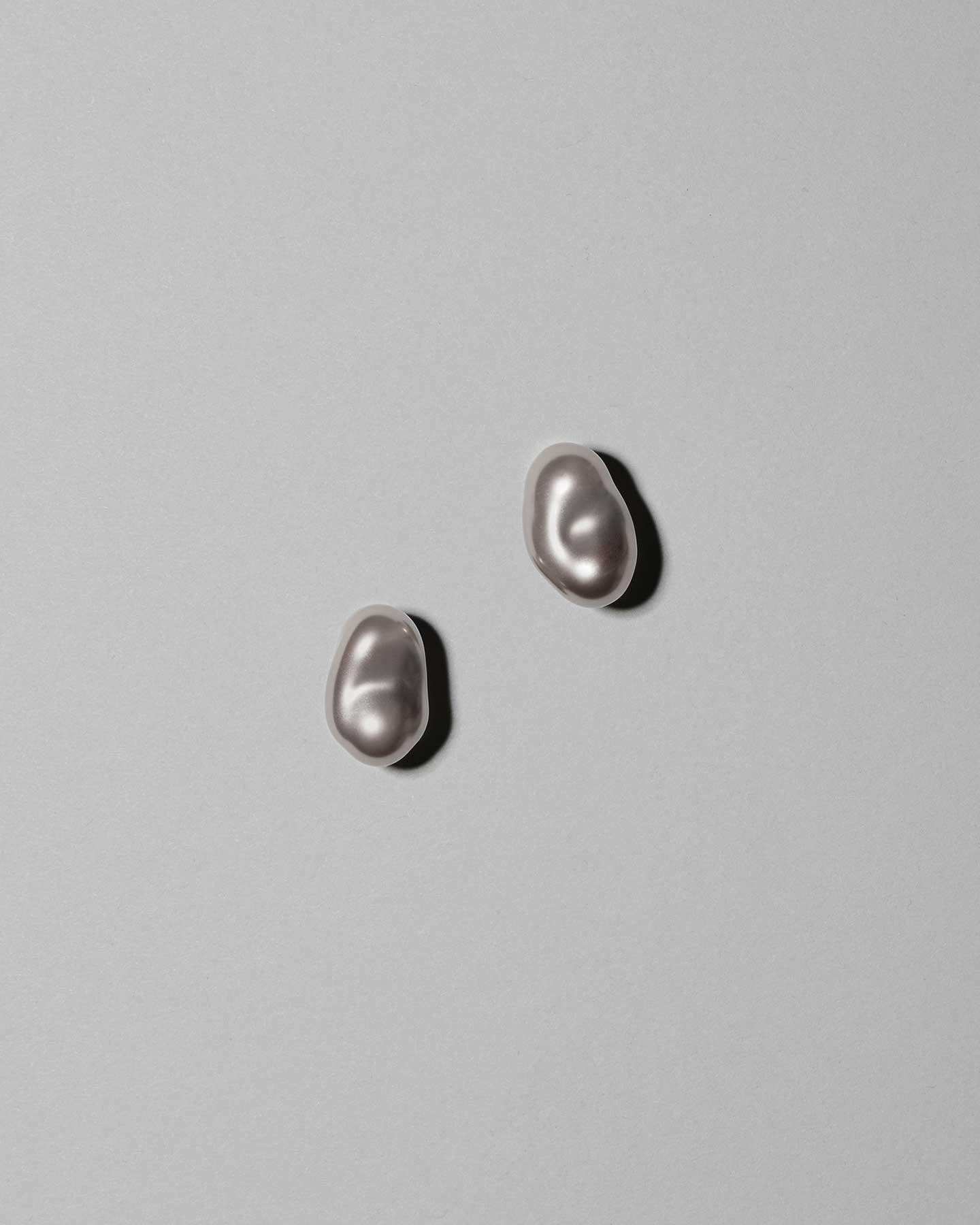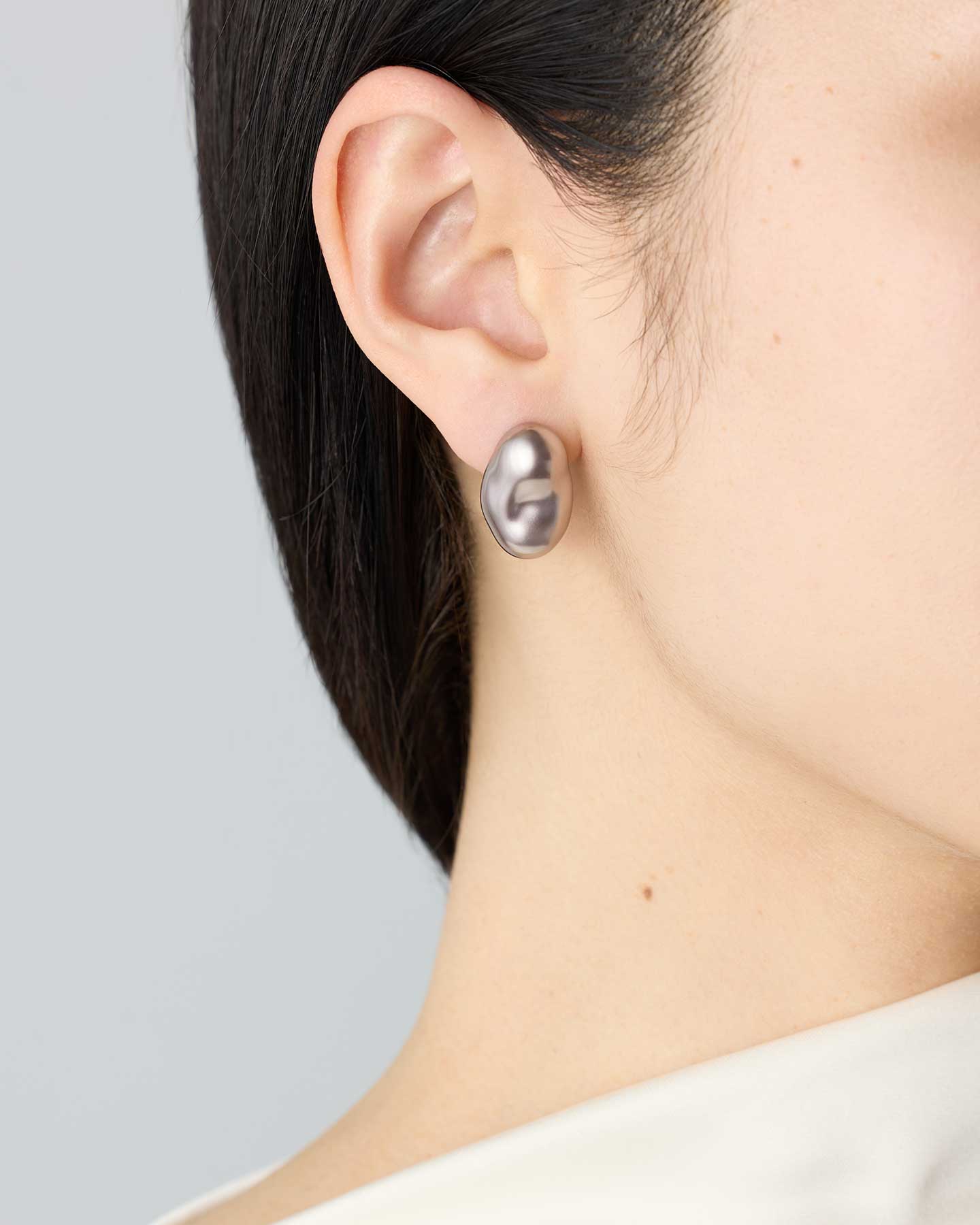 These earrings are made with mysterious gray glass pearls that resemble Tahitian pearls. The large baroque shape fits snugly against the earlobe, and the calm shine gives a sophisticated impression.