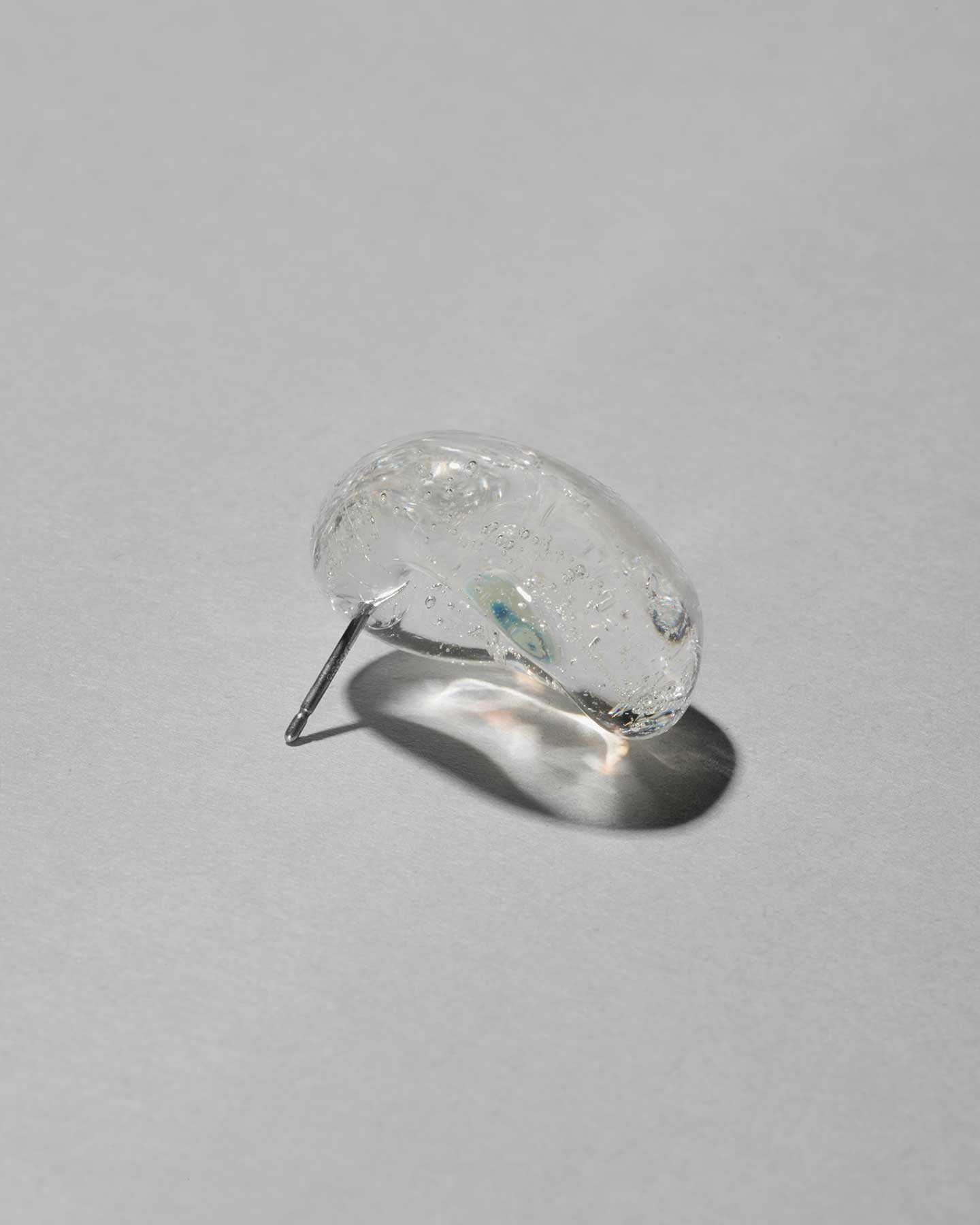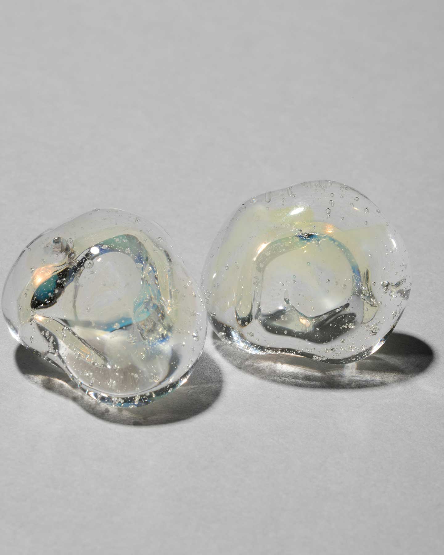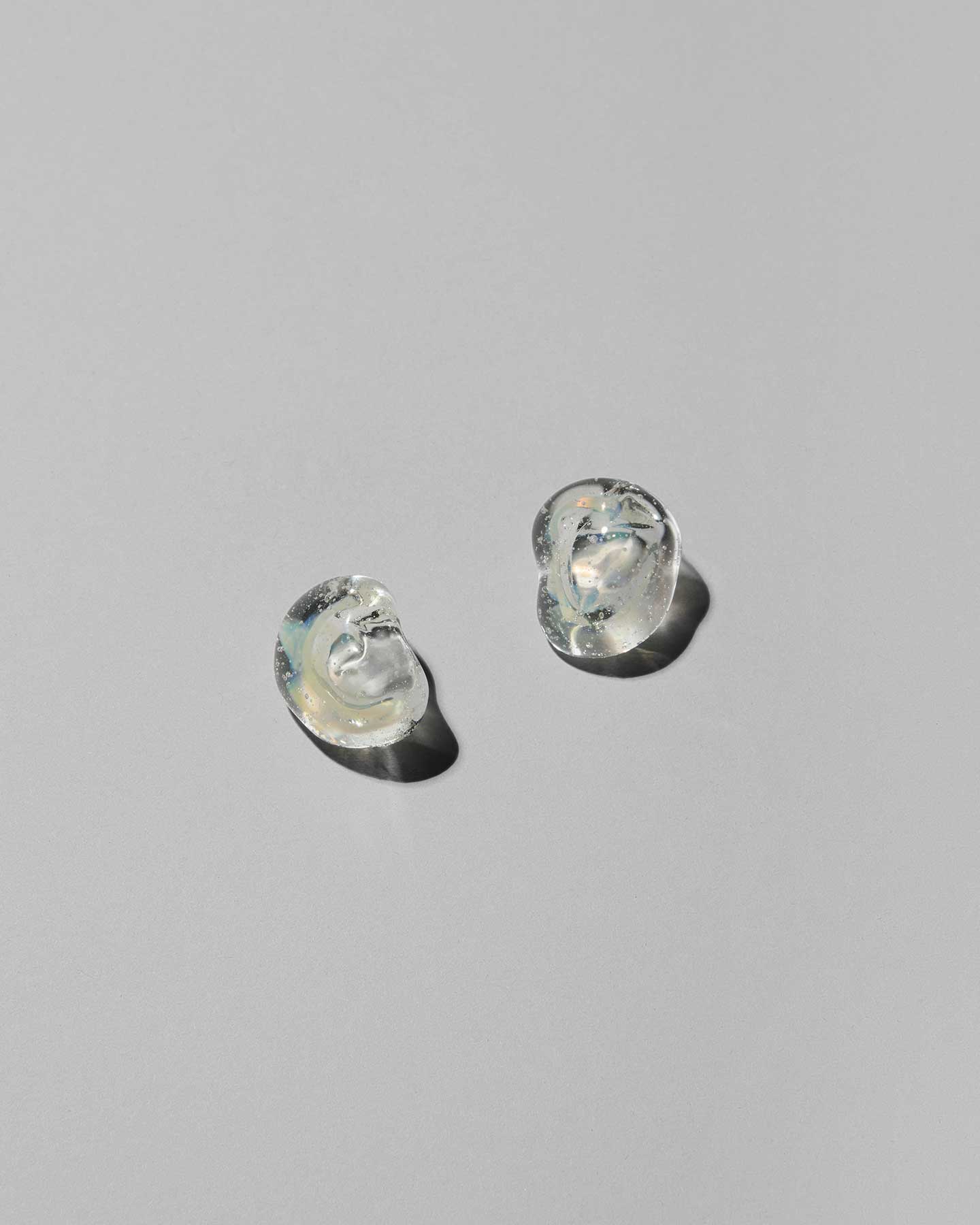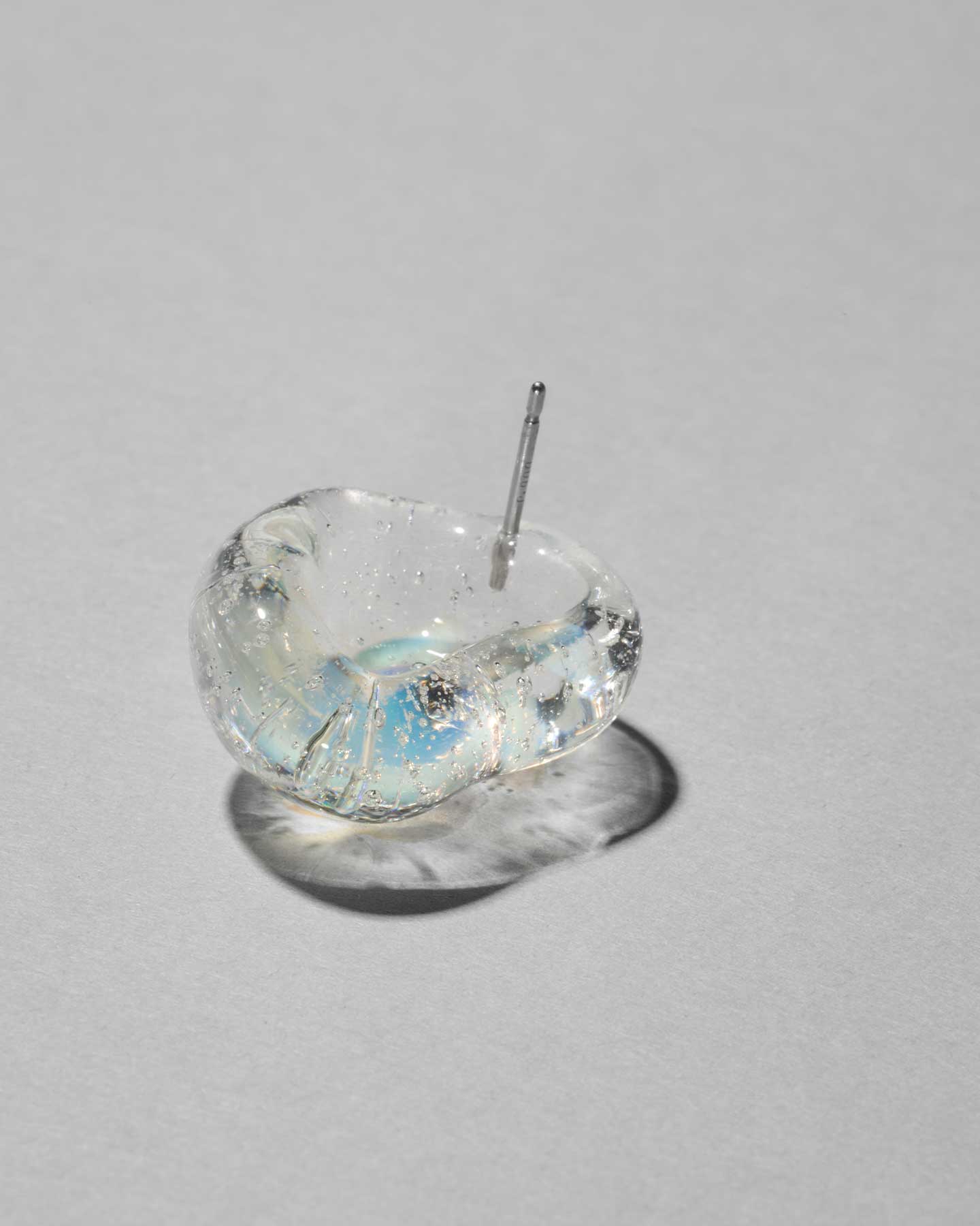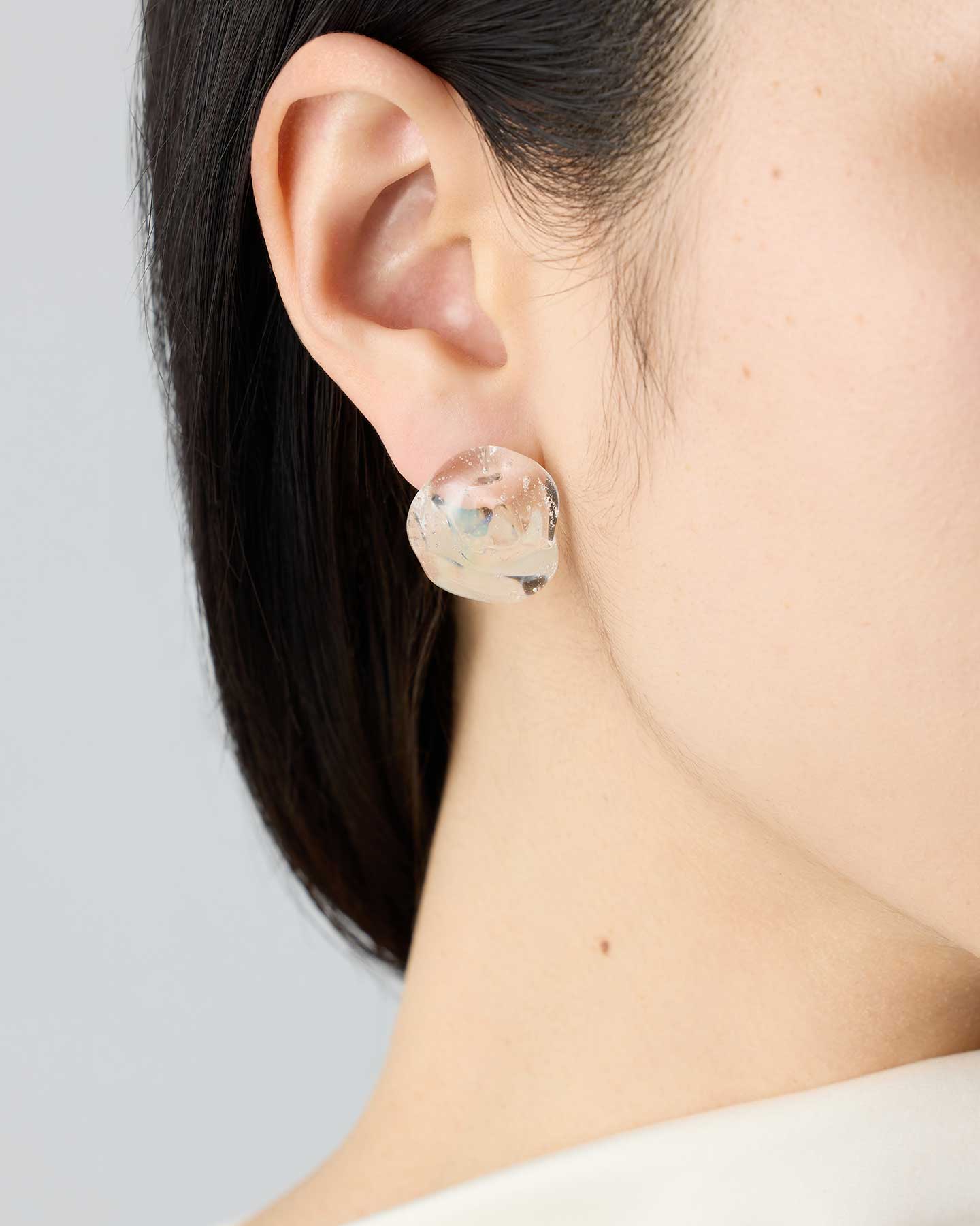 These glass earrings were inspired by the halo of light emitted by the sun or moon wrapped in thin clouds. The clear glass containing bubbles is layered with cream color, and the organic shape gently rests on the ear. This item blends well with the skin and adds a soft glow.