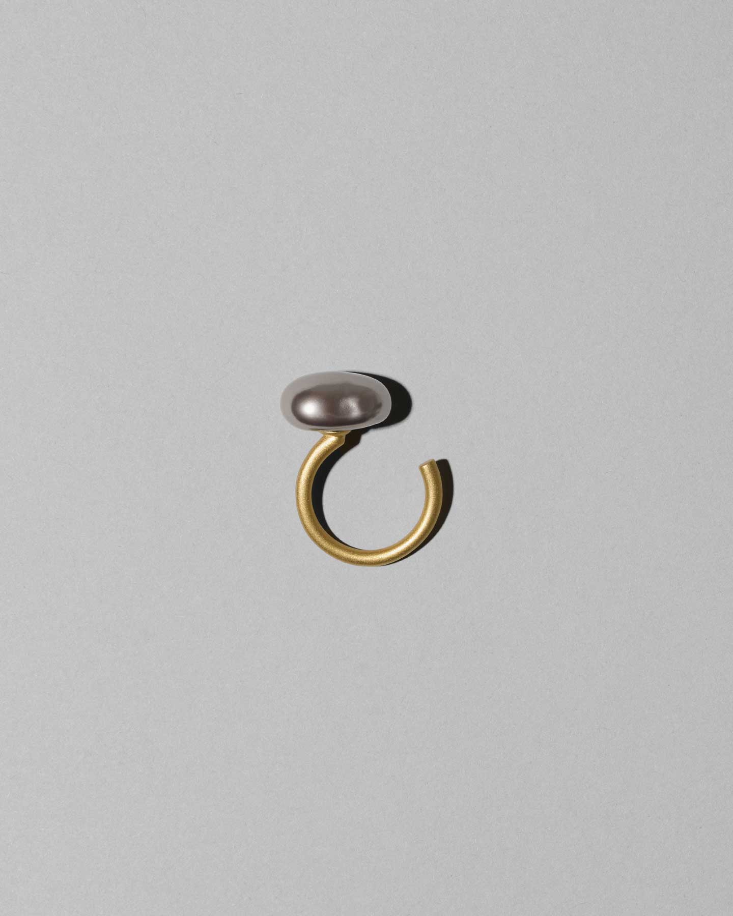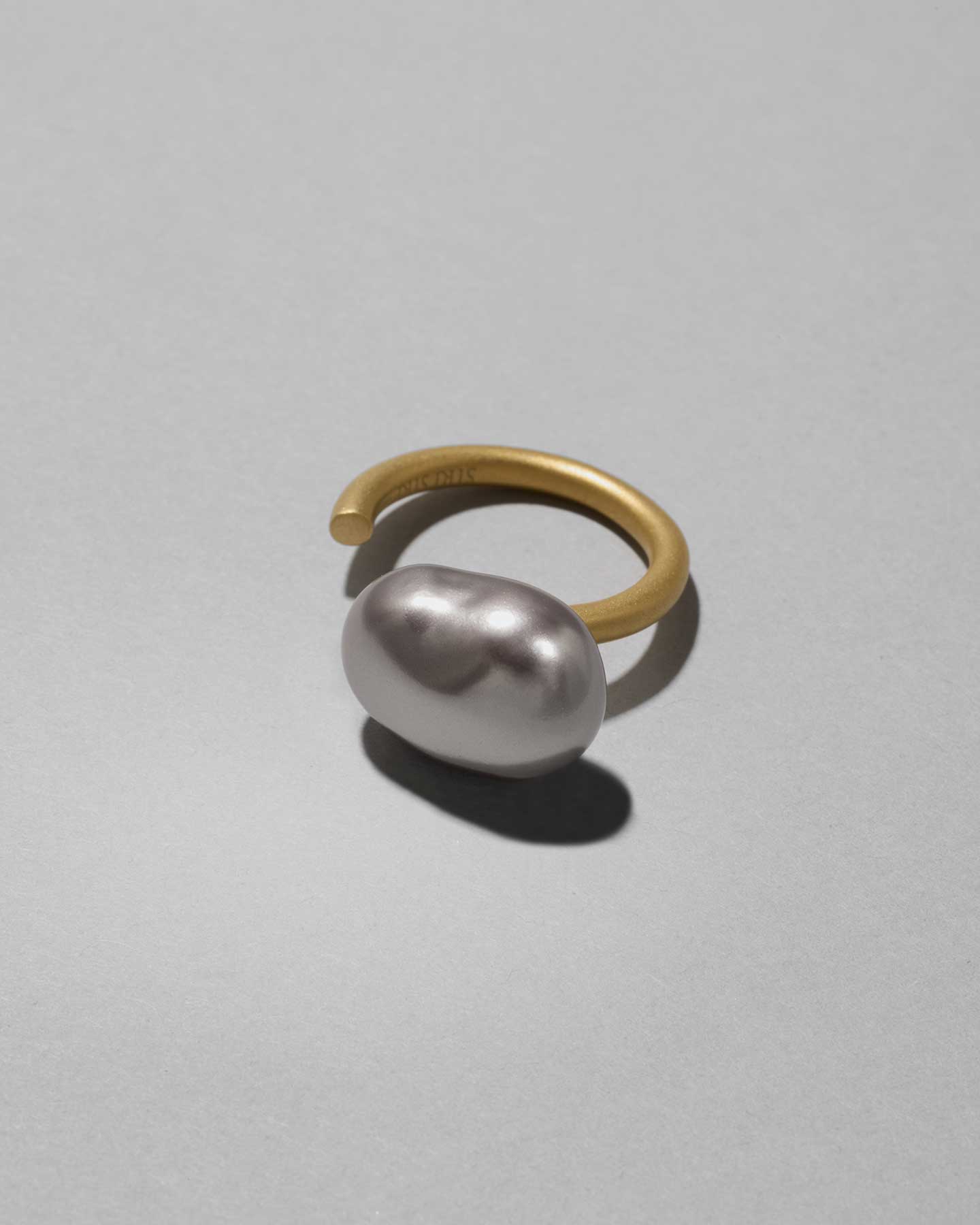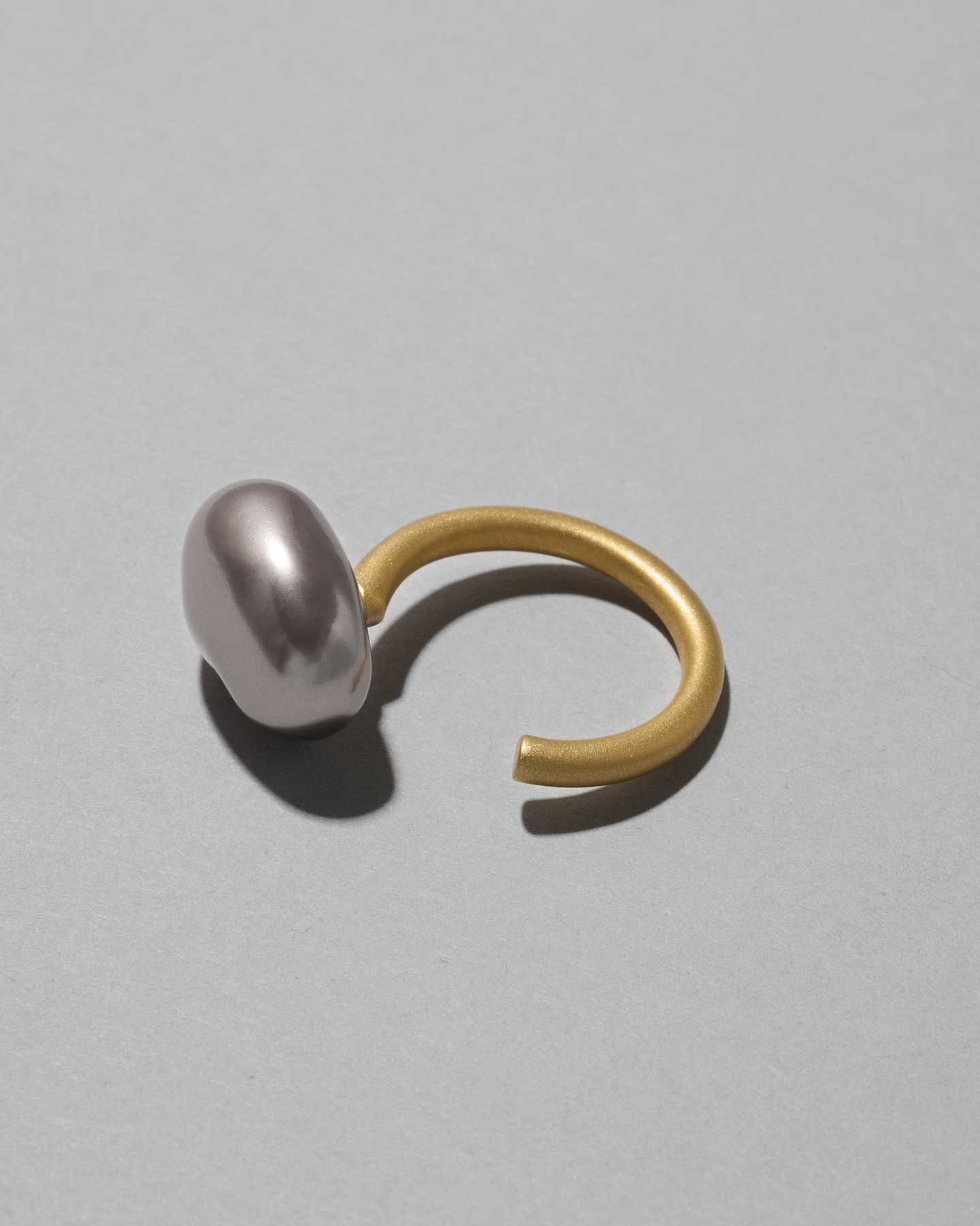 A ring made of mysterious gray glass pearls that resemble Tahitian pearls. The voluminous baroque shape and gold arms add a touch of glamour. You can enjoy it simply by itself, or pair it with a gold bracelet or earrings for a coordinated and elegant look.