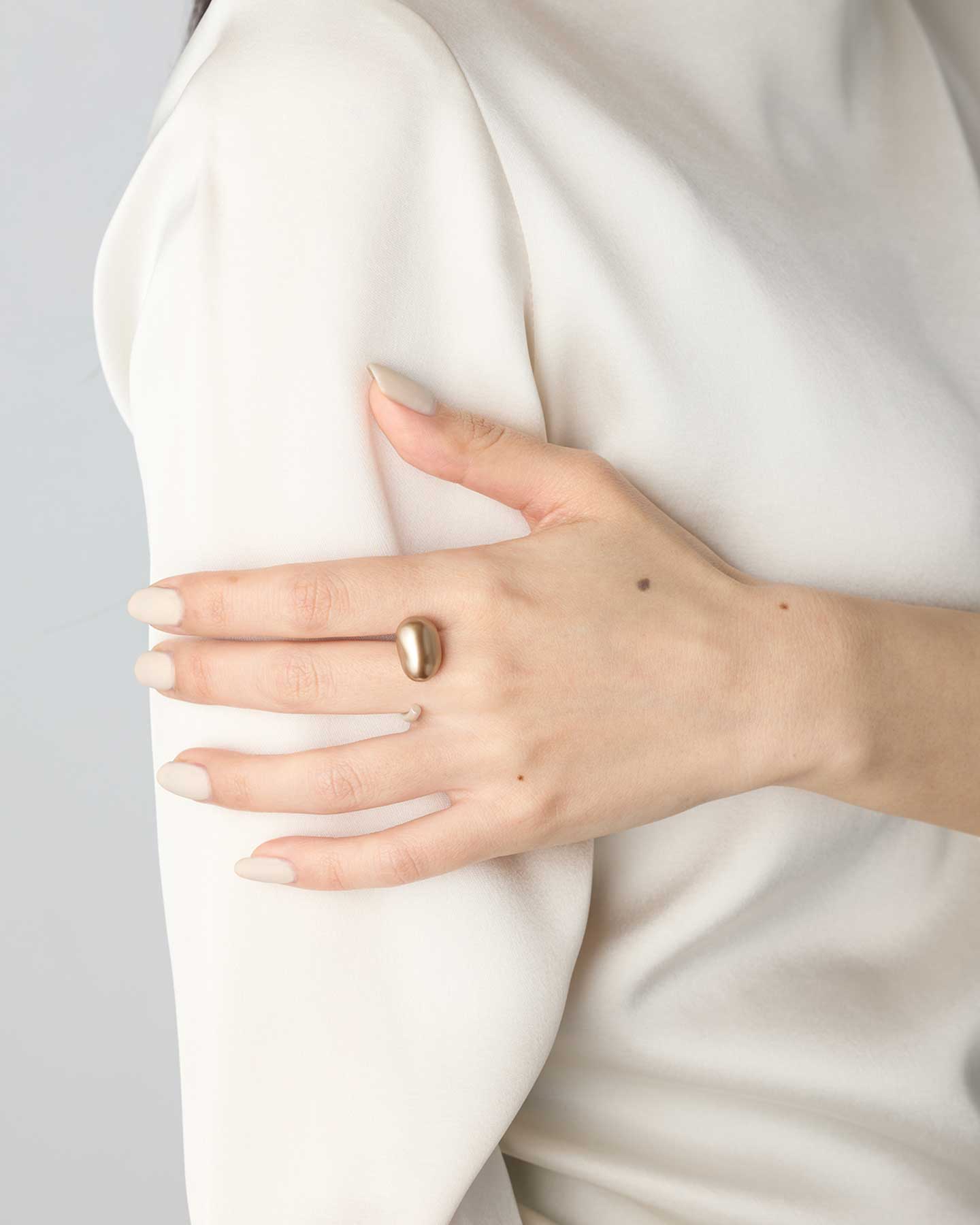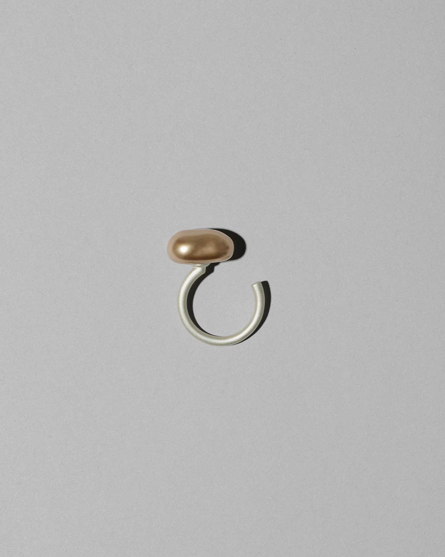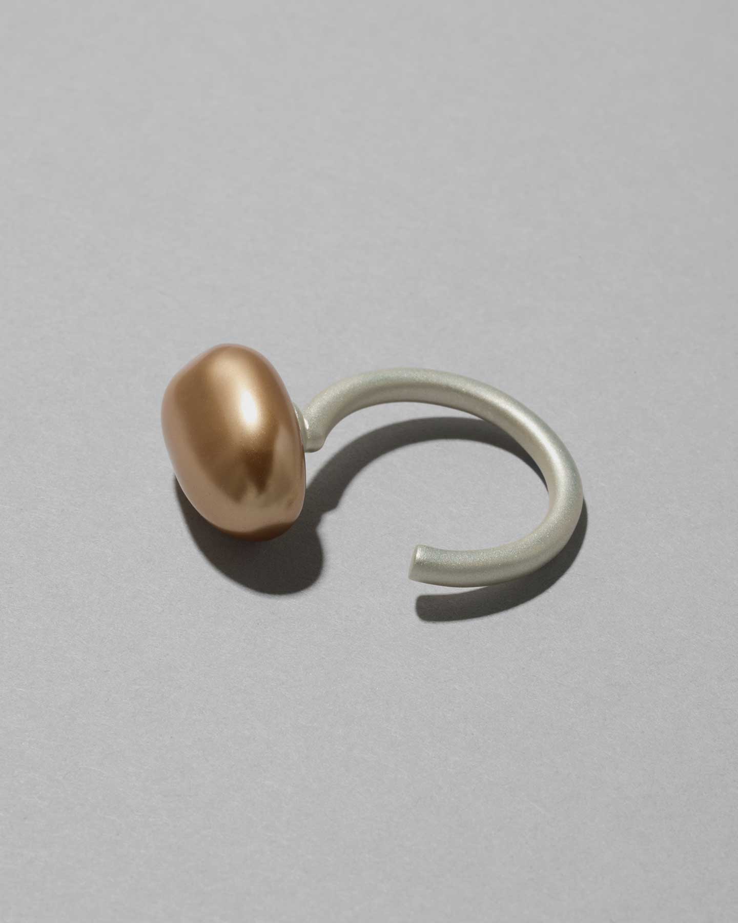 A glass pearl ring in a warm sun-like color. The silver arm creates a sophisticated contrast with the voluminous baroque shape. We also recommend mixing it with gold and silver jewelry. The jewelry will stand out when paired with monochrome or neutral colored clothing.
