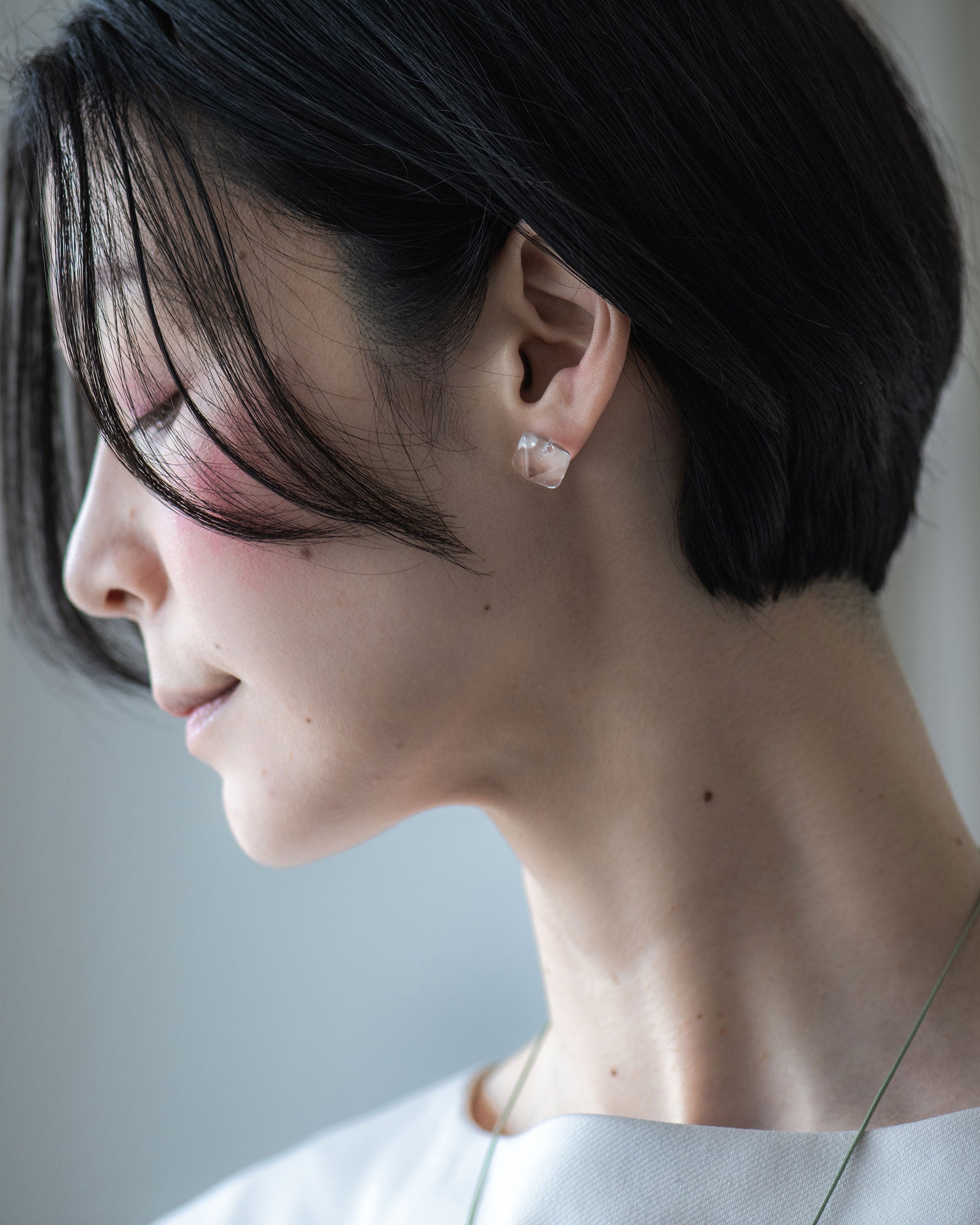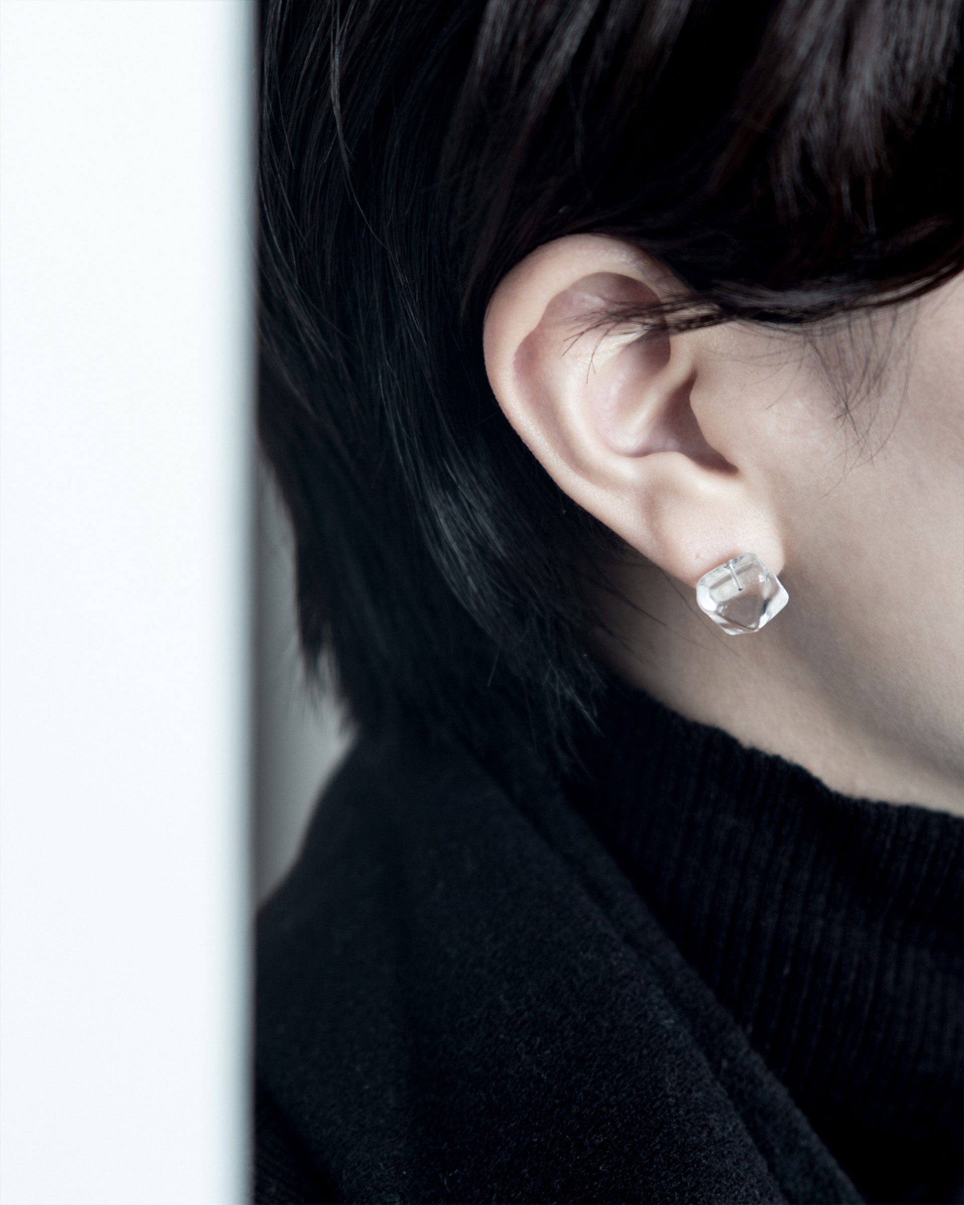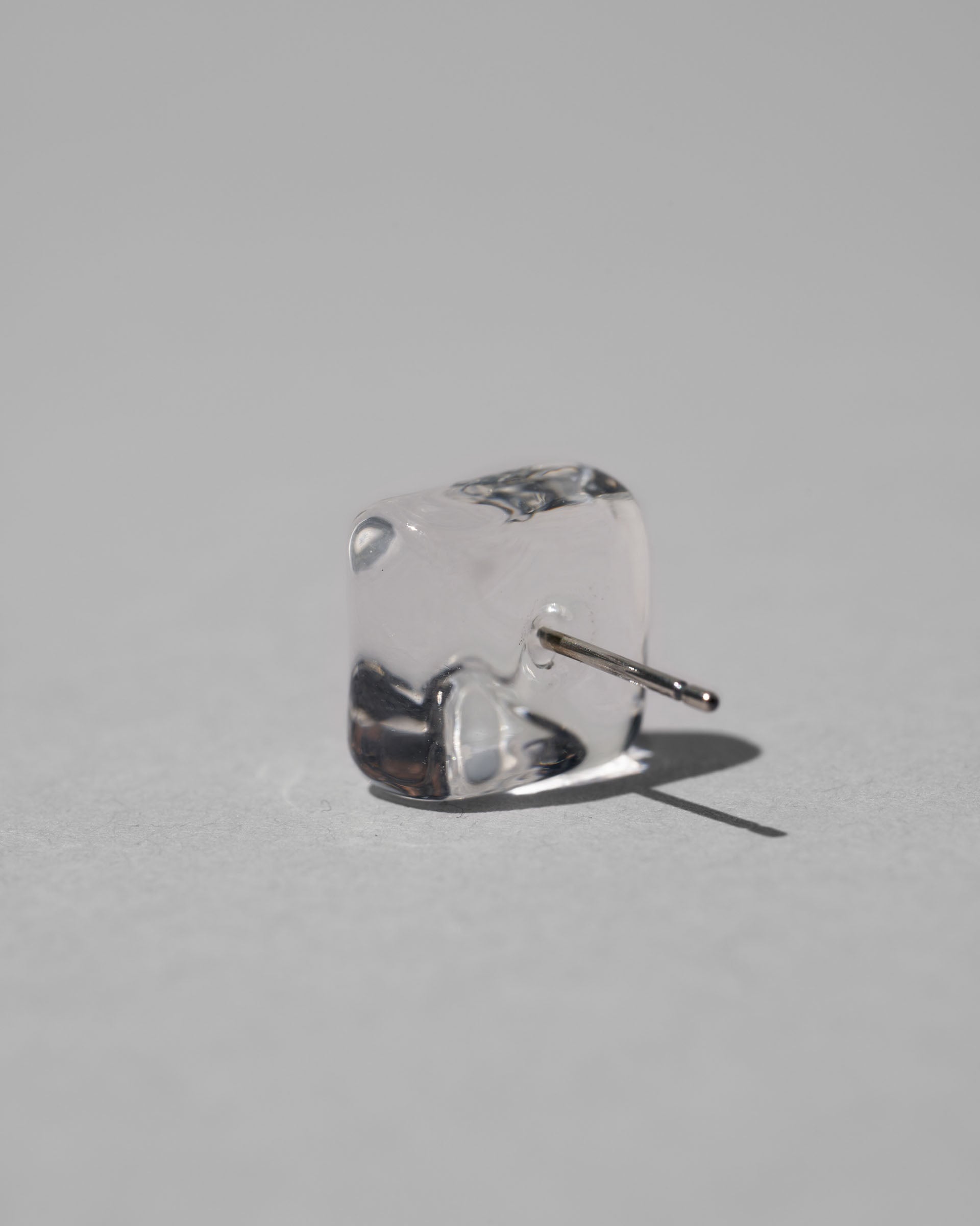 A single earring that expresses hard studs with glass. Its ice-like appearance gives you a feeling of edgy hardness and fragility that seems to melt when you touch it.