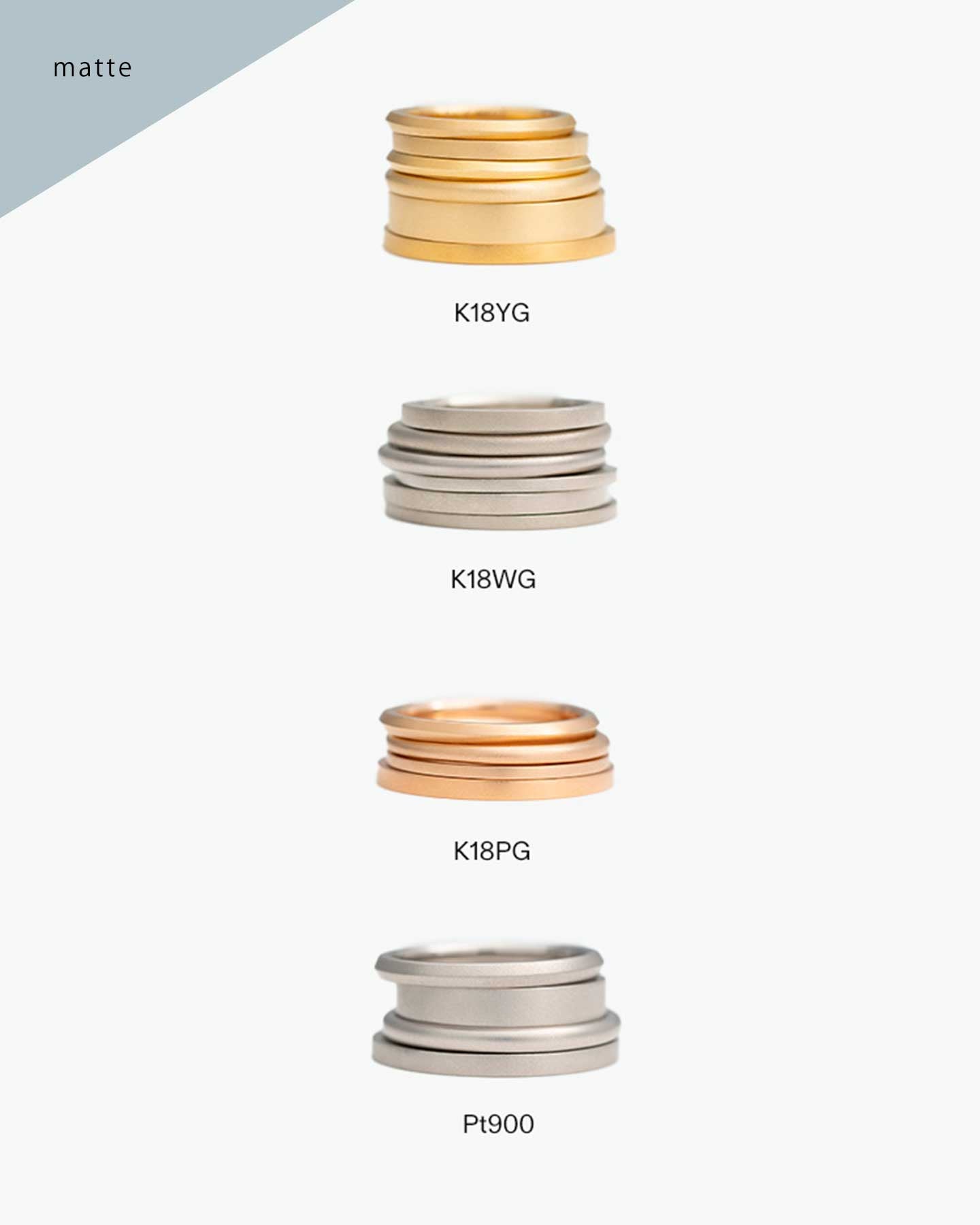 18KYG (yellow gold), 18KWG (white gold), 18KPG (pink gold), Pt900 (platinum)