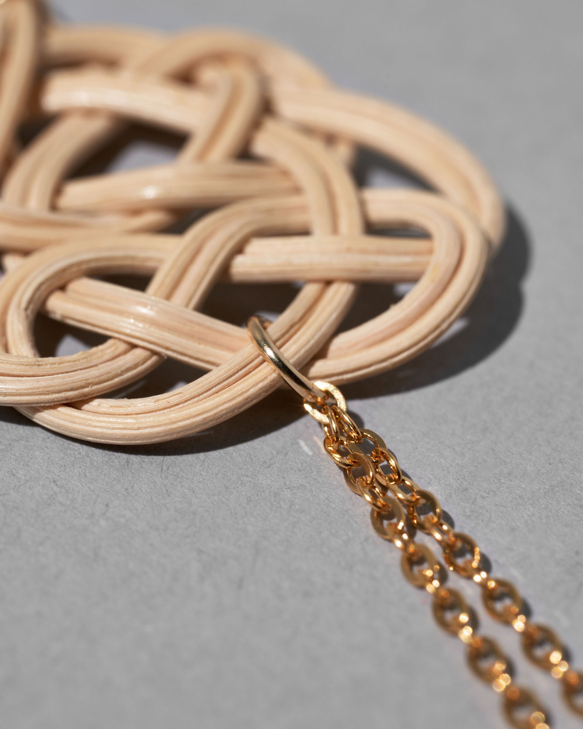 左右の輪が互いに結び合い、両端を引っ張るとさらに強く結ばれることから末永い付き合いという意味を持ち、慶事で用いられる「あわじ結び」をモチーフにしたピアス。籐工芸職人が籐を1本1本磨き上げ、ジュエリーへと昇華しています。