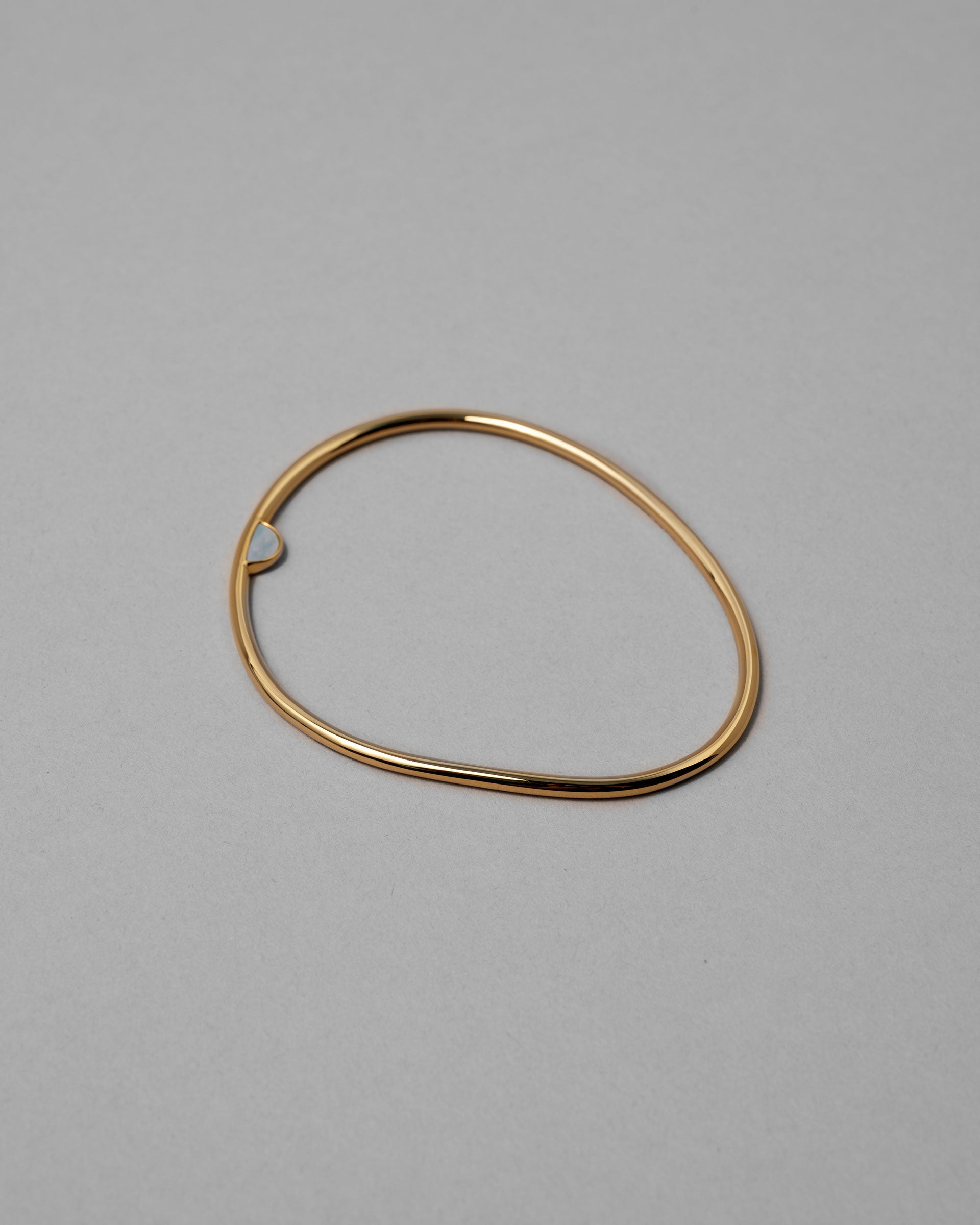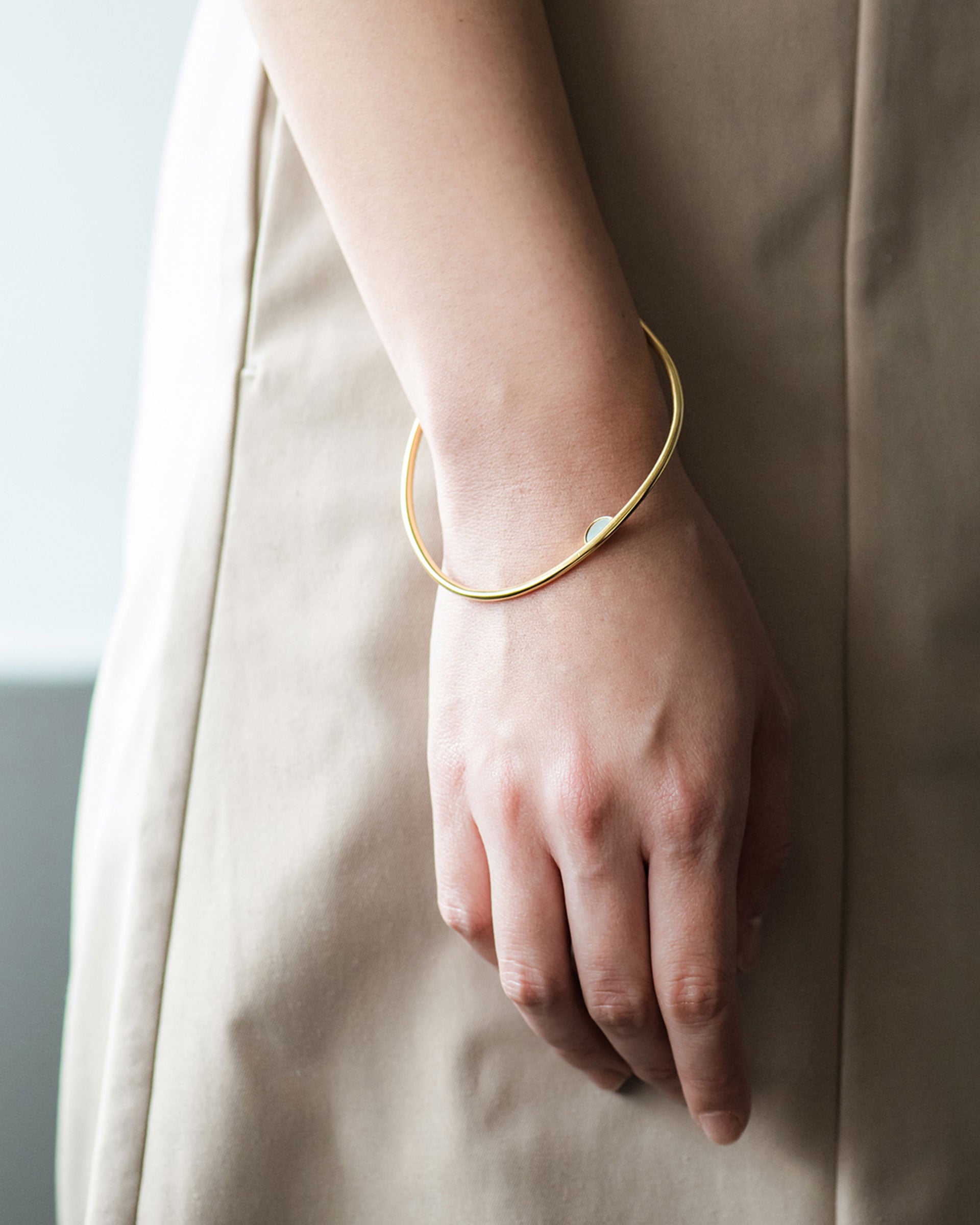 Introducing refreshingly clear blue grey pieces from the popular RADEN series. Custom made by a makie (lacquerware) artist to suit the SIRI SIRI aesthetic, the blue grey raden and simple design employing mother-of-pearl inspire a fresh and graceful impression. Bangle Hindwing is endowed with an organic and contemporary design with its curves reminiscent of an architectural structure. Its raden detailing sits gently inwards on the arm, giving a soft impression of a golden hoop lightly enveloping the arm.