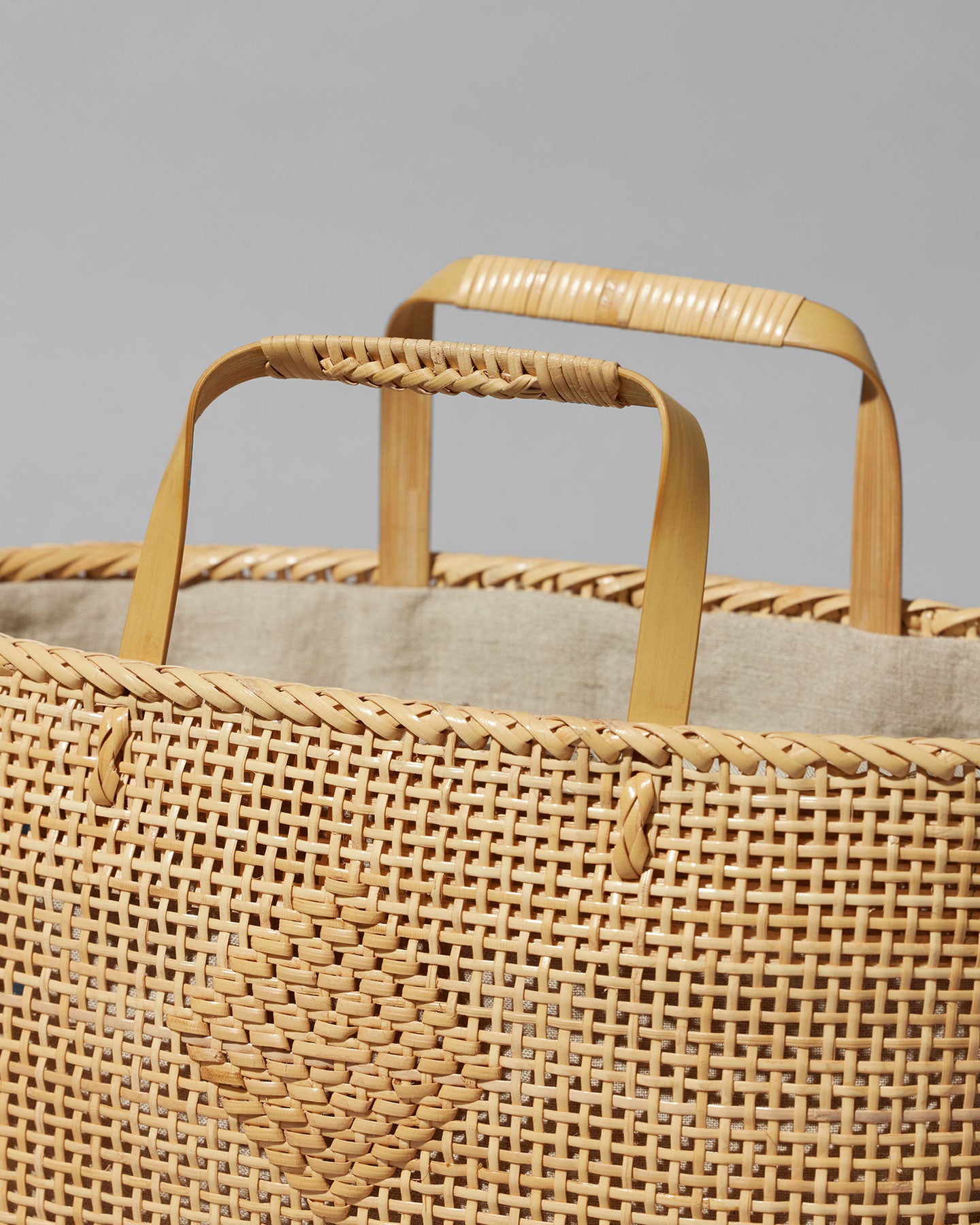 持ち手にはシャープに曲げ加工した竹を使い、底や角には皮籐を編み込んで強度を出すと同時に丸みを出し、補強もデザインの一部となるような形に仕上げました。