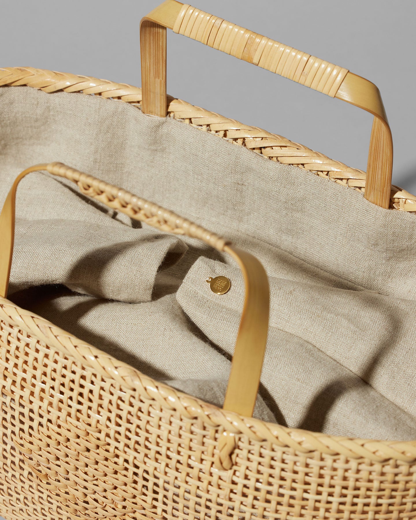 SIRI SIRIを代表する籐のシリーズ〈ARABESQUE〉のトートバッグ Sサイズ。2022年に職人の引退によりカゴバッグの生産を休止していましたが、技術を継承し復刻いたしました。新たにラインナップに加わったのはトート型のSサイズ。500㎖のペットボトルを横に寝かせてもゆとりある幅で、お財布、携帯も取り出しやすい深さです。竹の持ち手は手に馴染みやすいよう、籐のかがりを施しました。