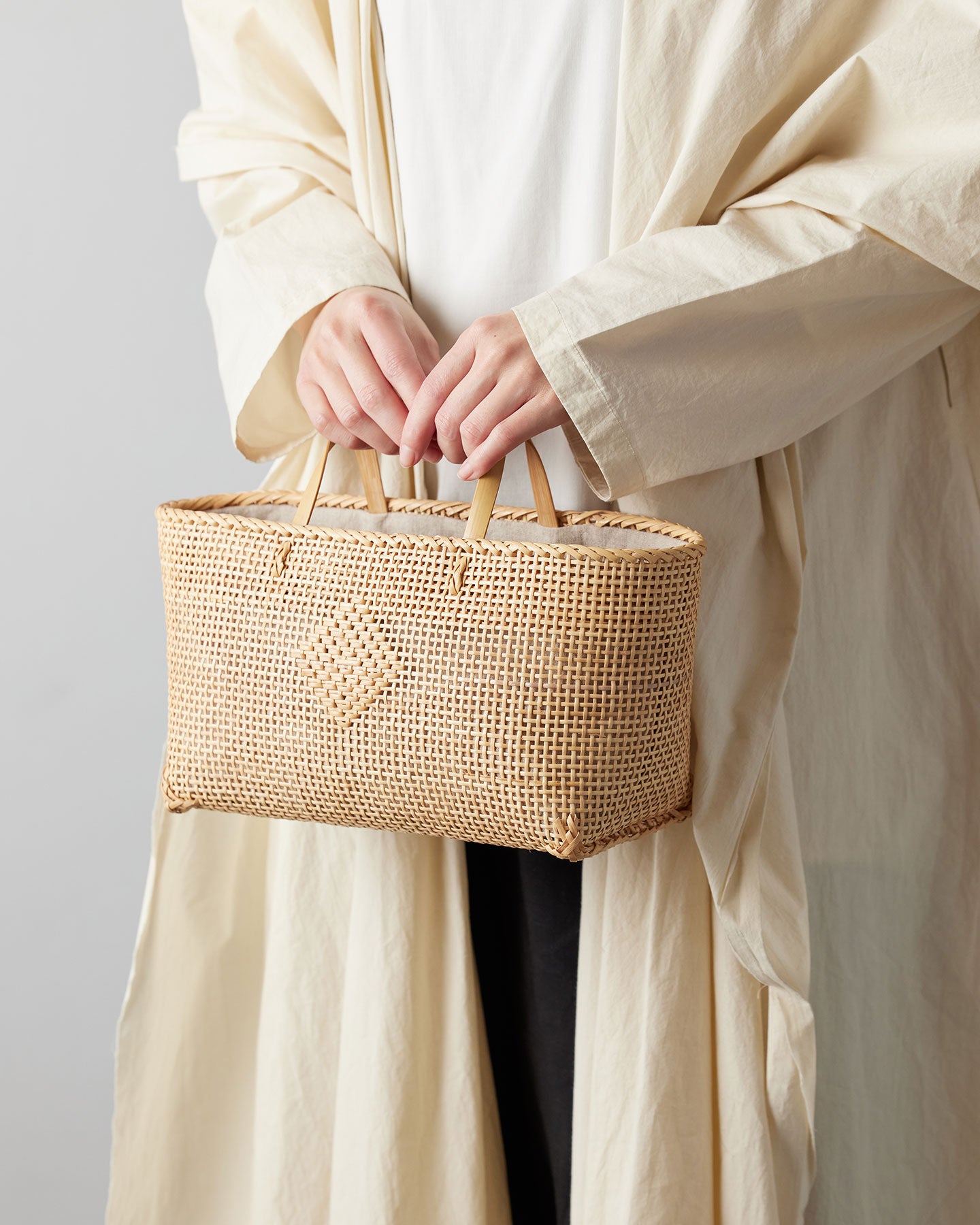 Introducing a new tote bag small size from SIRI SIRI’s signature rattan series ARABESQUE. The Japanese-style handwoven motif on its rattan peel construction serves as an accent. The craftsman’s finesse shines in the details of the boldly bent bamboo handle and the curve section of its opening. Lined with hemp fabric, this lightweight bag makes it ideal for everyday use. The soft expression resulting from kakishibu* treatment is sure to add an elegant finishing touch to any outfit, Western or Japanese. *kakishibu - persimmon tannin dye; traditional Japanese dye of deep amber color which comes from unripe persimmons that have been fermented for more than 2 years
