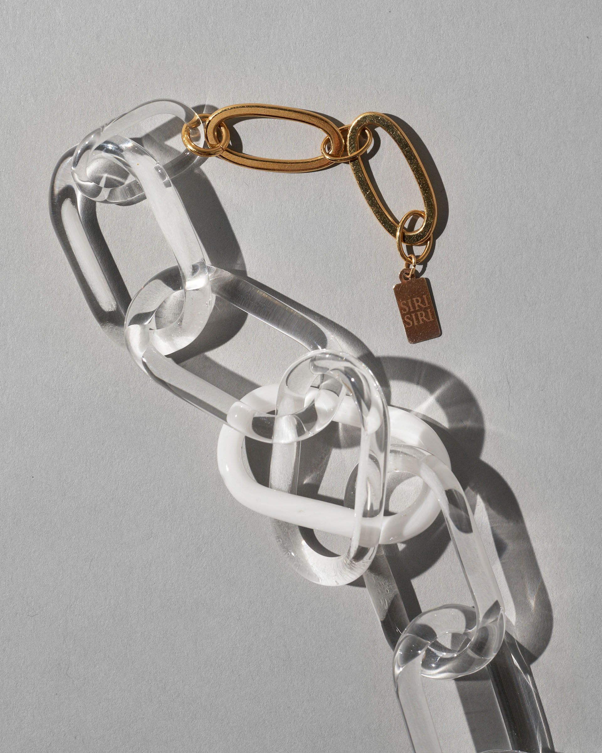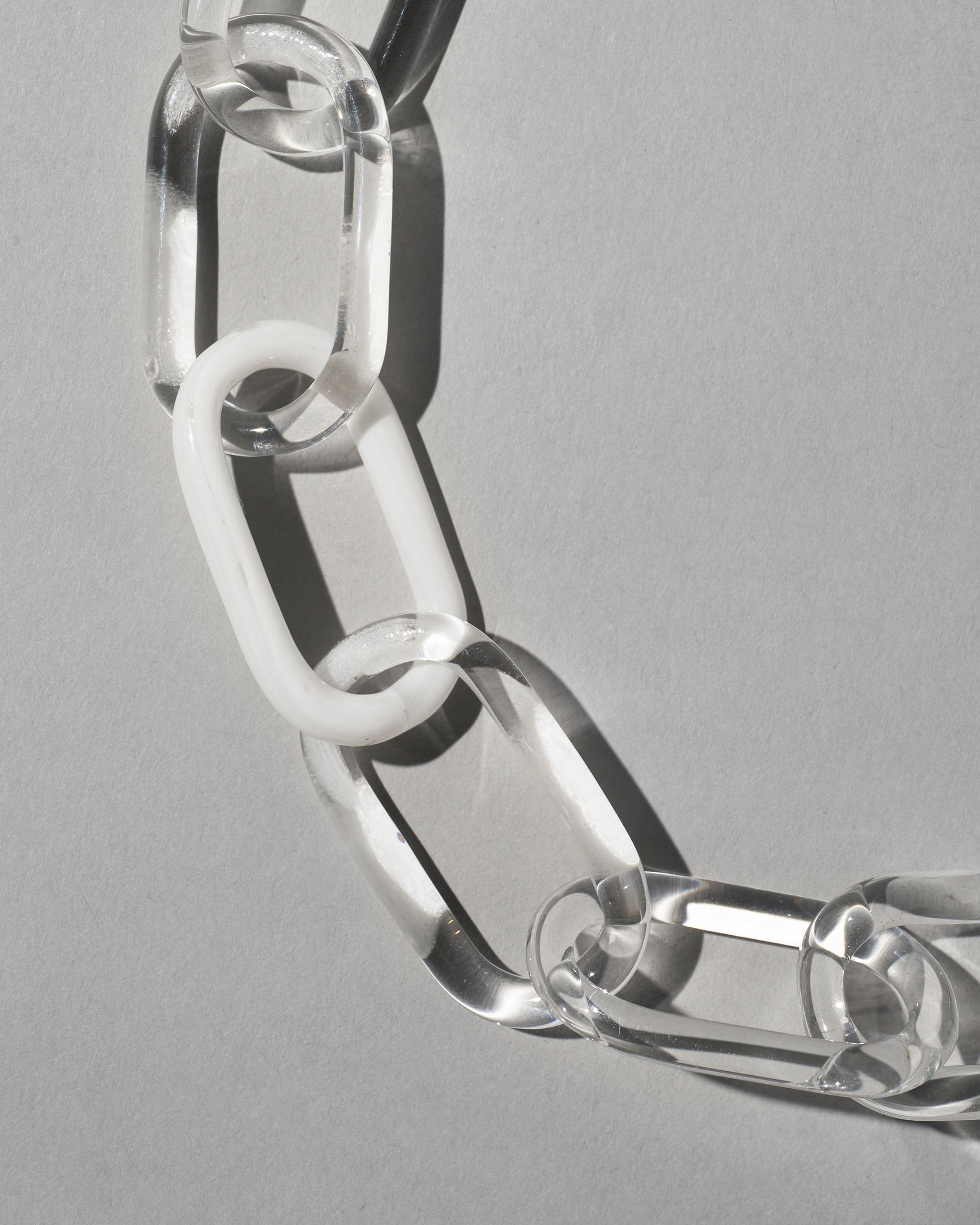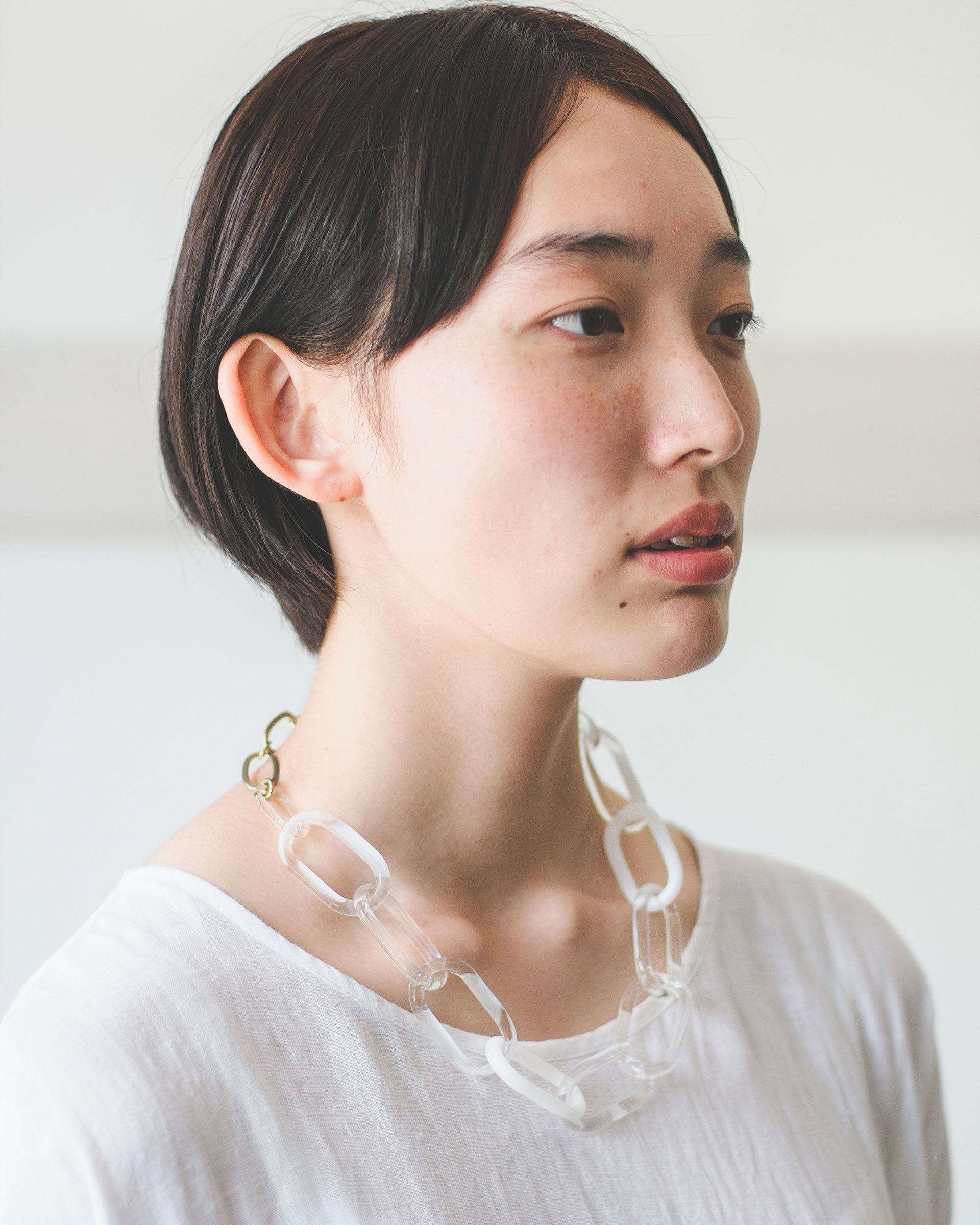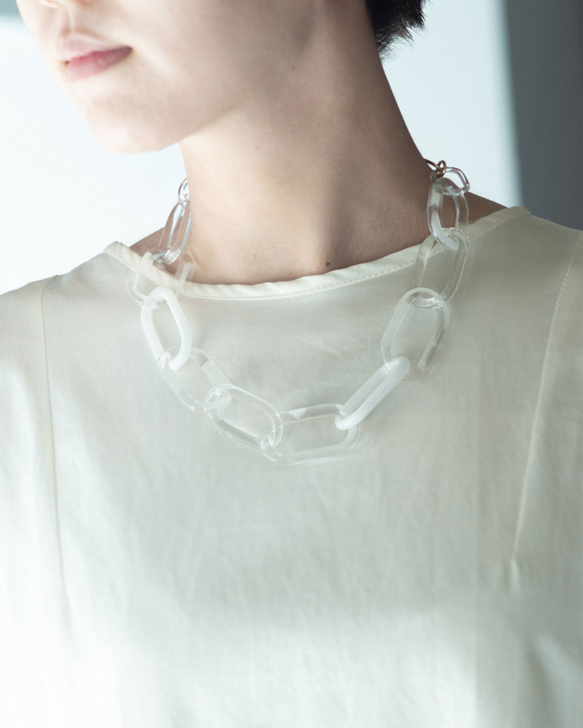 〈CHAIN SNOW〉はクリアガラスにホワイトの色ガラスを組み合わせた、クラシックでフォーマルなガラスチェーンネックレス。圧倒的な存在感と端正な佇まいが品性を感じさせます。世界の要人にも愛される、SIRI SIRIのシグネチャー・ピースのひとつです。
