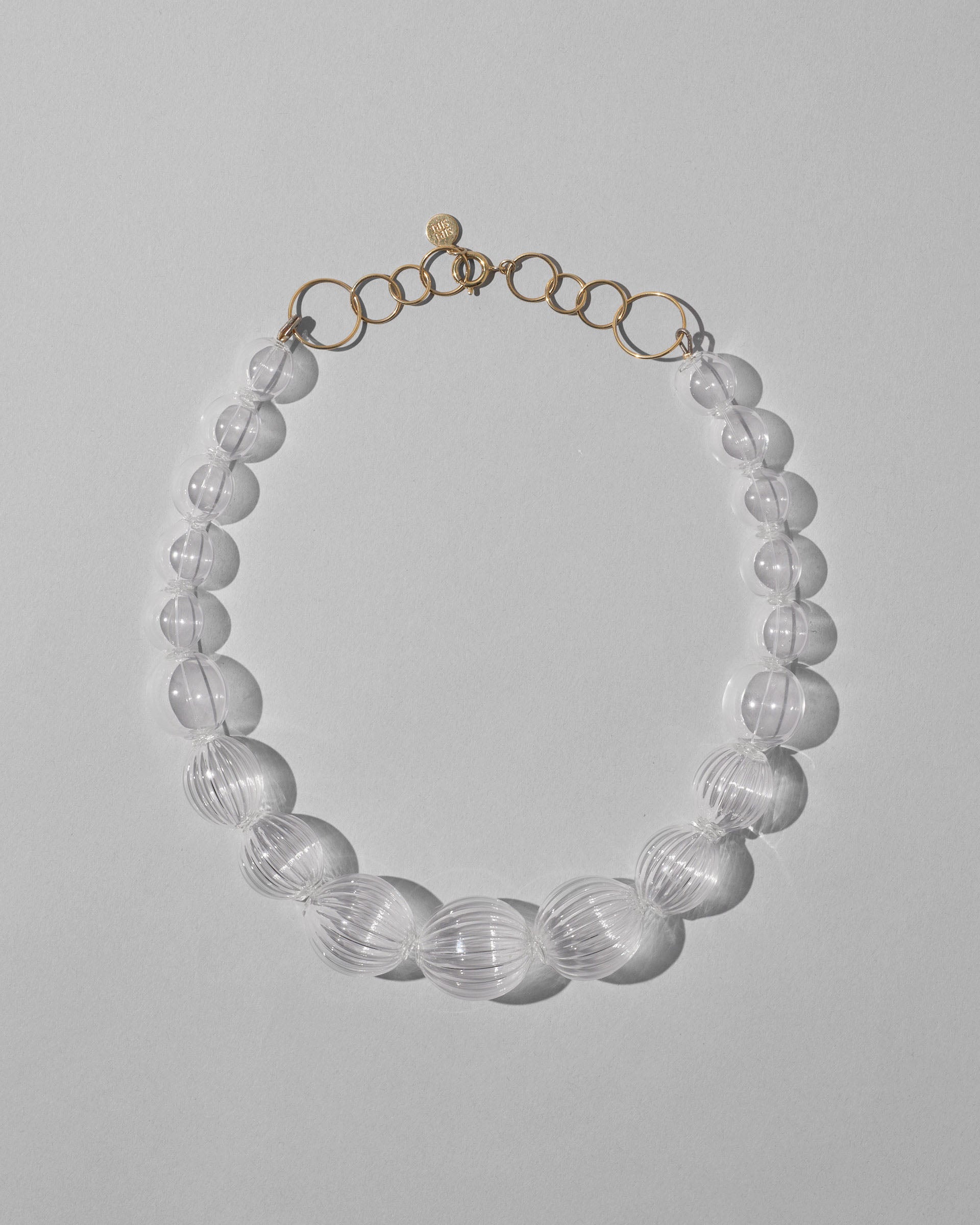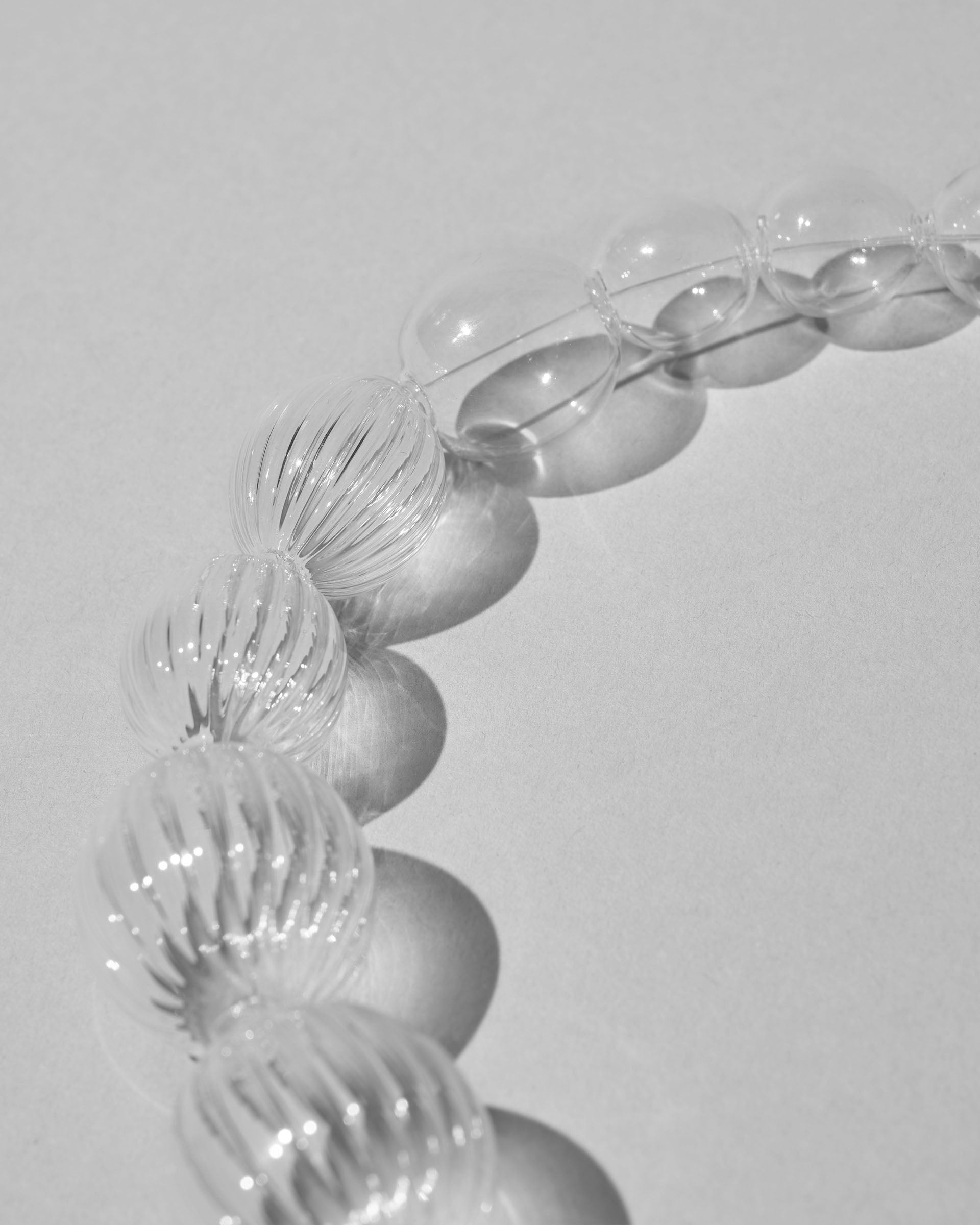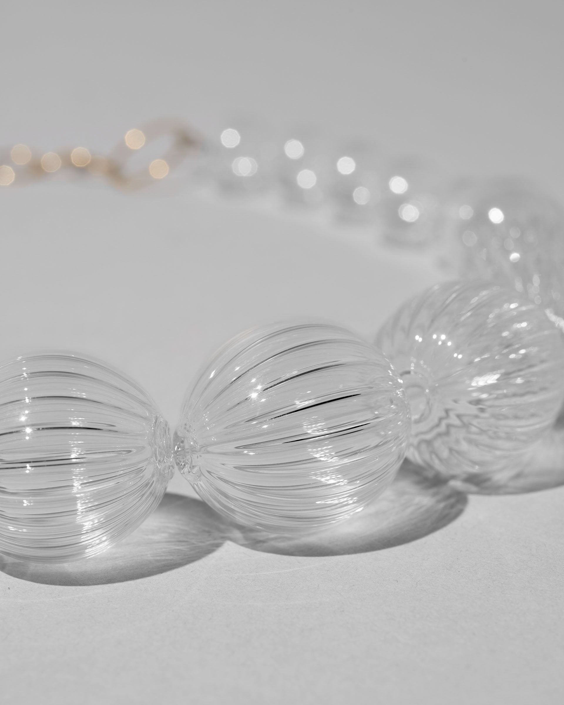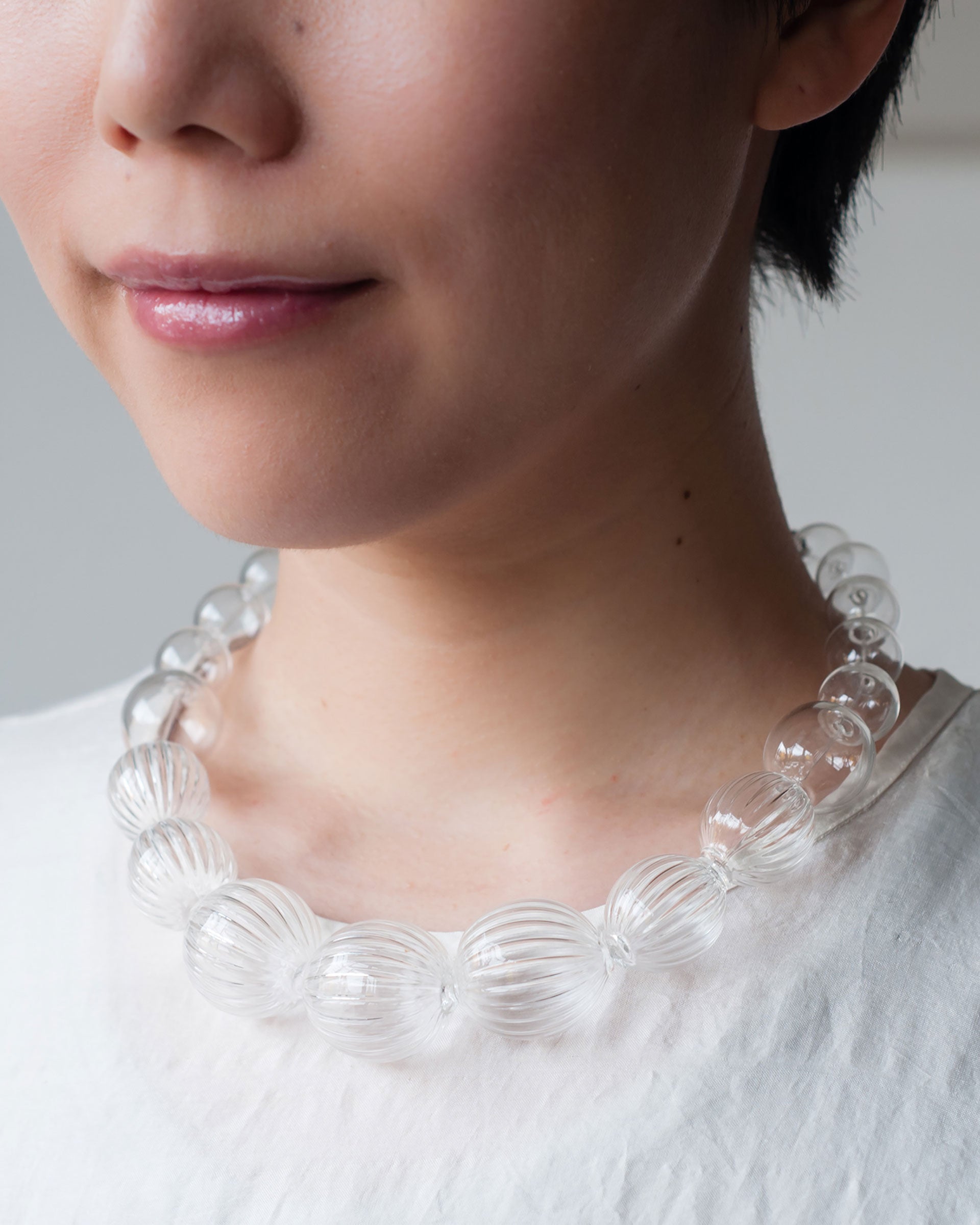 まるでガラスでできた泡を身につけるようなネックレス。動くたび、揺れて光をキラキラと反射します。