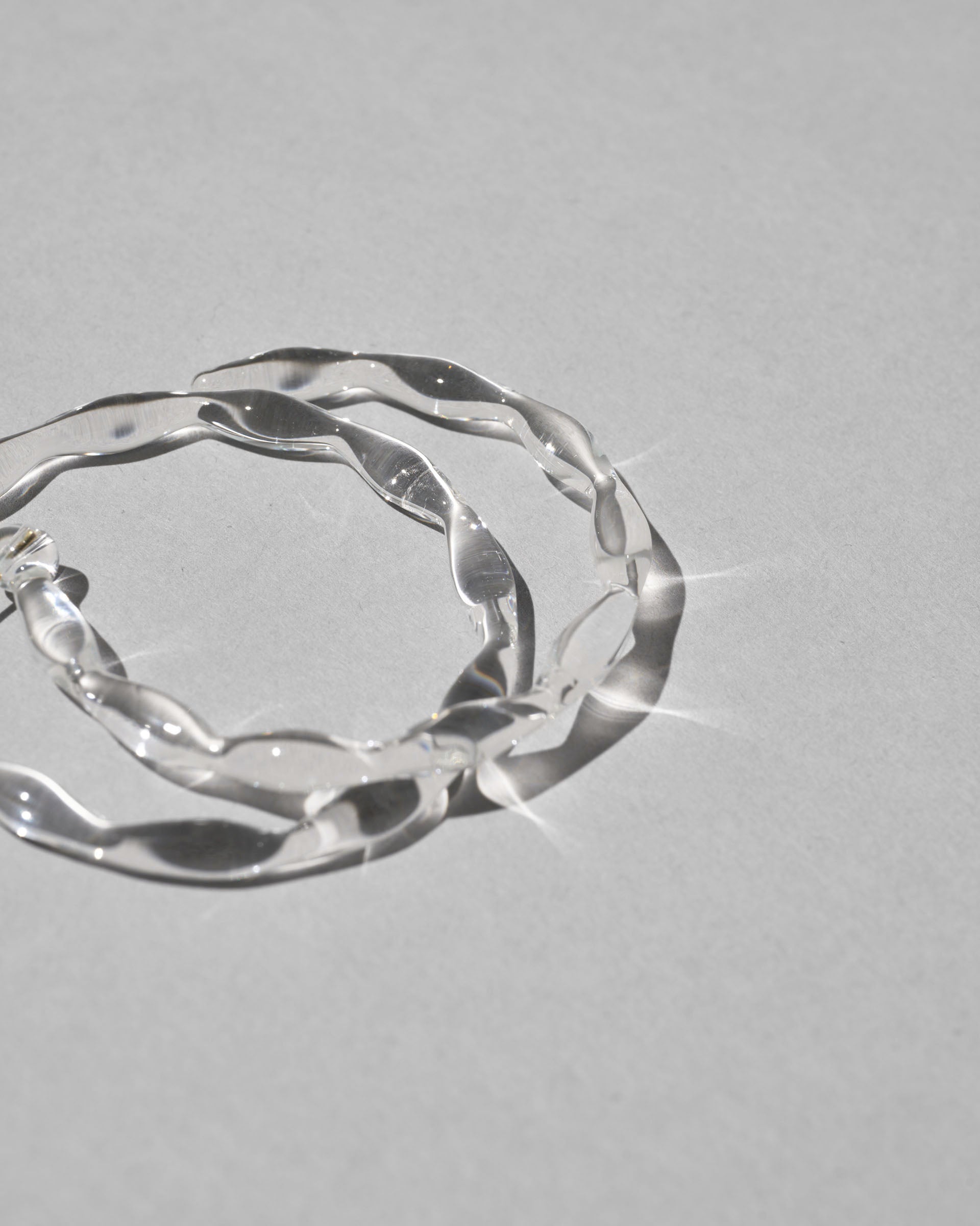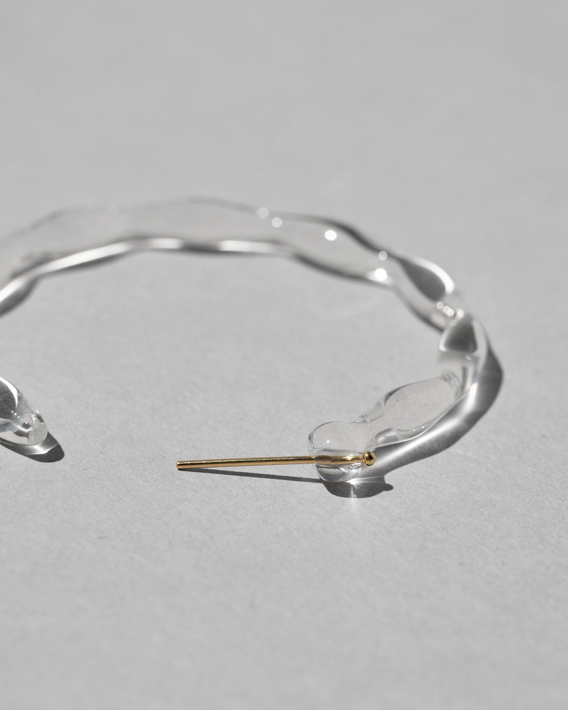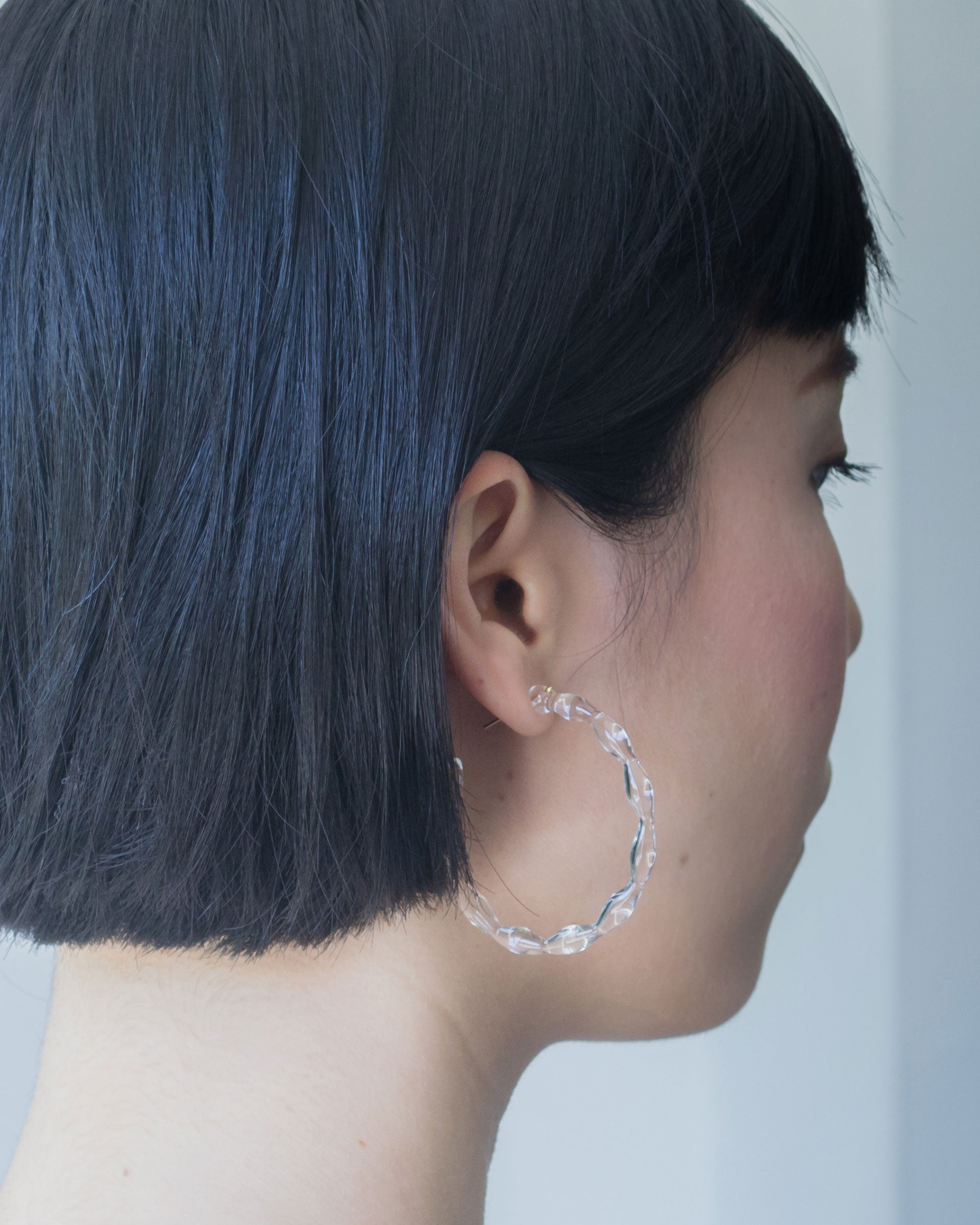 限りなく透明なしずくの連なりを円形に仕上げたフープピアス。一粒一粒のしずくに光が反射し、クリアでありながら確かな存在感を放ちます。
