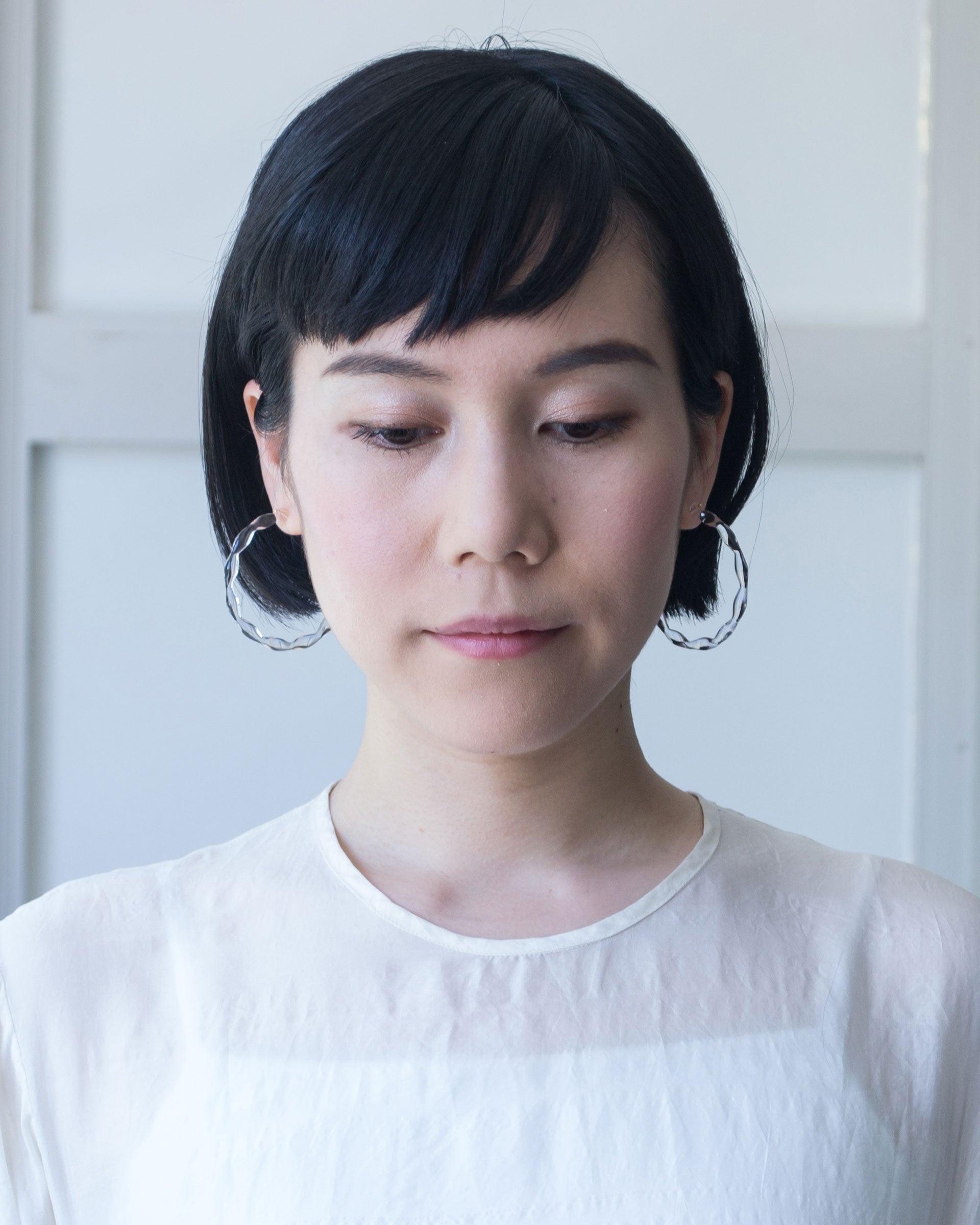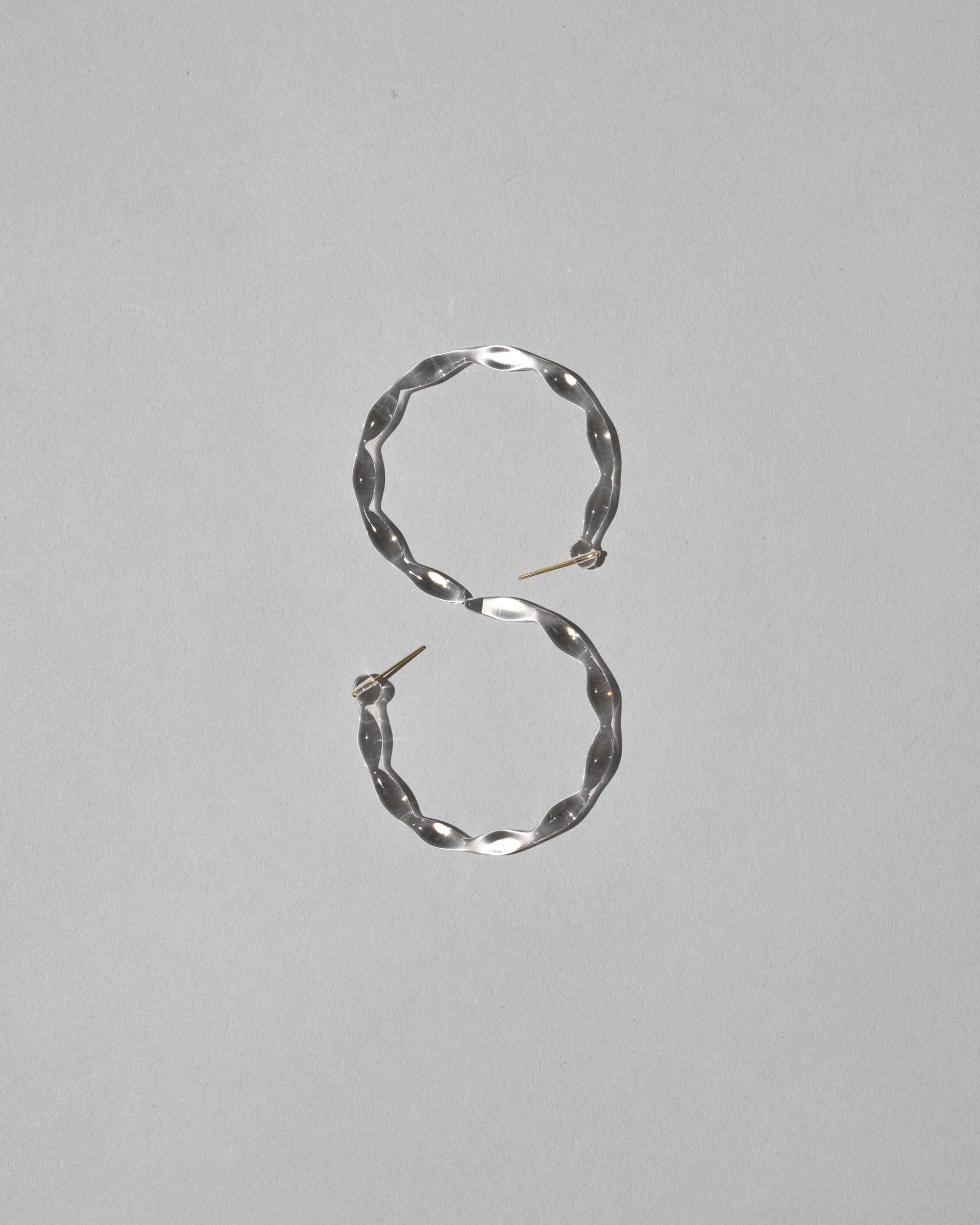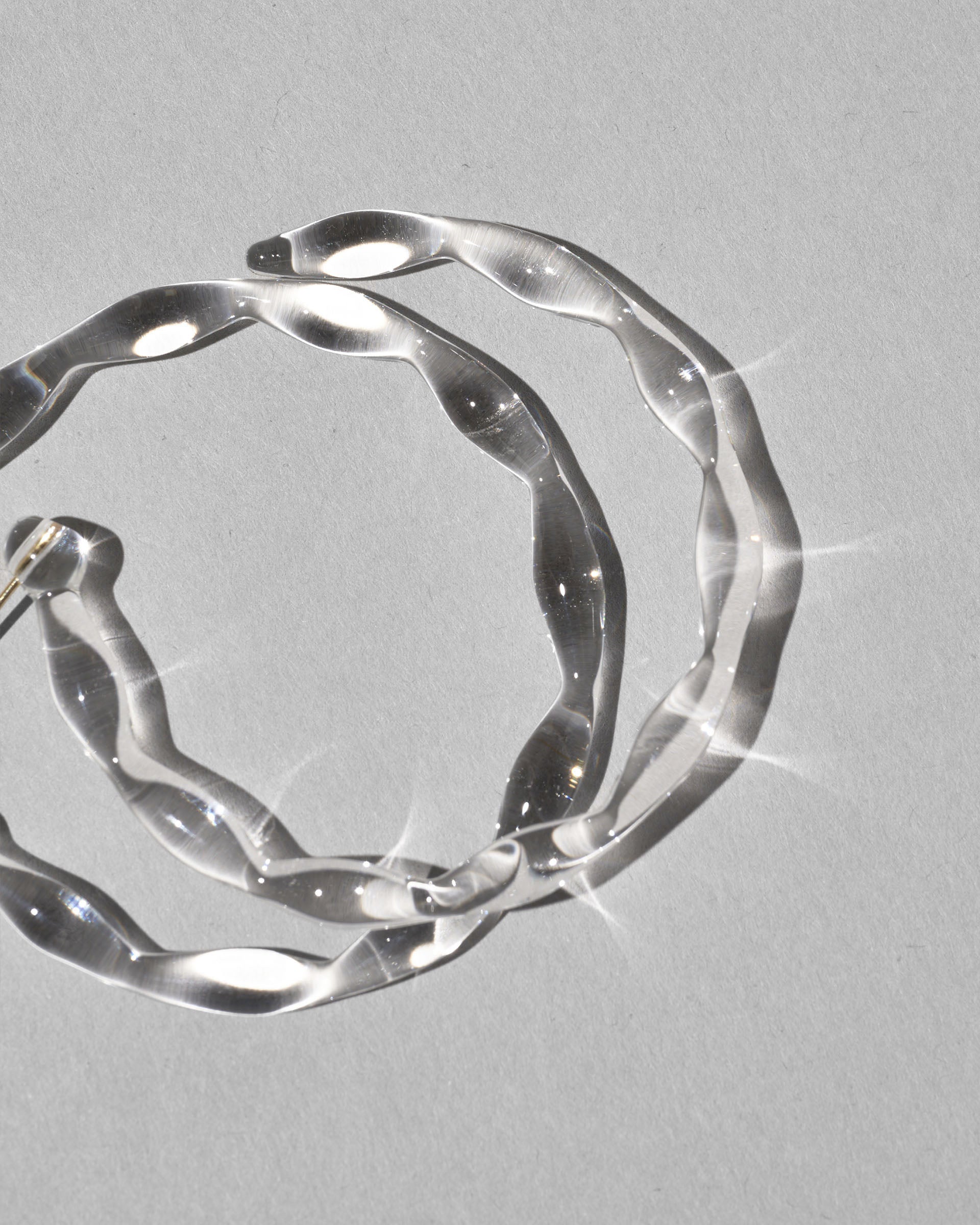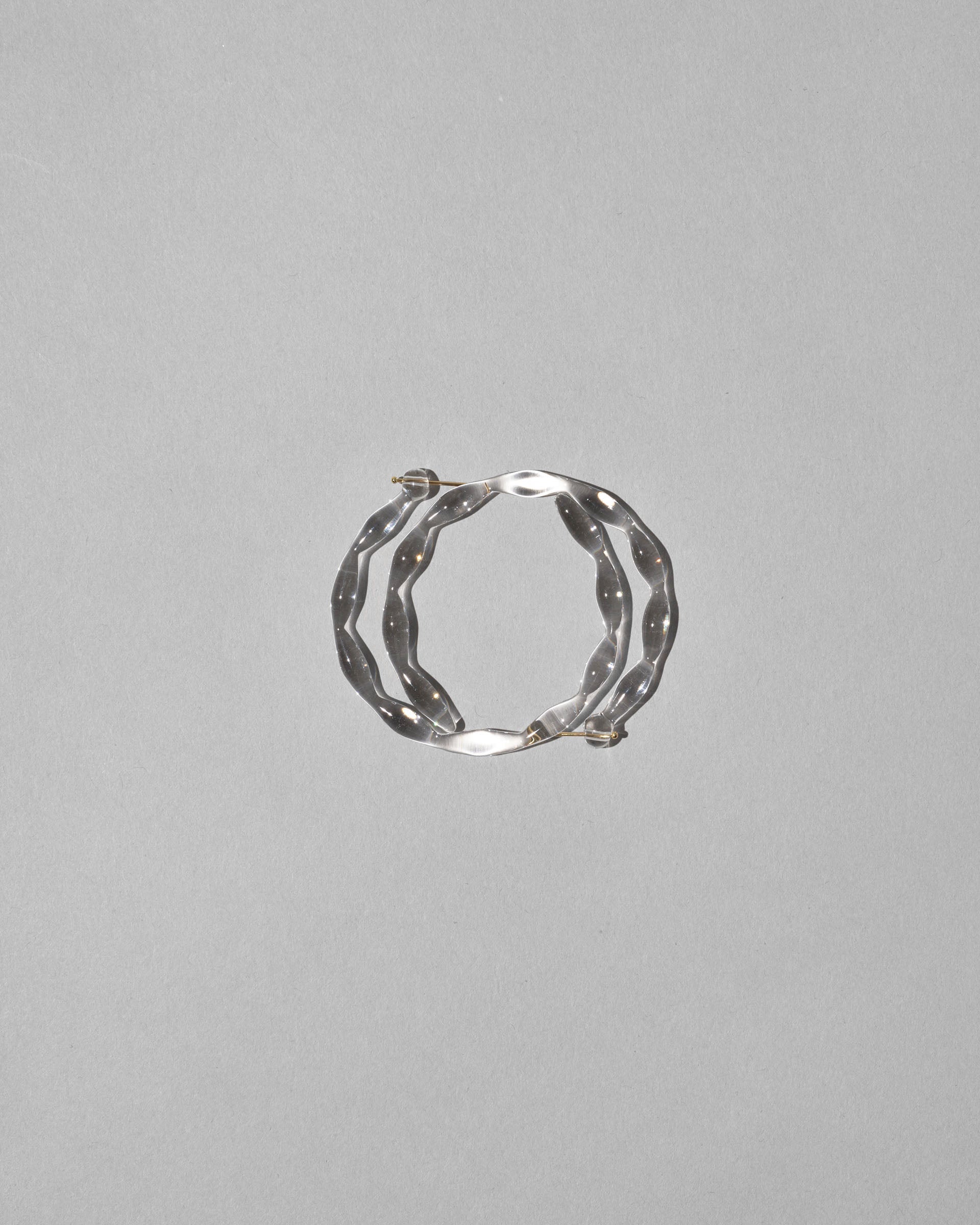 限りなく透明なしずくの連なりを円形に仕上げたフープピアス。一粒一粒のしずくに光が反射し、クリアでありながら確かな存在感を放ちます。