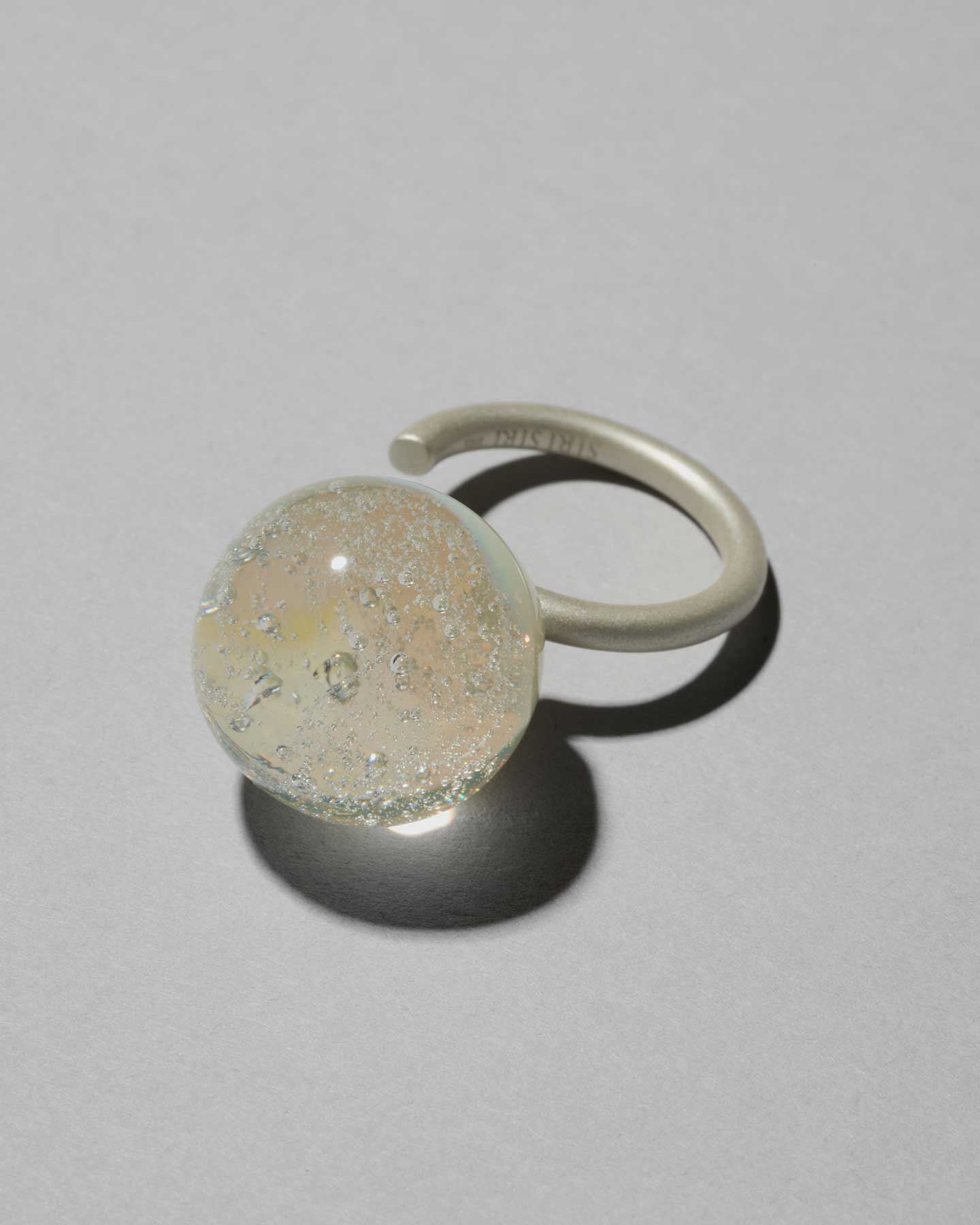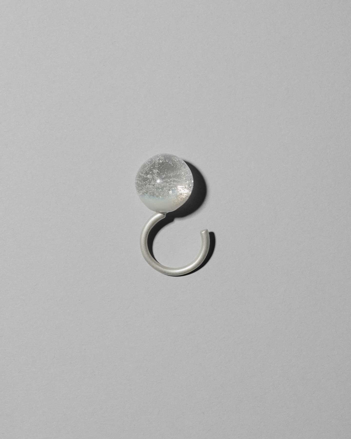 薄雲に包まれた太陽や月が放つ光の輪「ハロー」から着想。透明なガラスに泡を閉じ込め、一部にクリーム色のガラスを重ねることで、スノードームのような繊細な世界を表現したリング。優しく上品な手元を演出します。