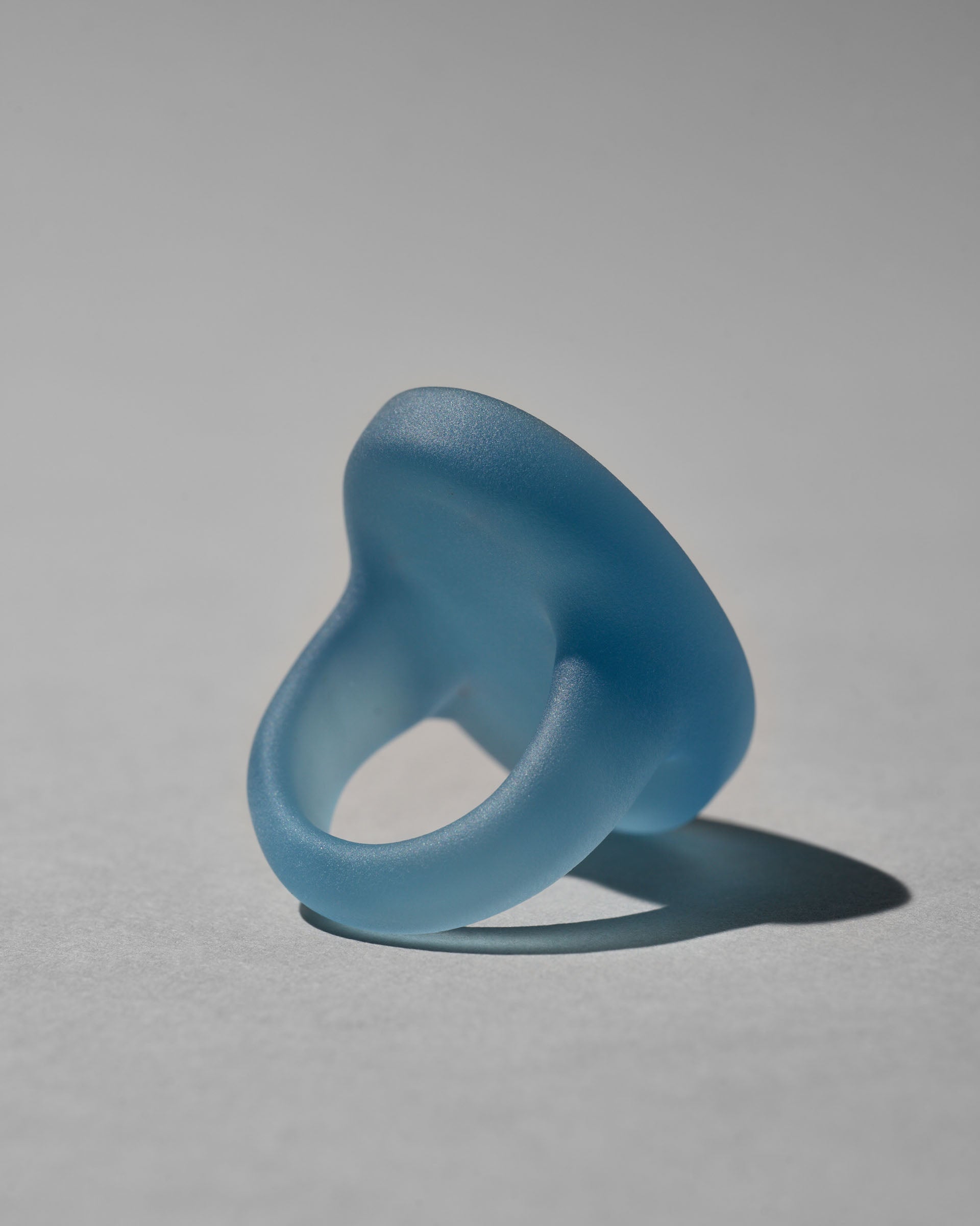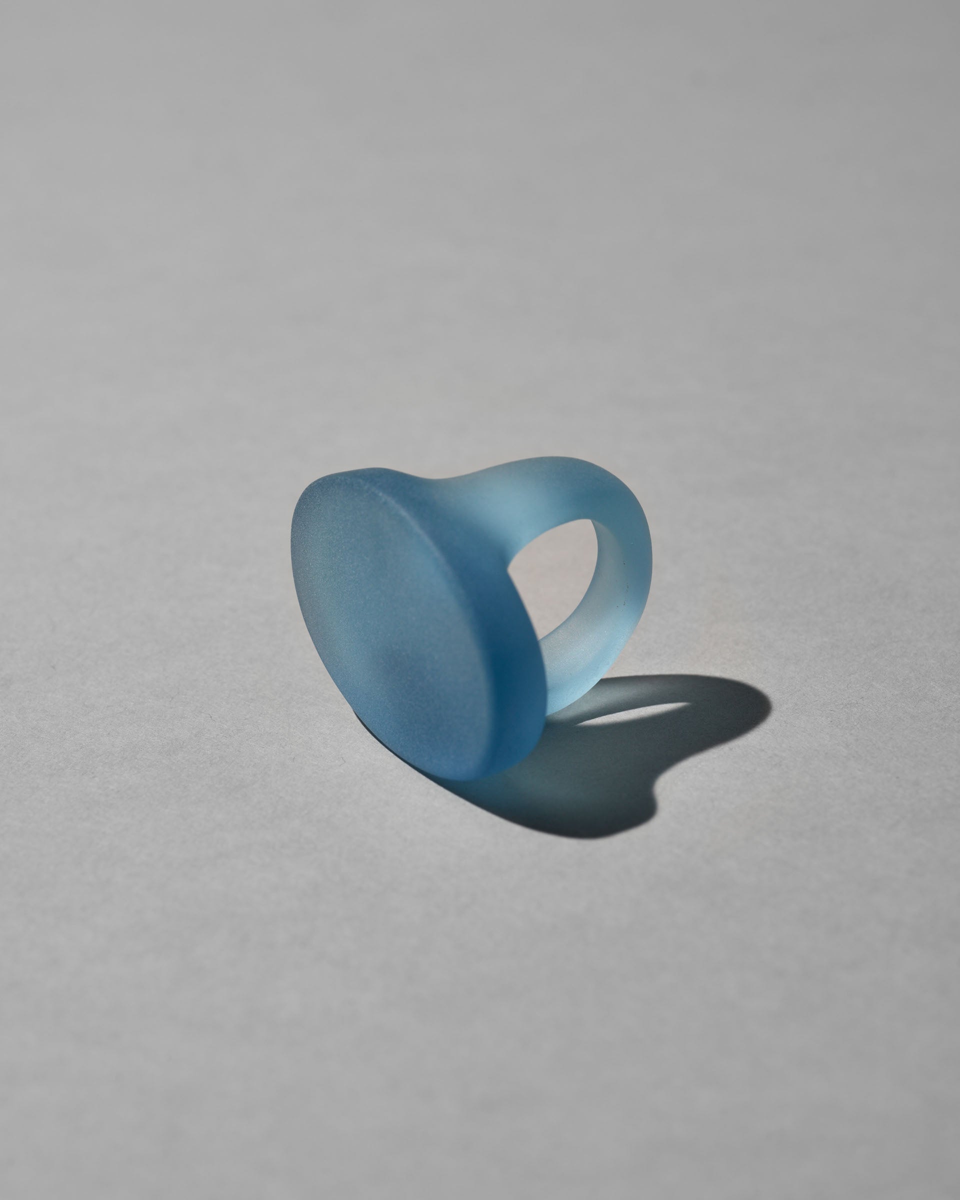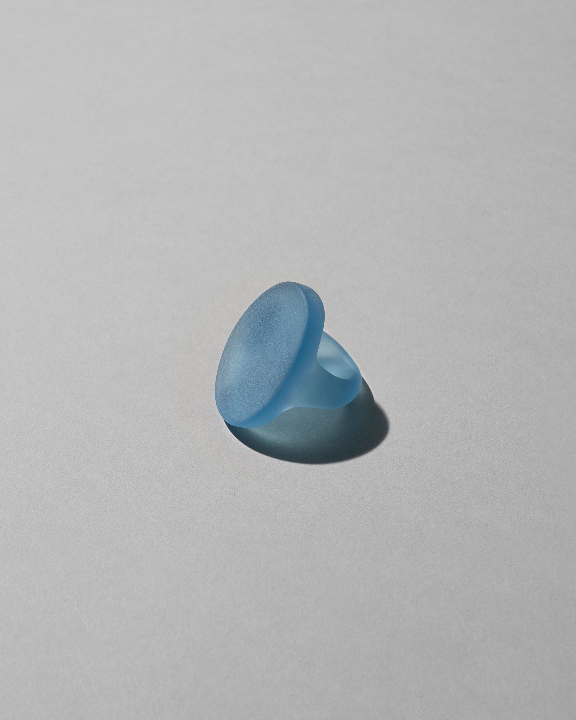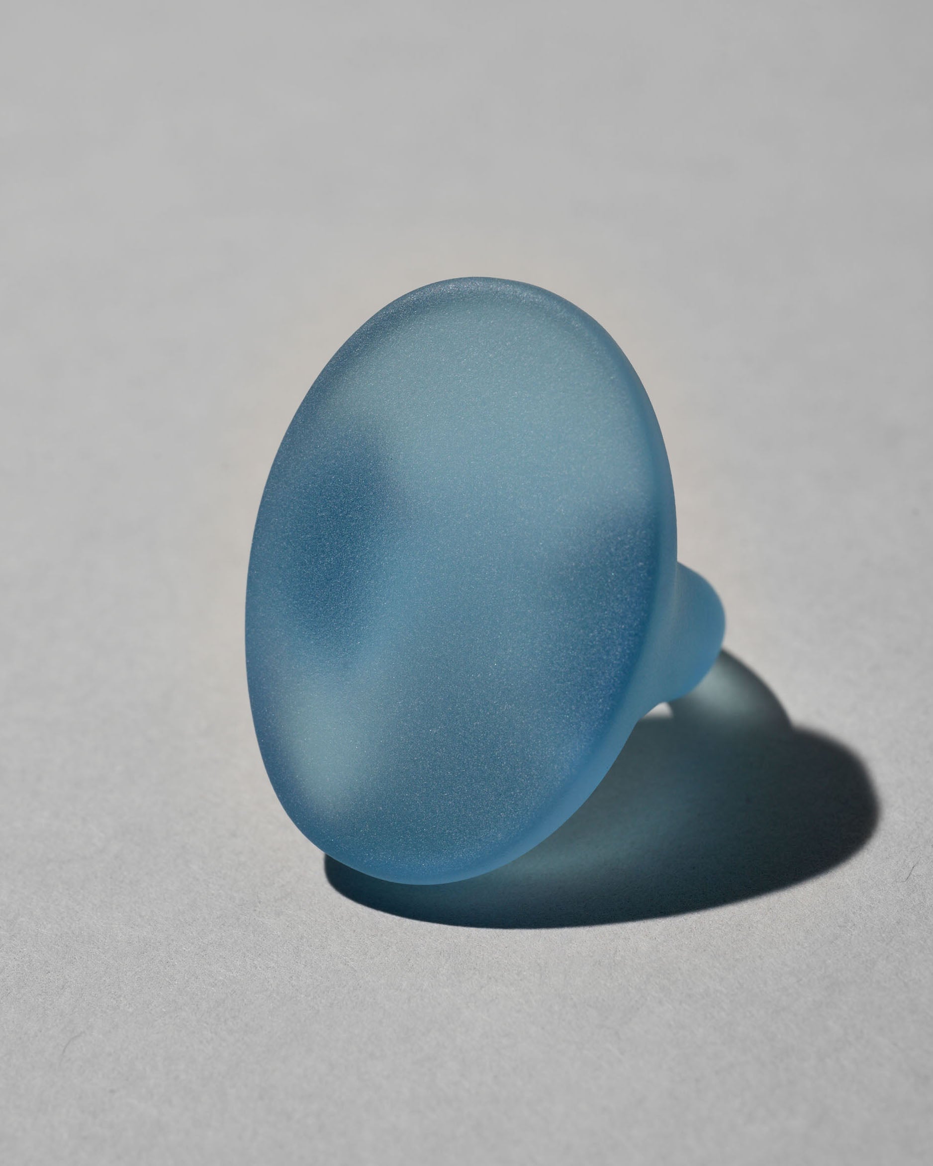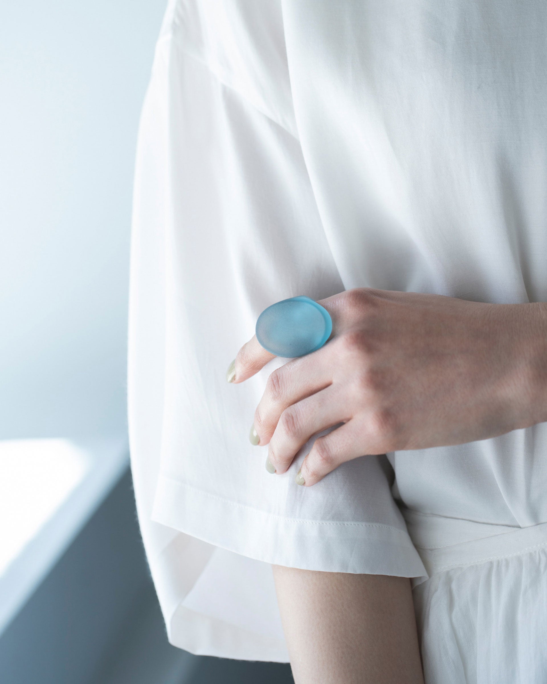 なめらかな曲線が指を包み込む「Ring Oval」。豊かに流れる水を思わせる「BLUE」は、SIRI SIRIのアイテムで初めてブルーのガラスを使用しました。