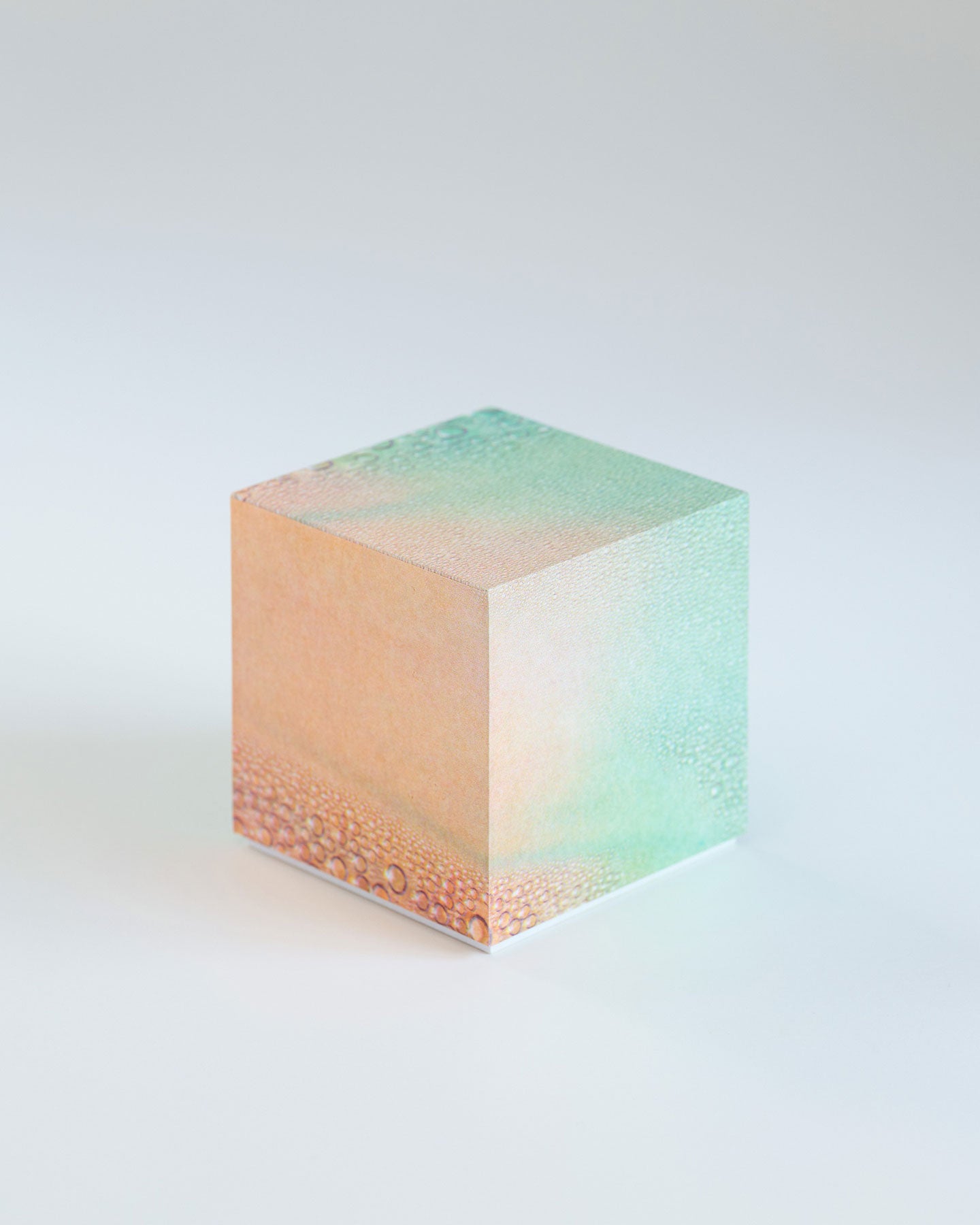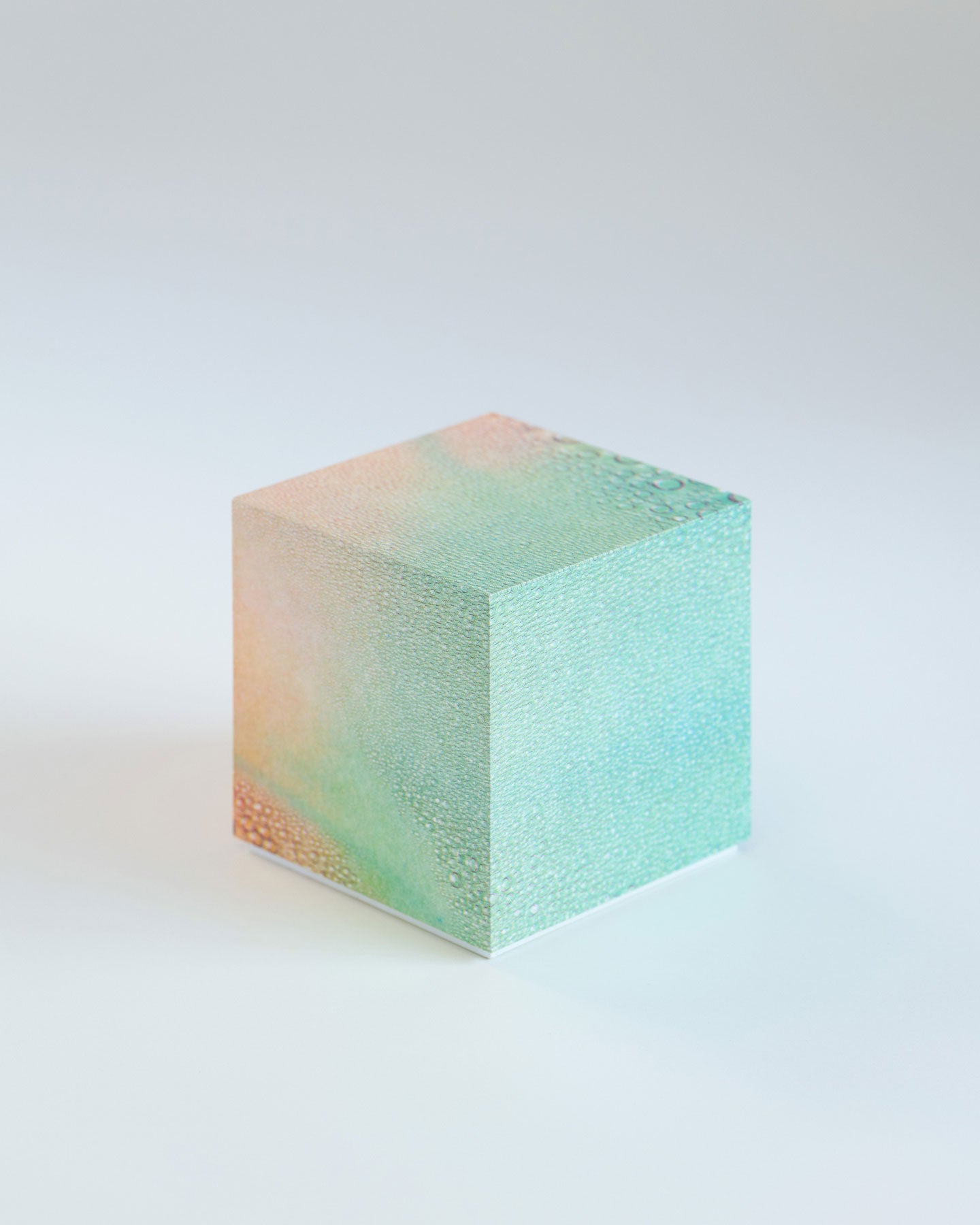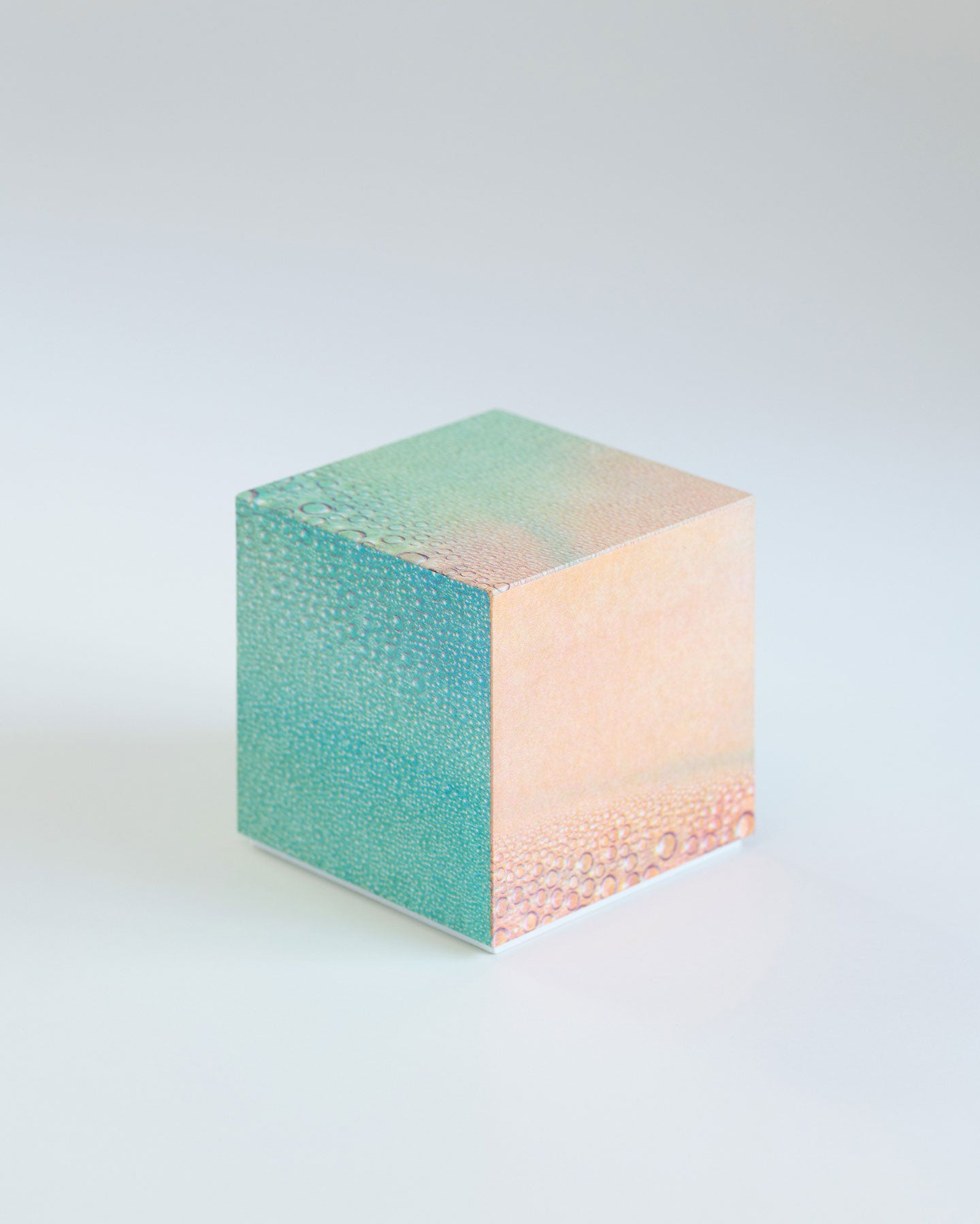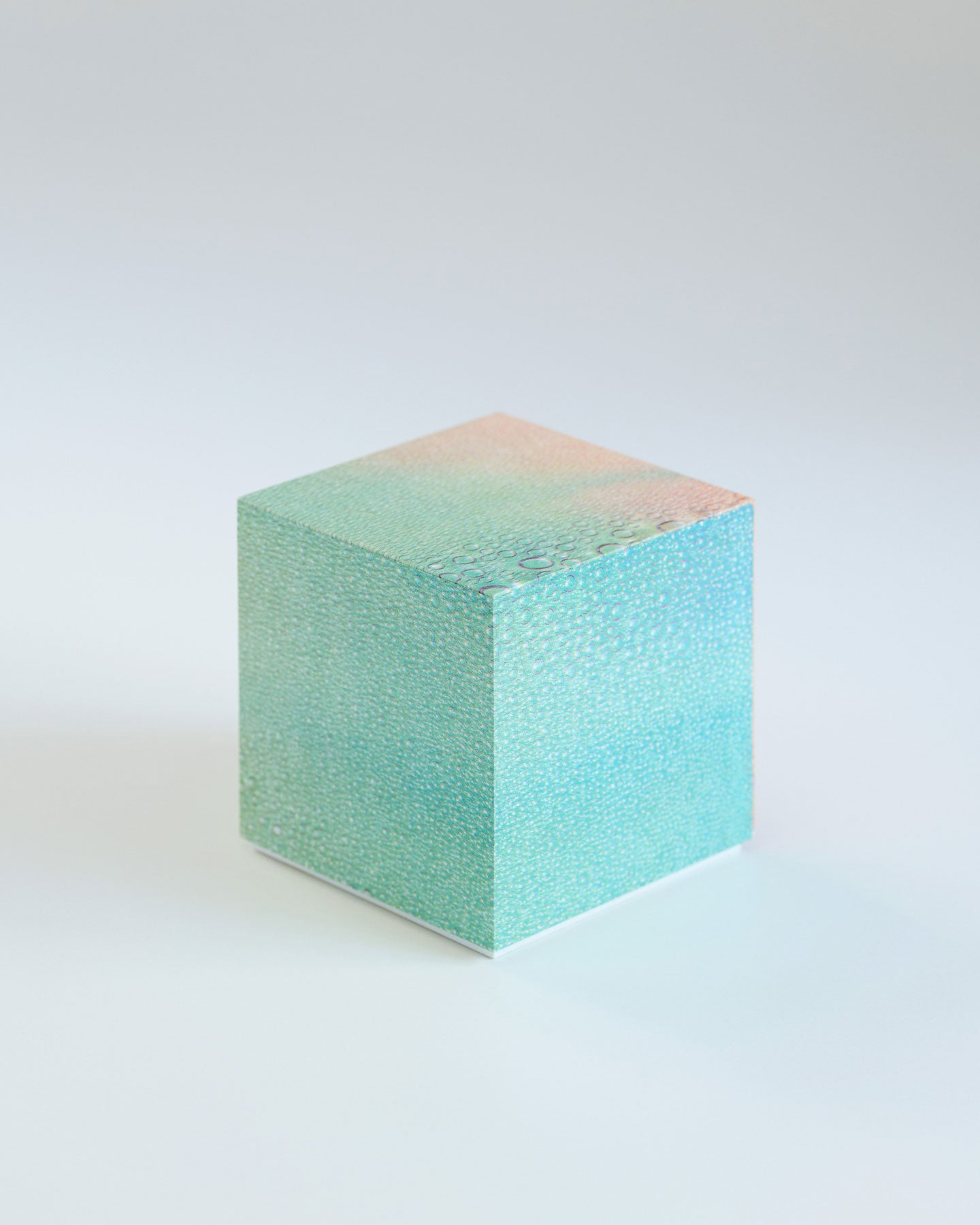 PAPIER LABO.による箱のオブジェ『Paper for Jewelry』は、写真家・小山泰介の作品「Rainbow Variations」をNEUTRAL COLORSニュー・カラーによるリソグラフで印刷した紙を用いたもの。箱の制作は綿引尚が手がけています。直線と角が美しい立方体は箱という機能に加え、オブジェとしての存在感を持っています。