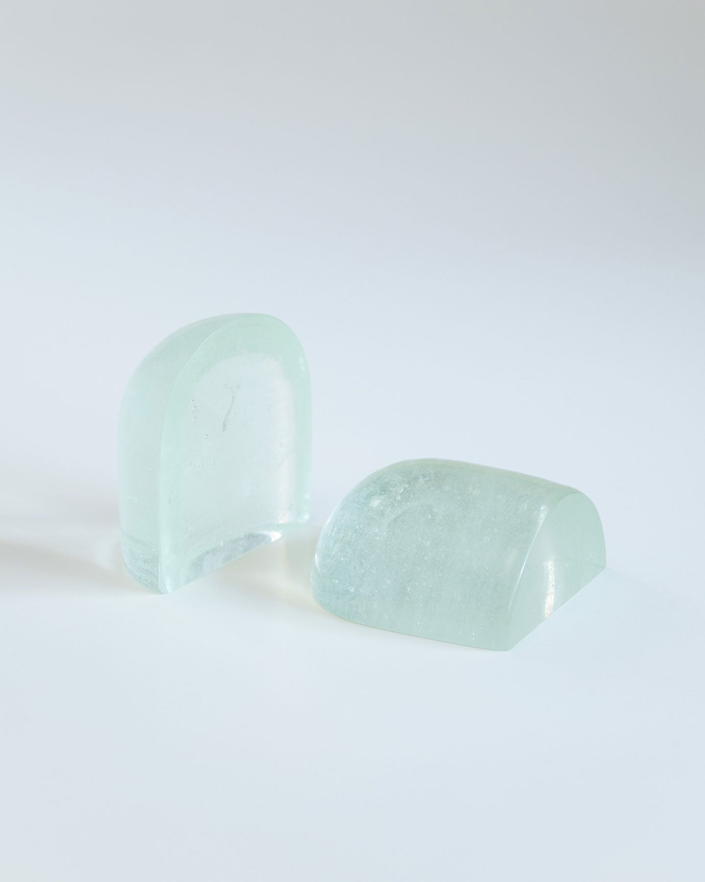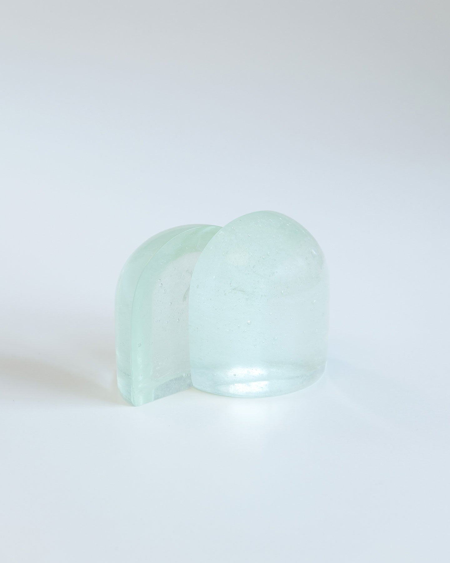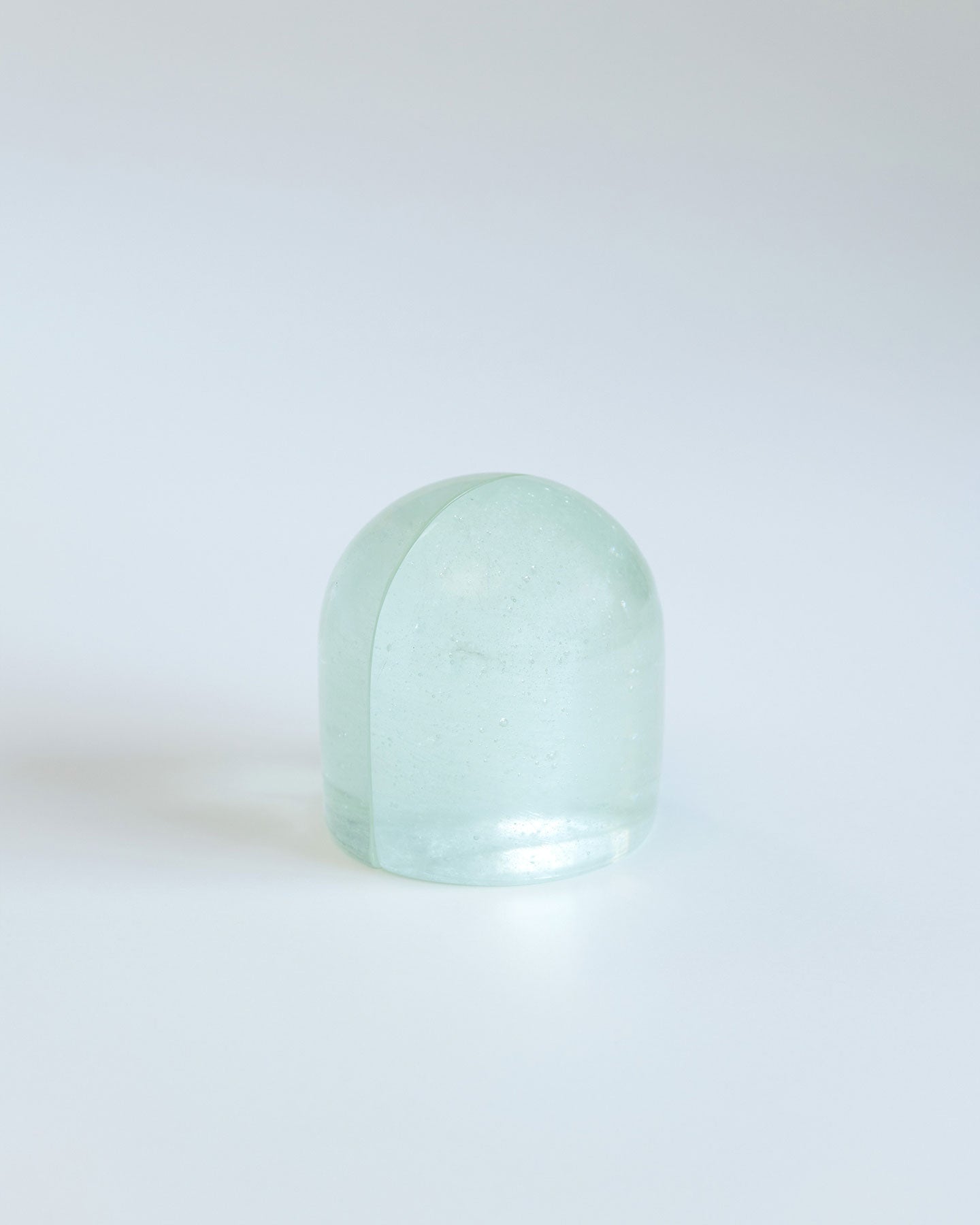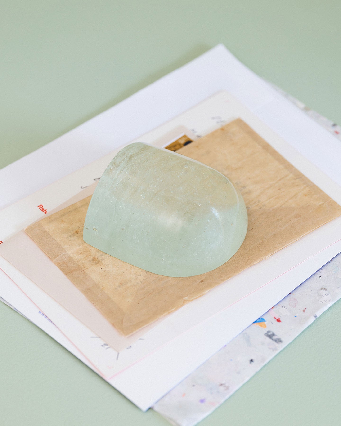 SIRI SIRIによるリサイクル・ガラスを用いたぽってりしたガラスのオブジェ『Jewelry for Paper』。大きなガラスの塊がするりとずれると、まるで氷のような断面が顔を出します。自然光が当たると、透過した光が紙に落ち、時間帯によっても見え方がかわります。分割して置いても、くっつけても成り立つ、重量感がありつつ軽やかなデザインを自由に楽しめるプロダクトです。