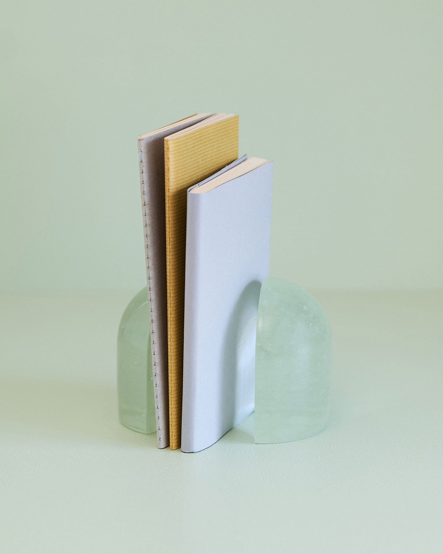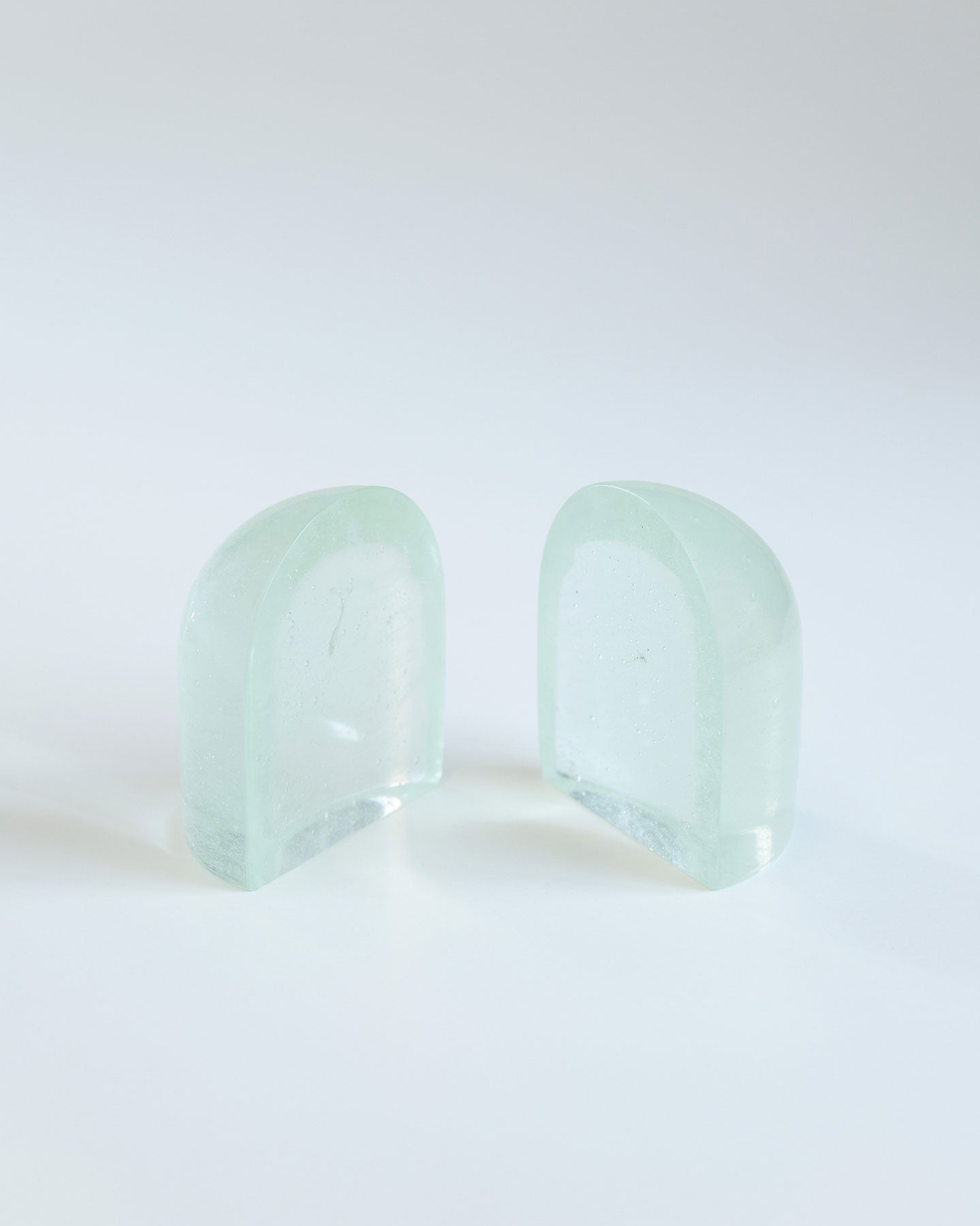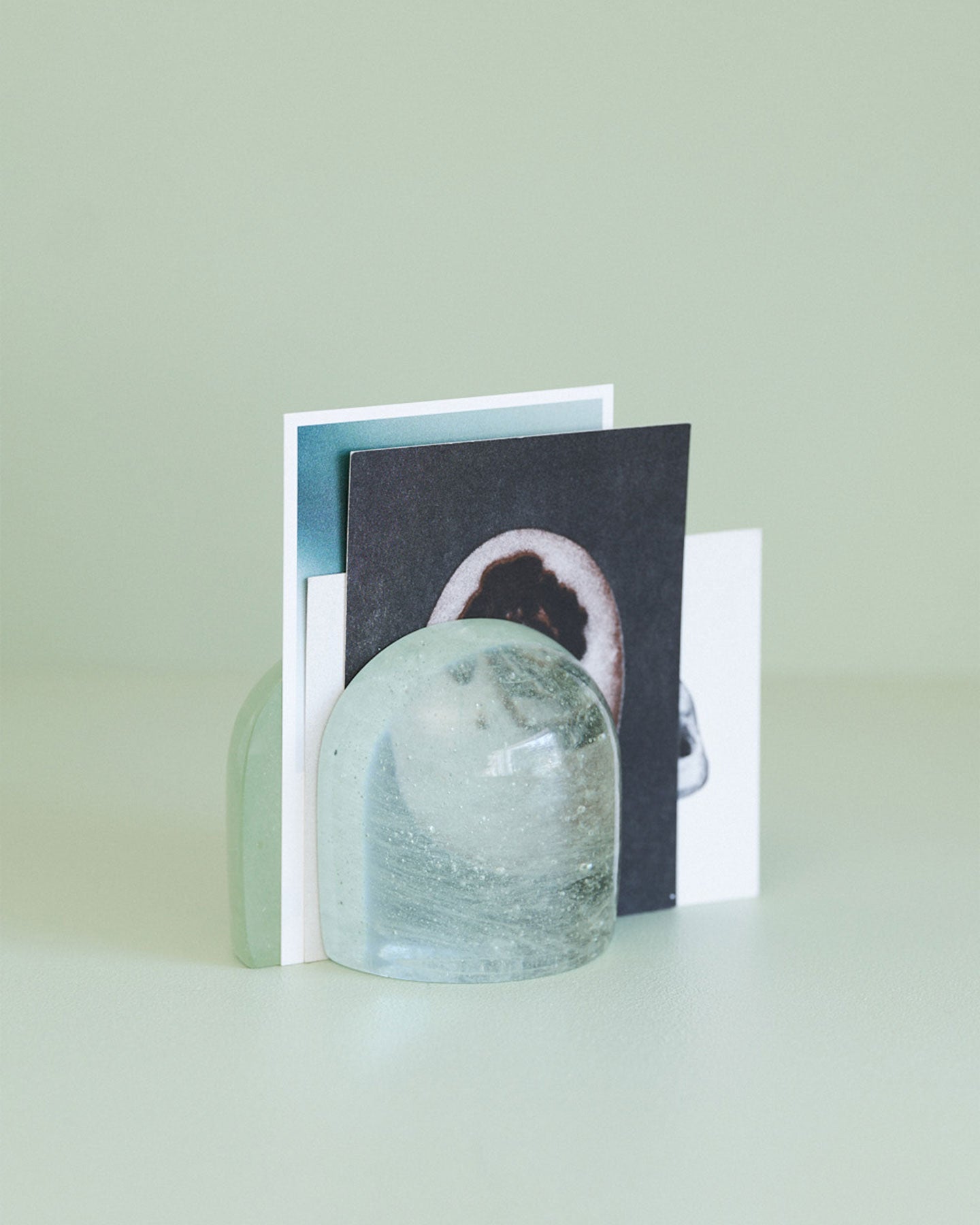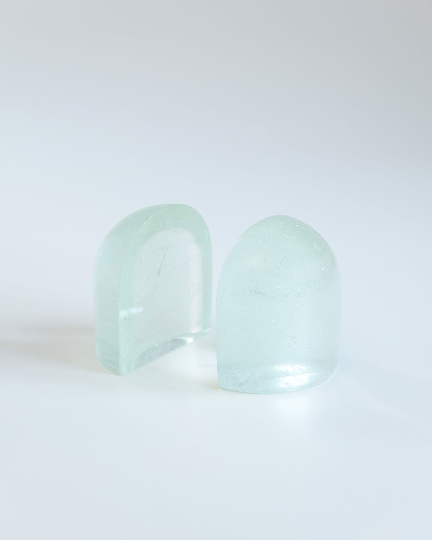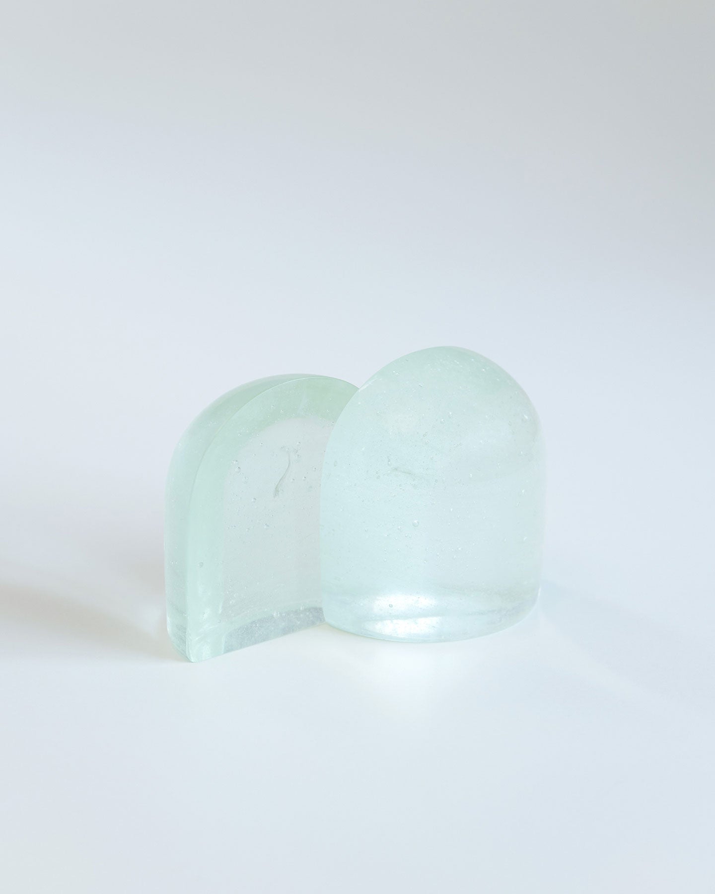 SIRI SIRIによるリサイクル・ガラスを用いたぽってりしたガラスのオブジェ『Jewelry for Paper』。大きなガラスの塊がするりとずれると、まるで氷のような断面が顔を出します。自然光が当たると、透過した光が紙に落ち、時間帯によっても見え方がかわります。分割して置いても、くっつけても成り立つ、重量感がありつつ軽やかなデザインを自由に楽しめるプロダクトです。