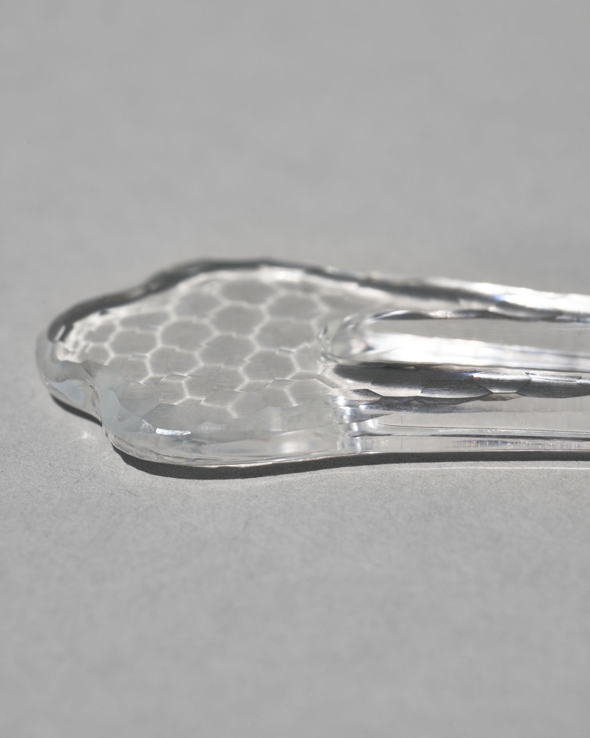 SIRI SIRIの切り子ジュエリーは「薄く曇った状態」の半ツヤ仕上げ。透明にしすぎないよう、洗いや検査を3~4回繰り返し、慎重に仕上げています。