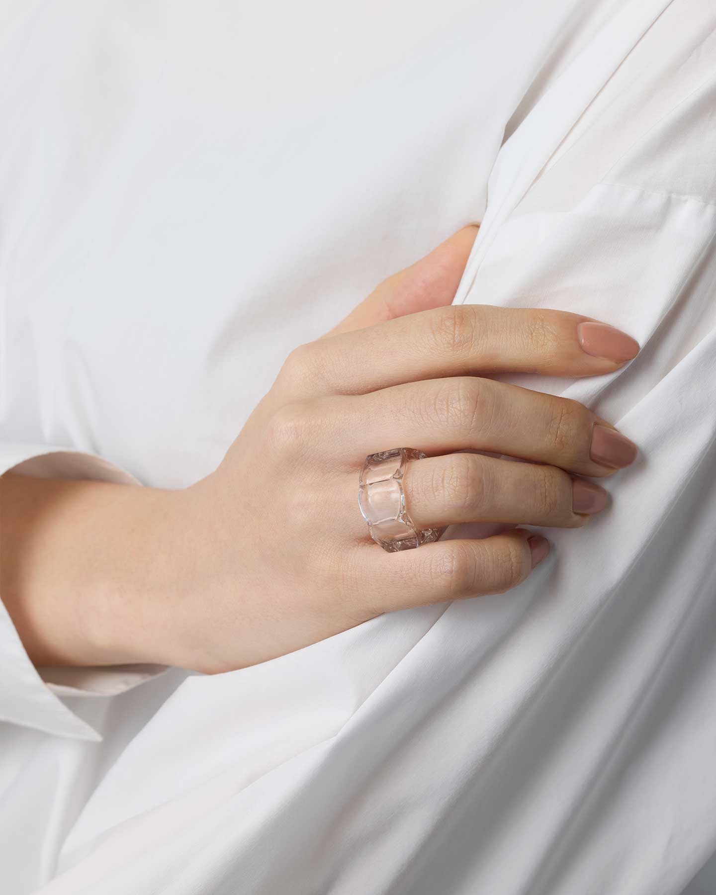 八角形のフォルムと、リズミカルに波打つ輪郭が重なるガラスのリング。角度によって印象が変化する、ユニークな造形のジュエリーです。透明なガラスの輝きが、シンプルな装いに美しいアクセントを添えます。