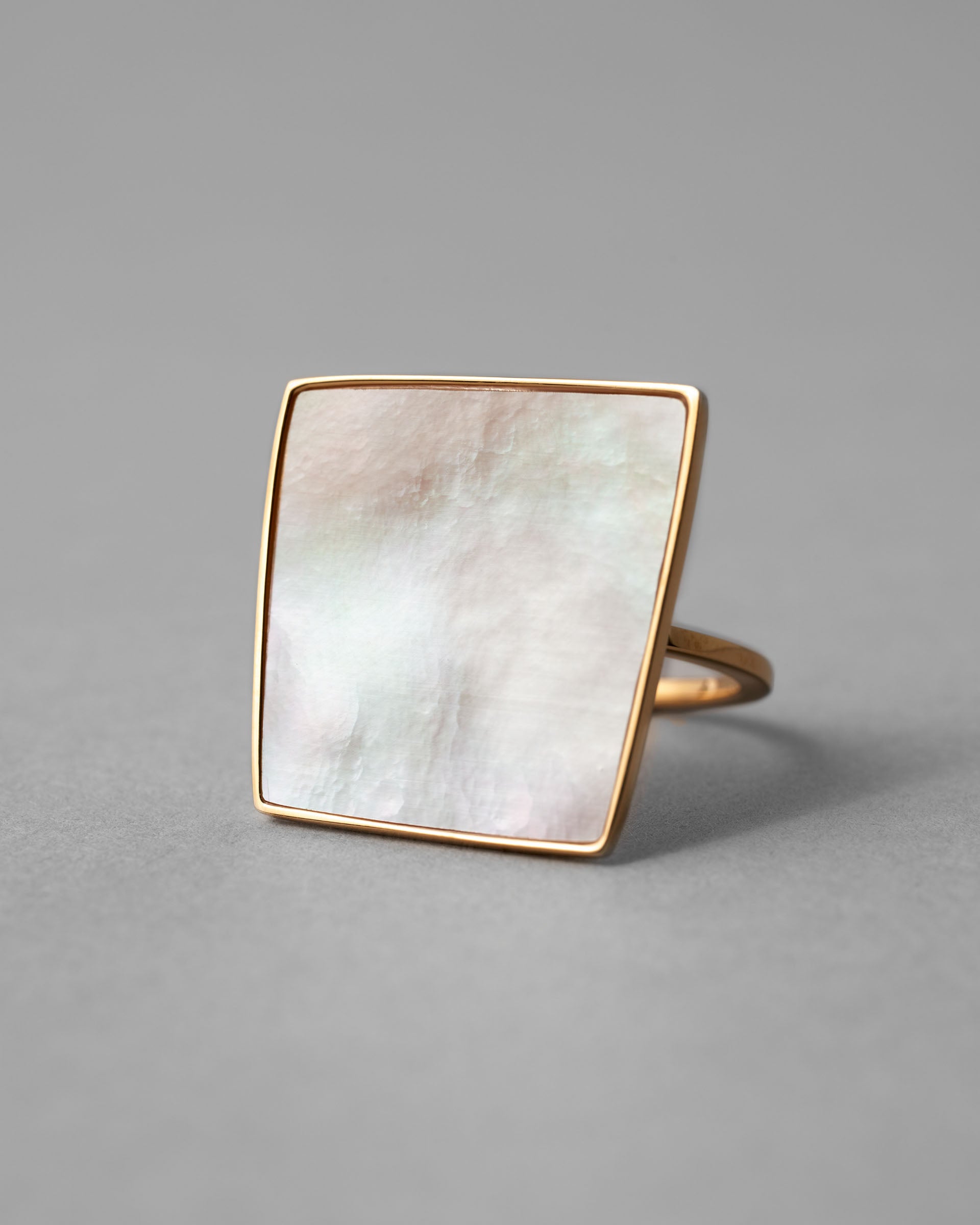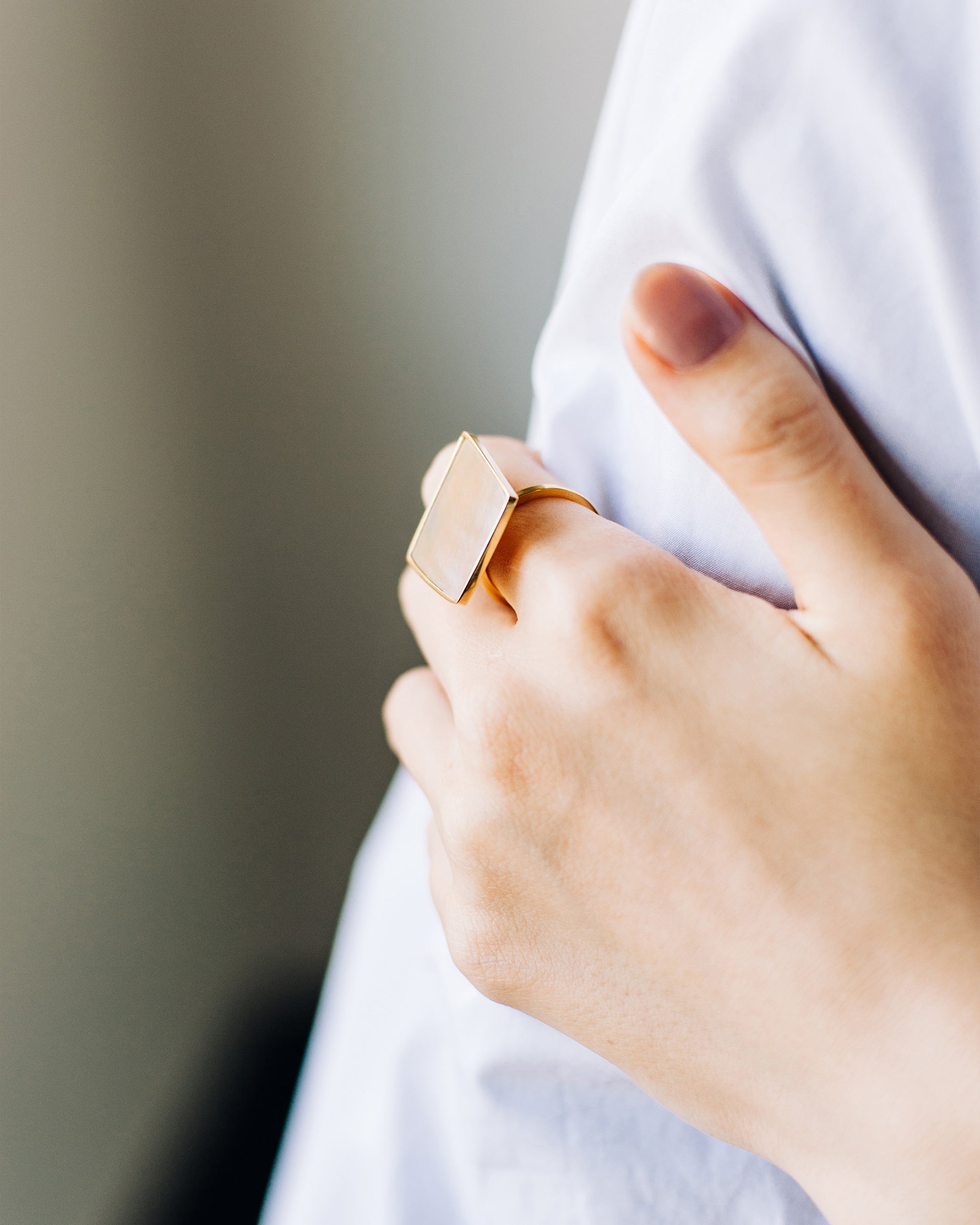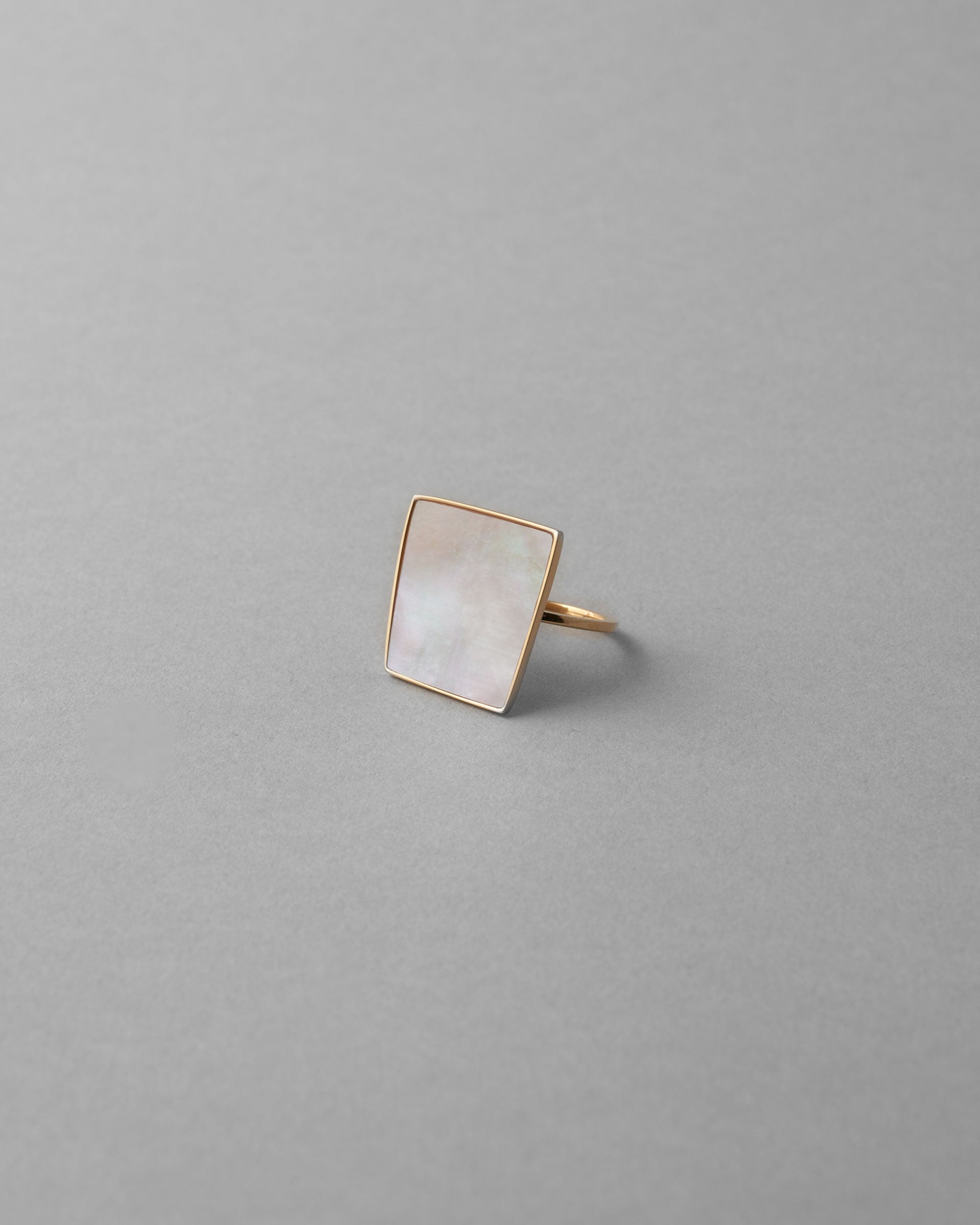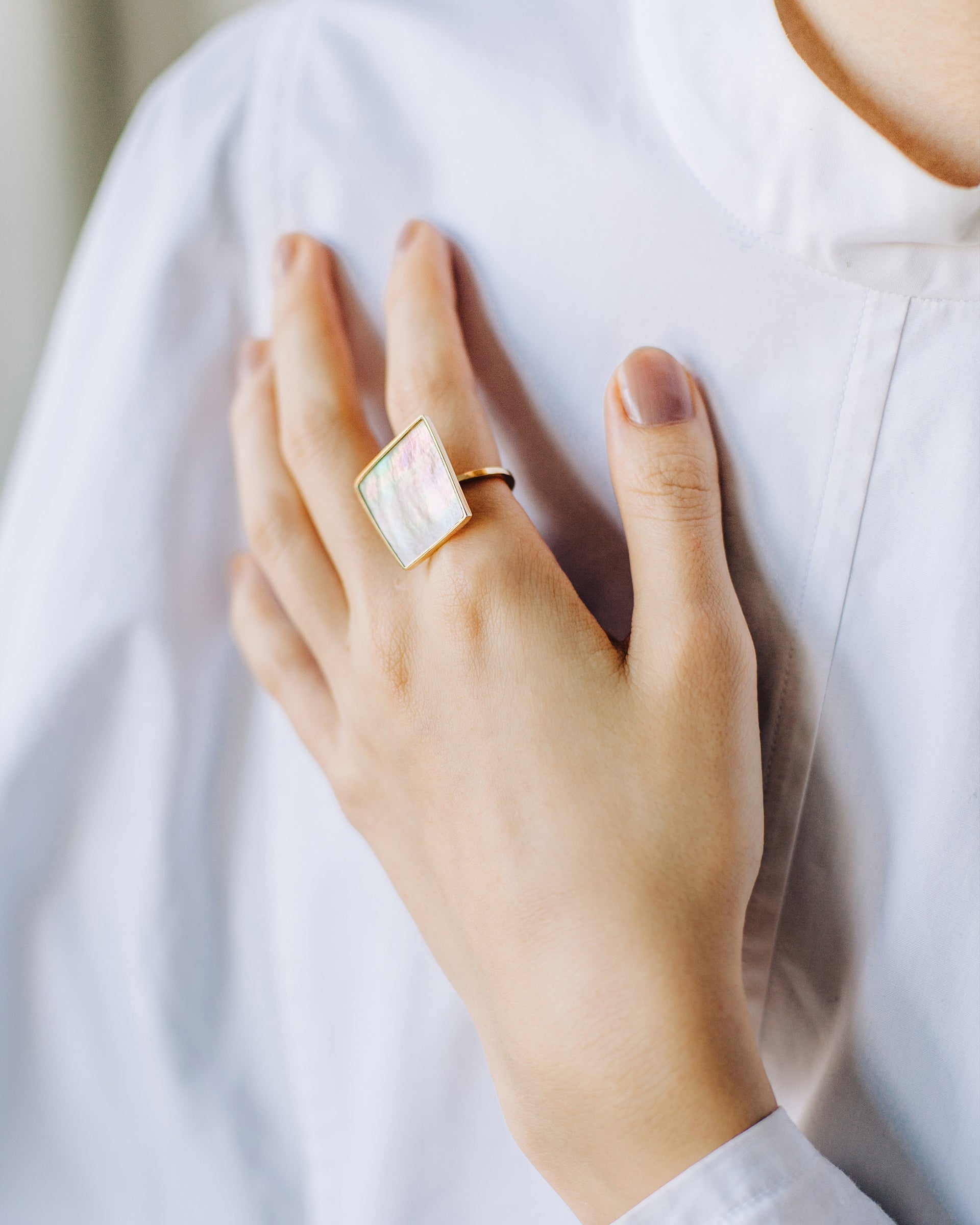 指先に羽が舞い降りたような、薄く軽やかな〈Ring Square〉。リングのアームに少し高さがあるため、まるで羽が浮遊しているような印象です。