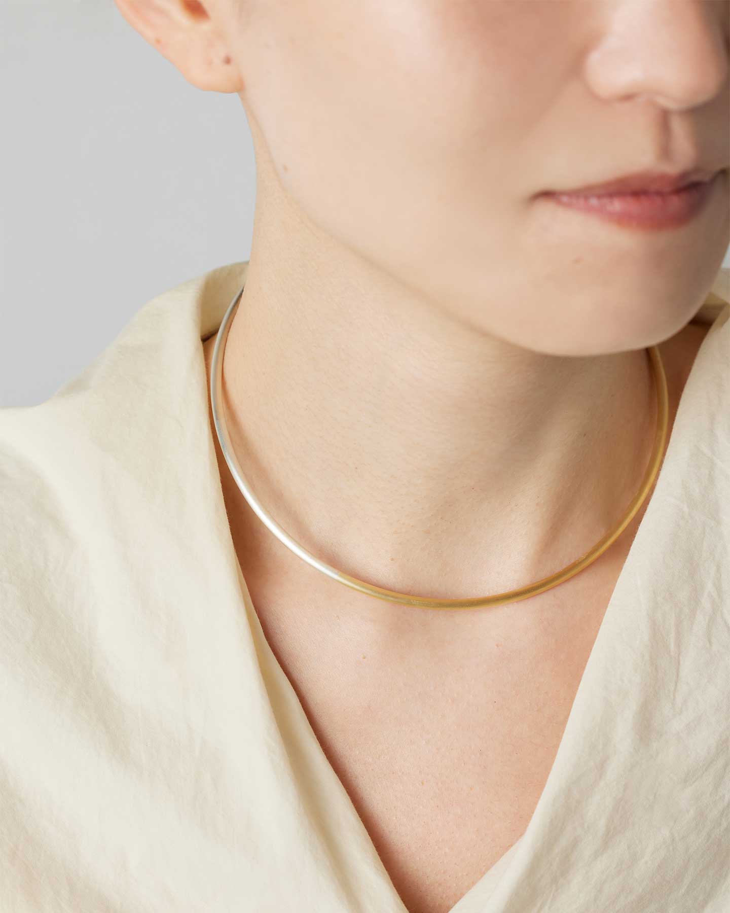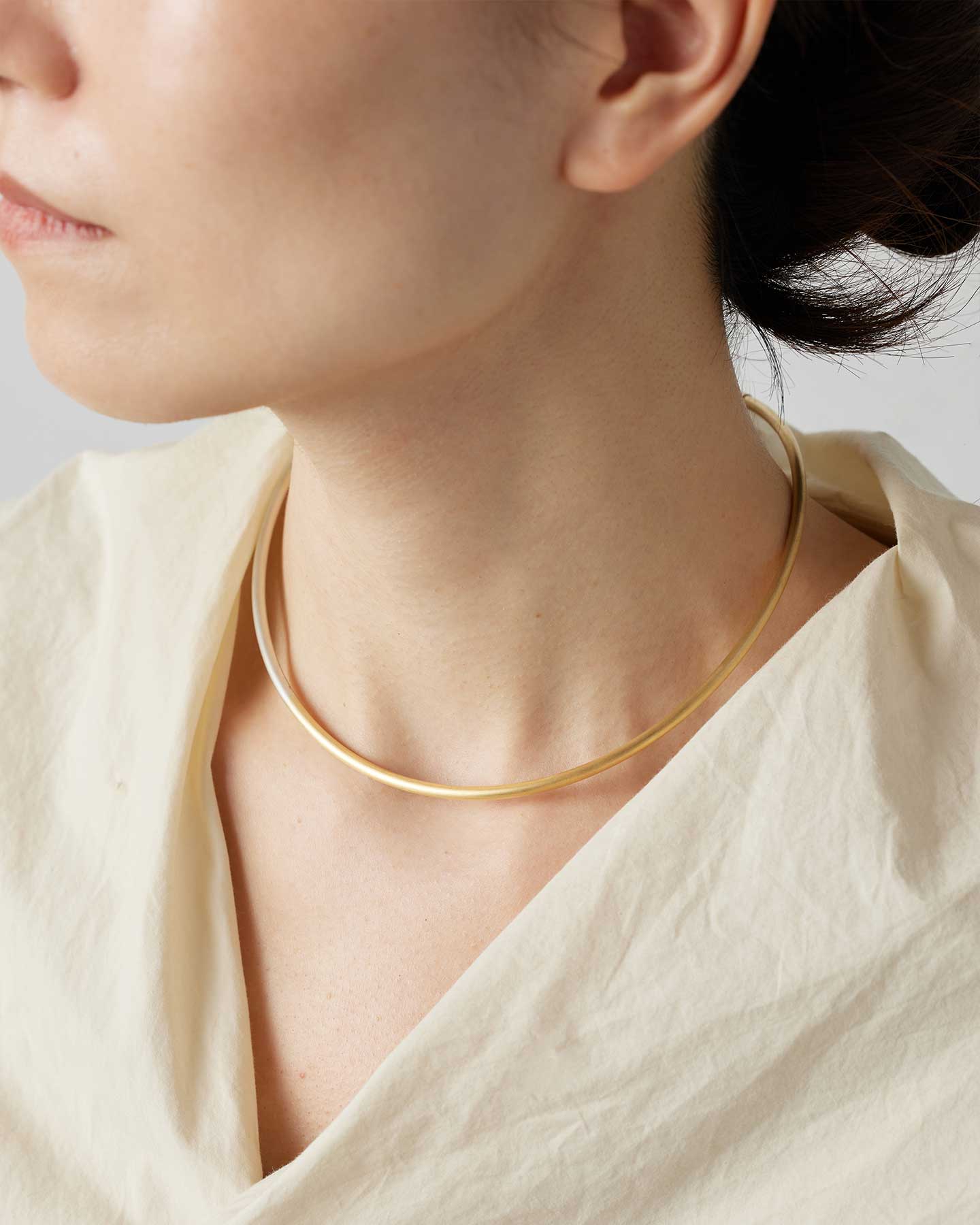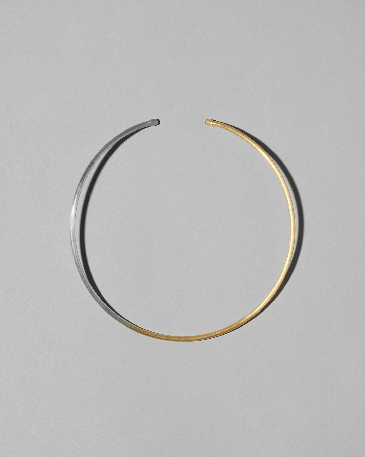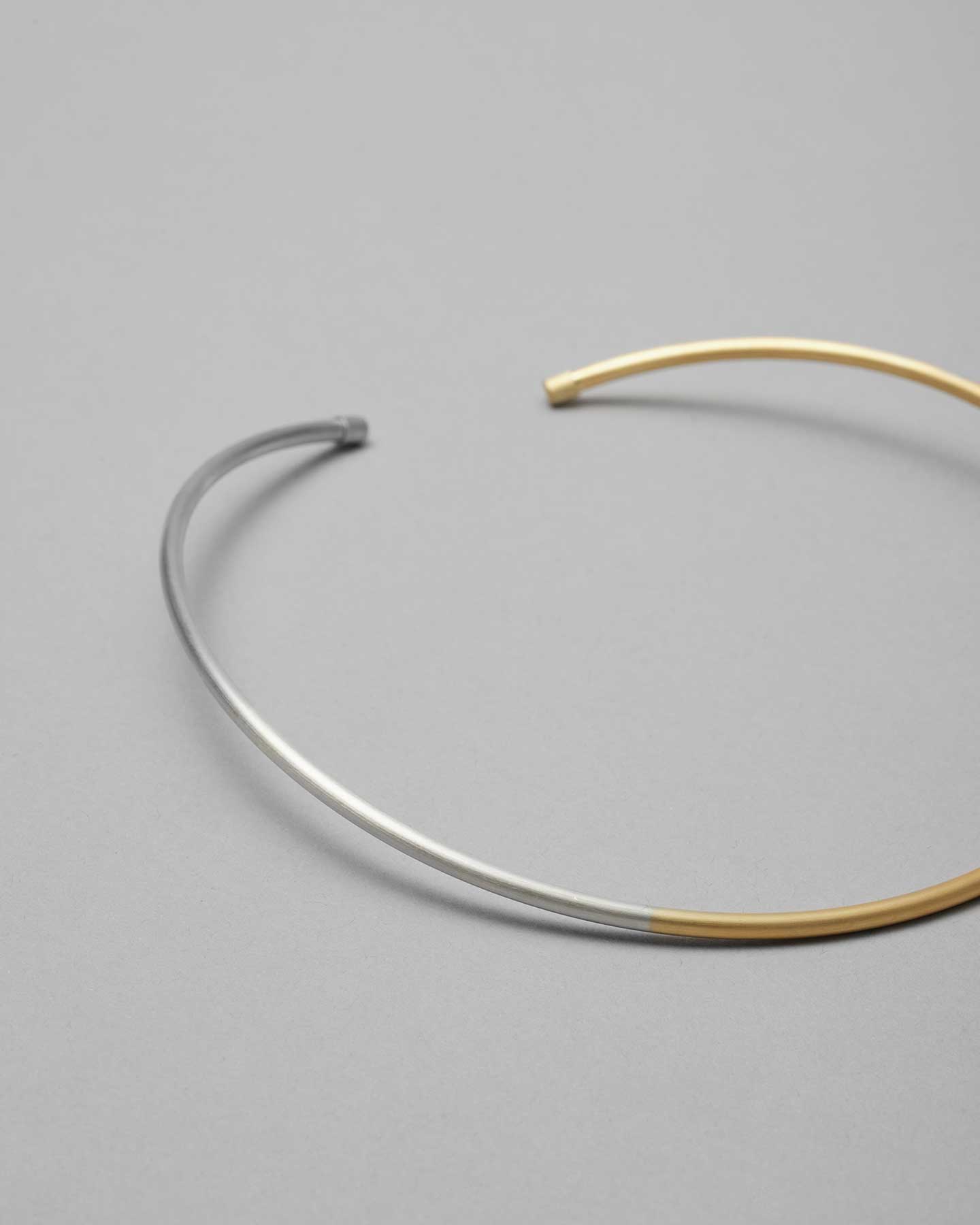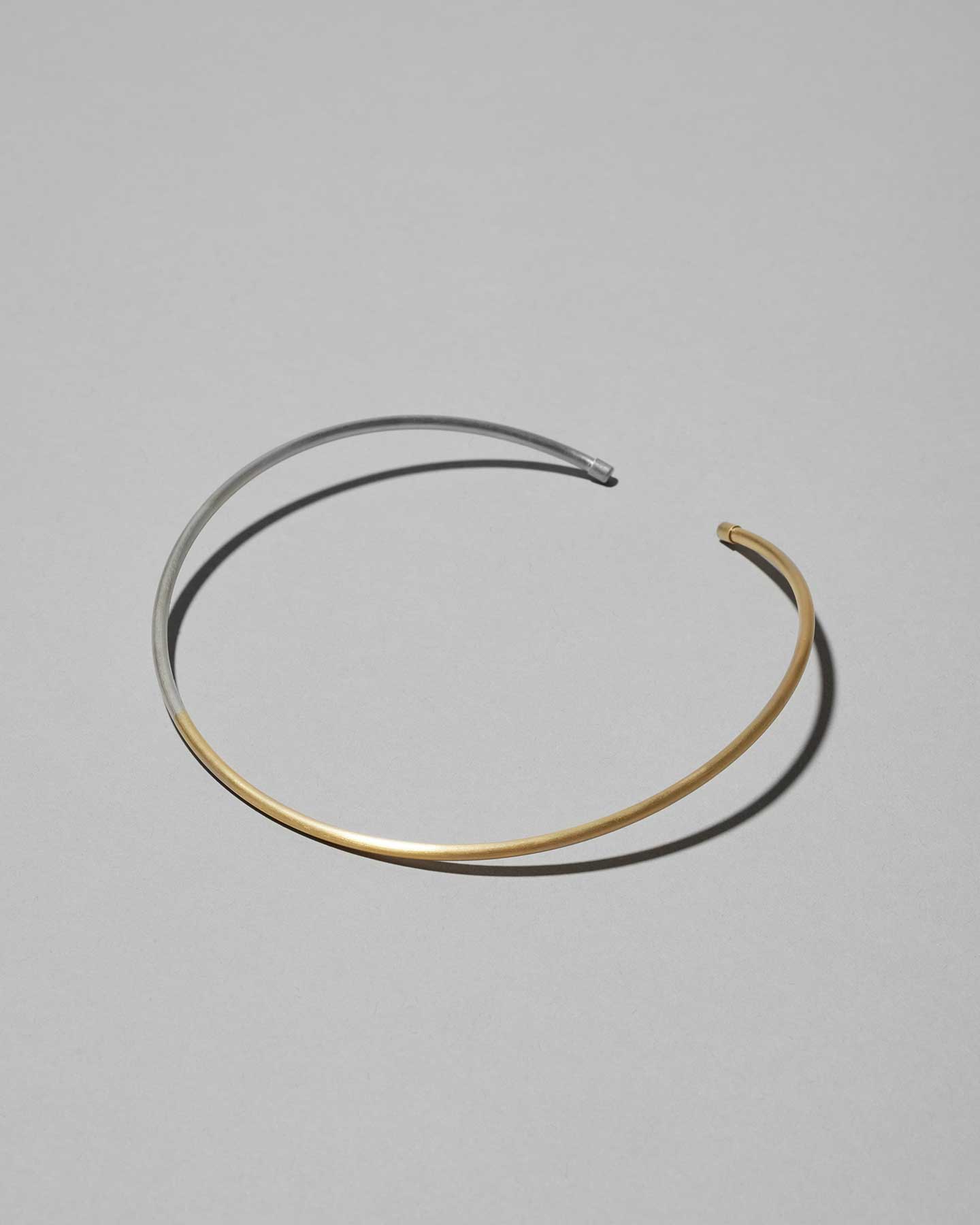 アシンメトリーにゴールド色とシルバー色が配色されたコンテンポラリーな印象のチョーカー。ヘアライン仕上げで、どんなスタイルもシックに引き立てます。軽量なSV925のパイプ素材と、首元へ沿うフォルムにより、付け心地の良さにも優れています。