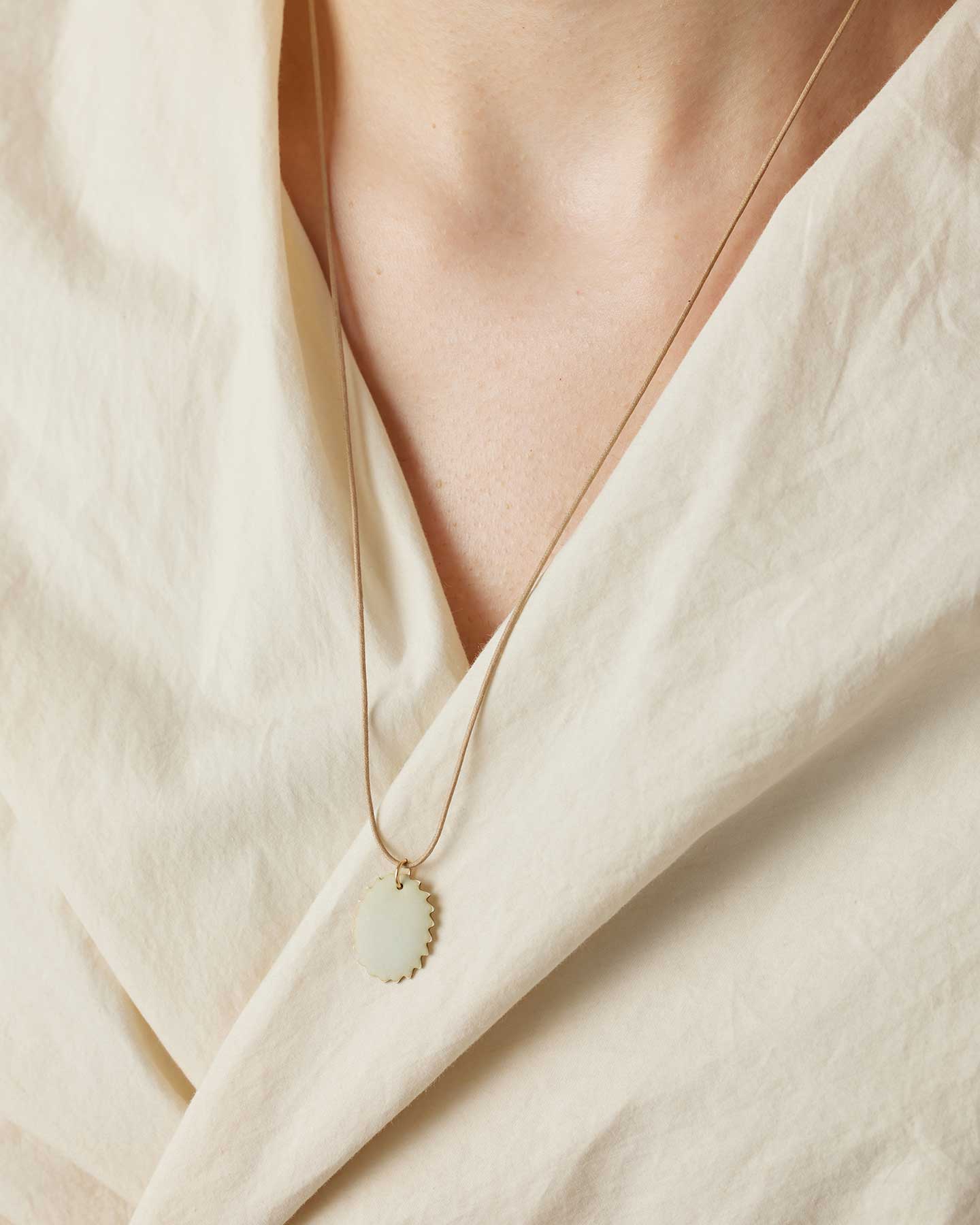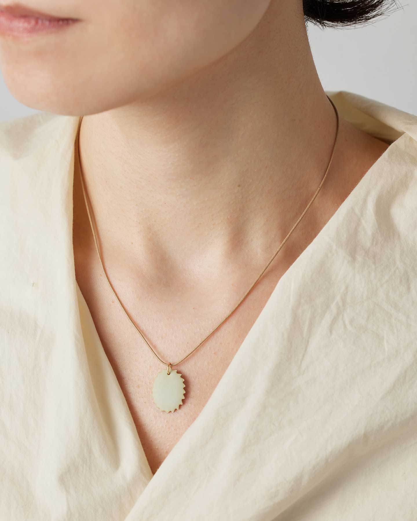 奥行きを感じる優しいオフホワイトは、七宝では珍しいマット仕上げを表面に施し、温かみを感じる素材感が特徴です。シルバーの縁取りが揺れるたびに煌めき、エスプリのきいたデザインが装いのアクセントに。