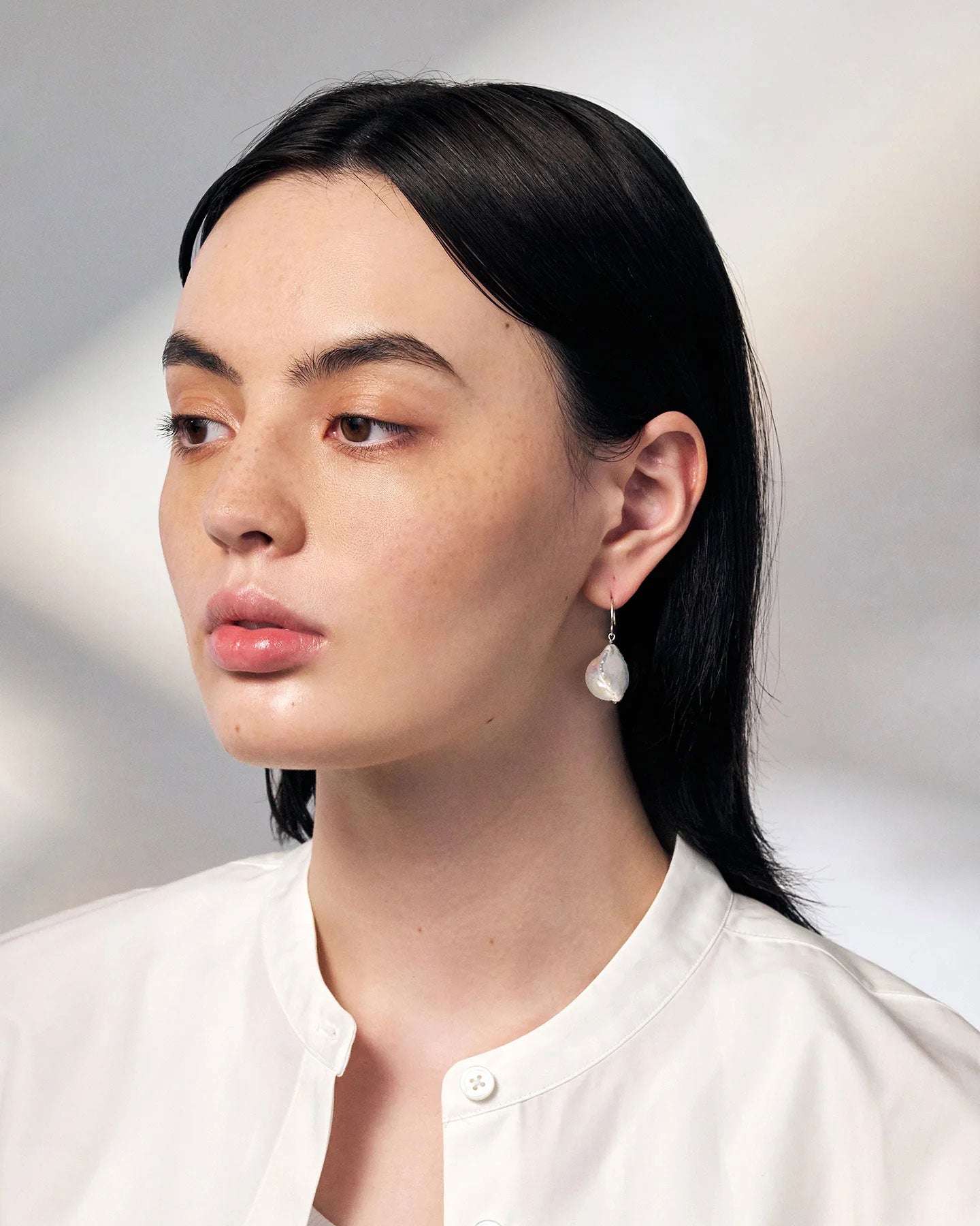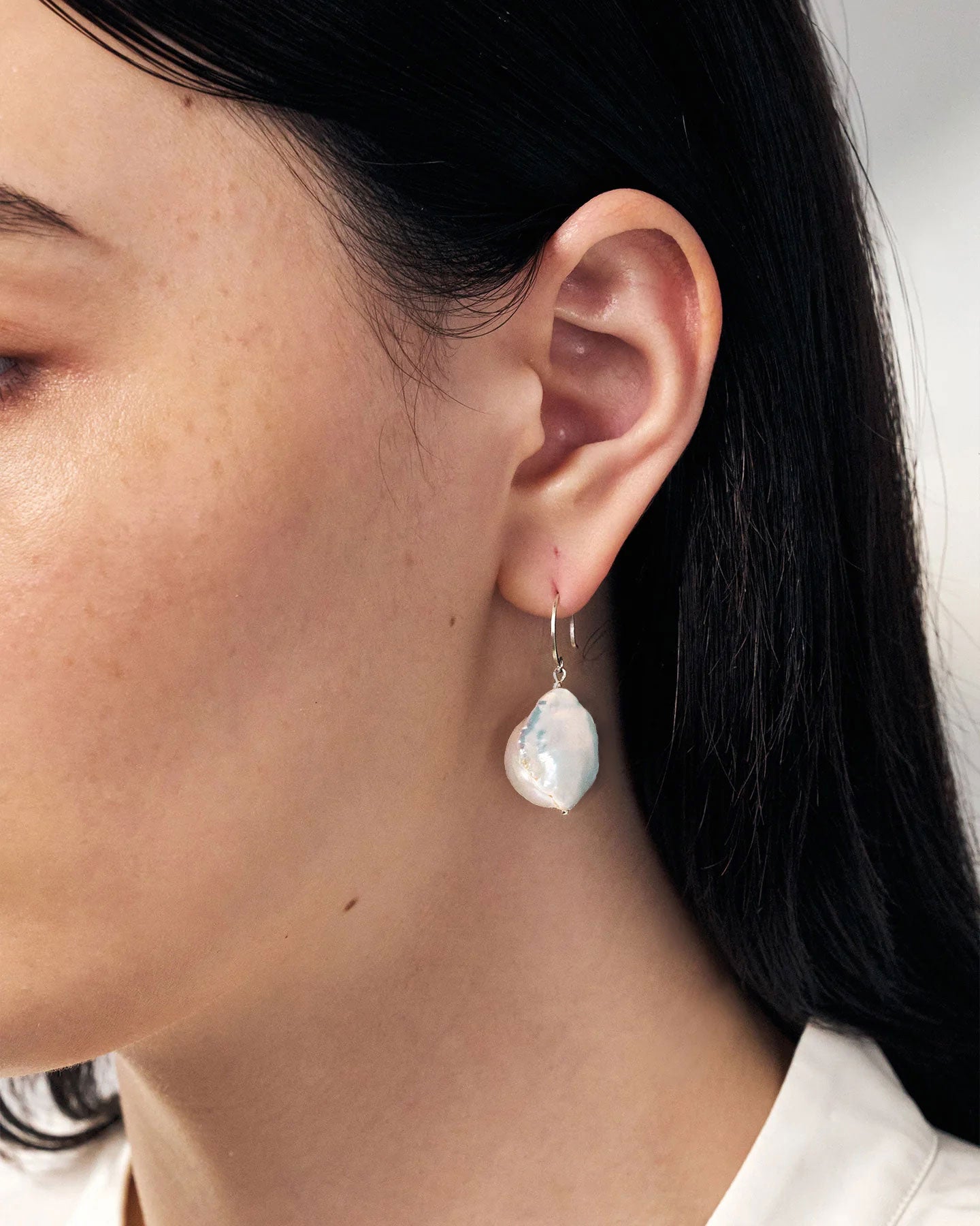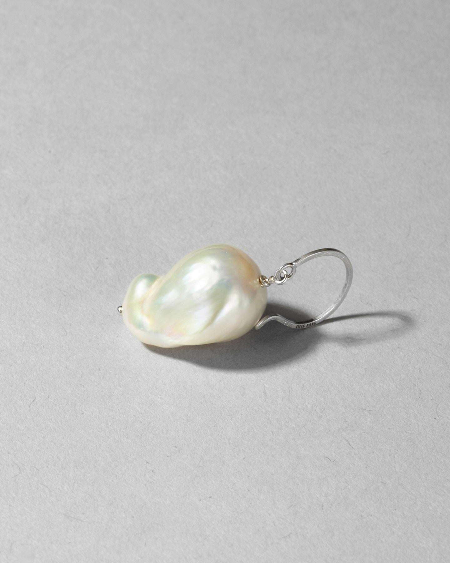 パールの優美な艶とシルバーの上品な輝きが華やかな「イヤリング ムーア」。大胆なバロックパールのフォルムが風に靡いている姿を想起させます。